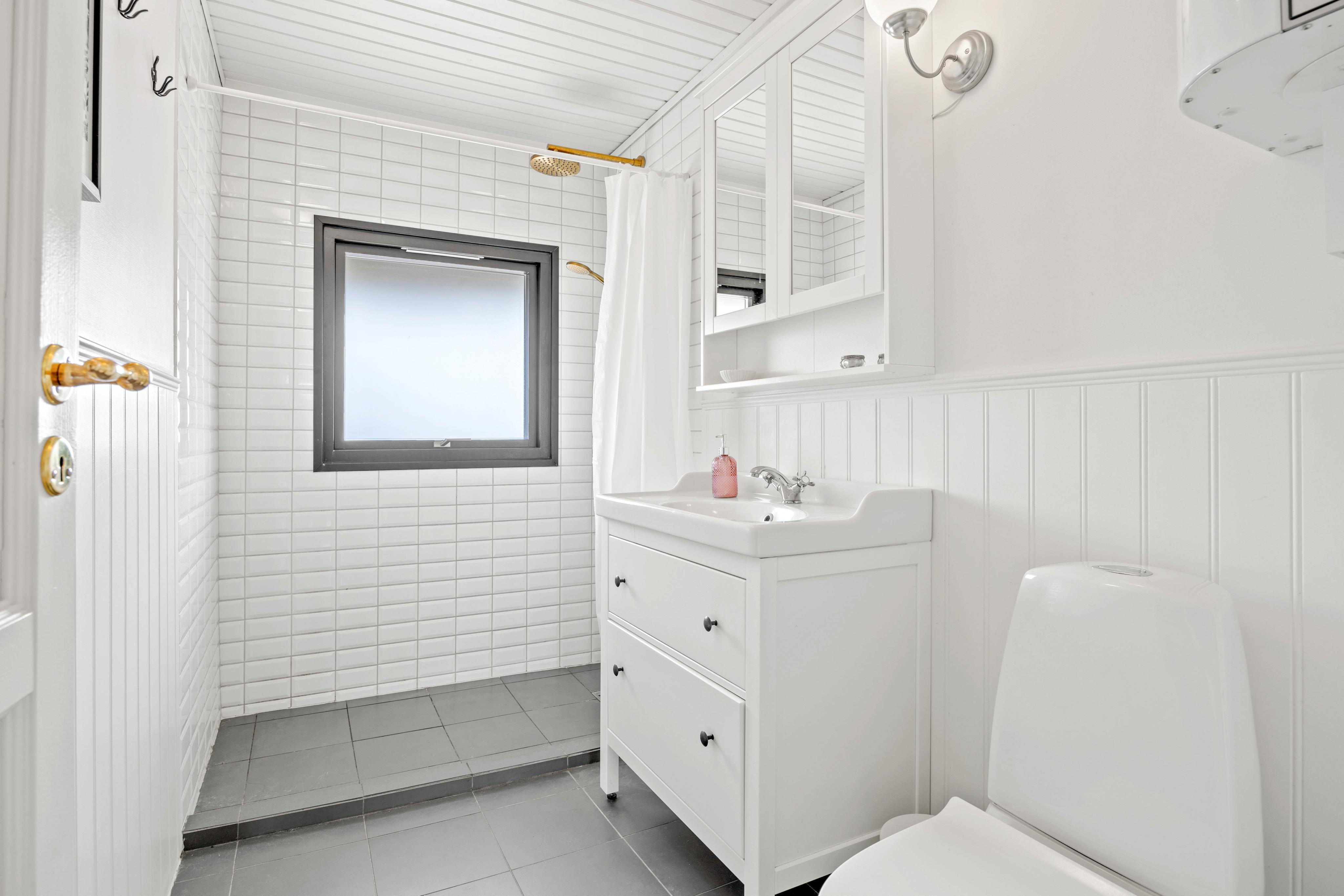 På badeværelset er der gulvvarme, og der er desuden en vaskemaskine i sommerhuset, så I kan få frisket jeres håndklæder op i løbet af ferien.