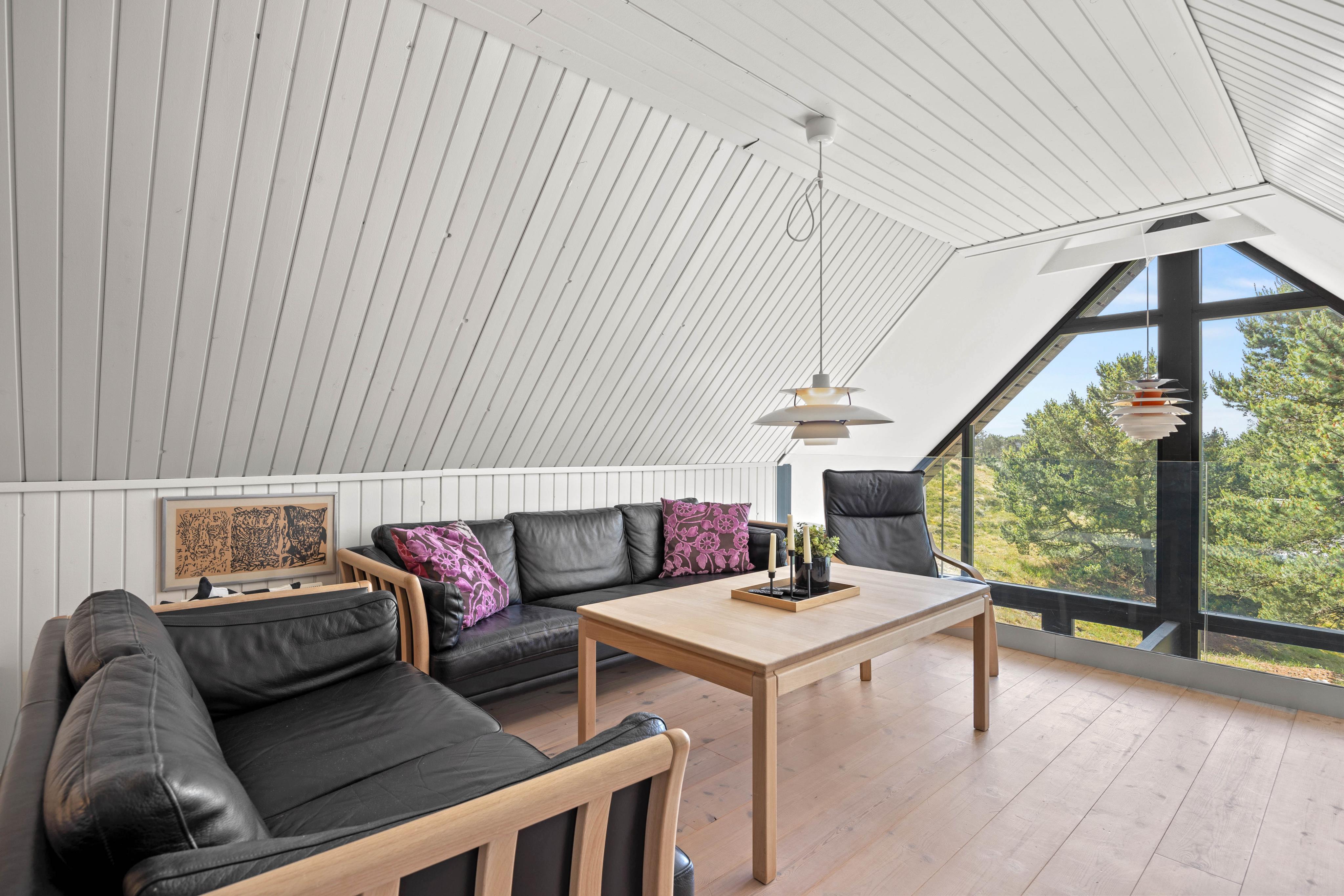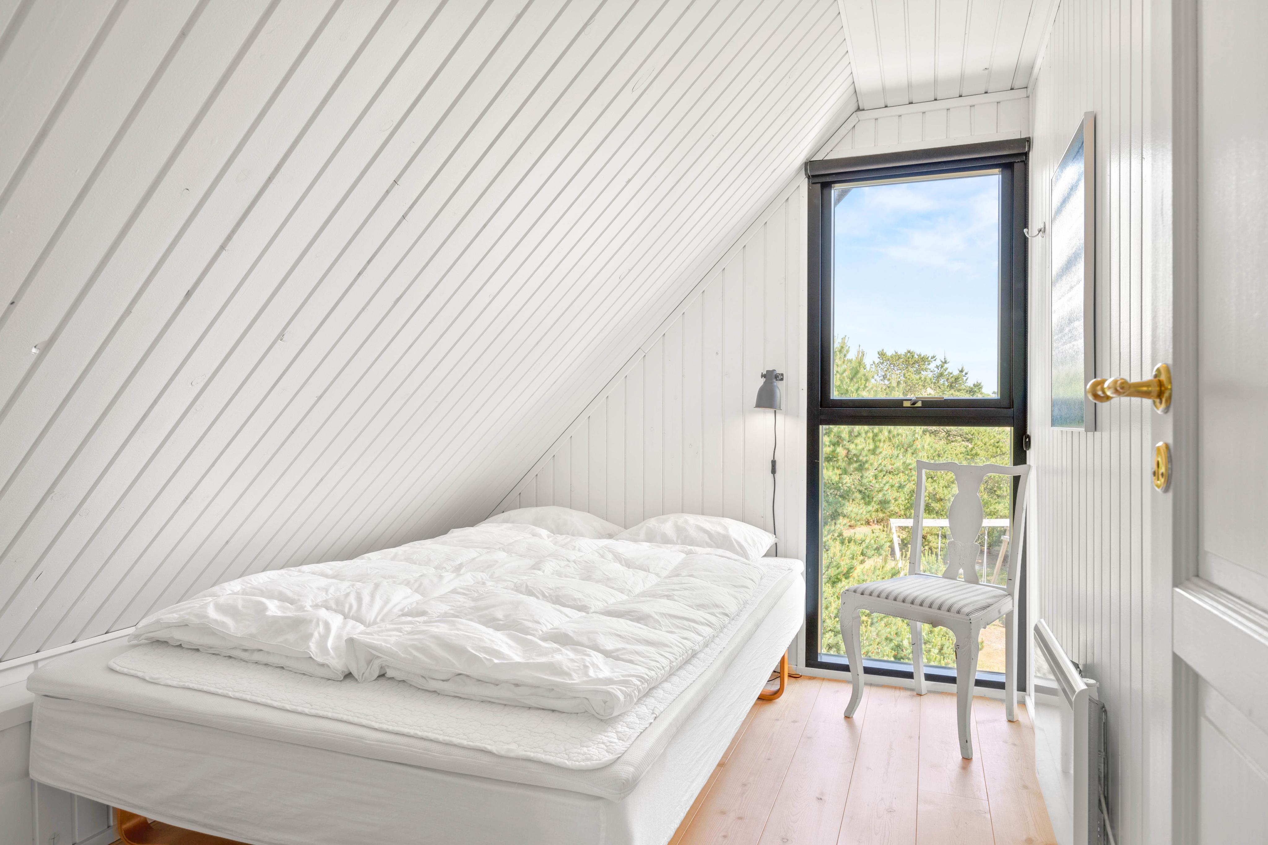 Sommerhusets 114 m² fordeler sig på 2 plan, hvoraf der er 2 soveværelser på hver etage. Der er 2 soveværelser med dobbeltsenge, et soveværelse med 2 enkeltsenge samt et soveværelse med en køjeseng. På førstesalen finder I en ekstra stue, hvorfra I også har en skøn udsigt over området.