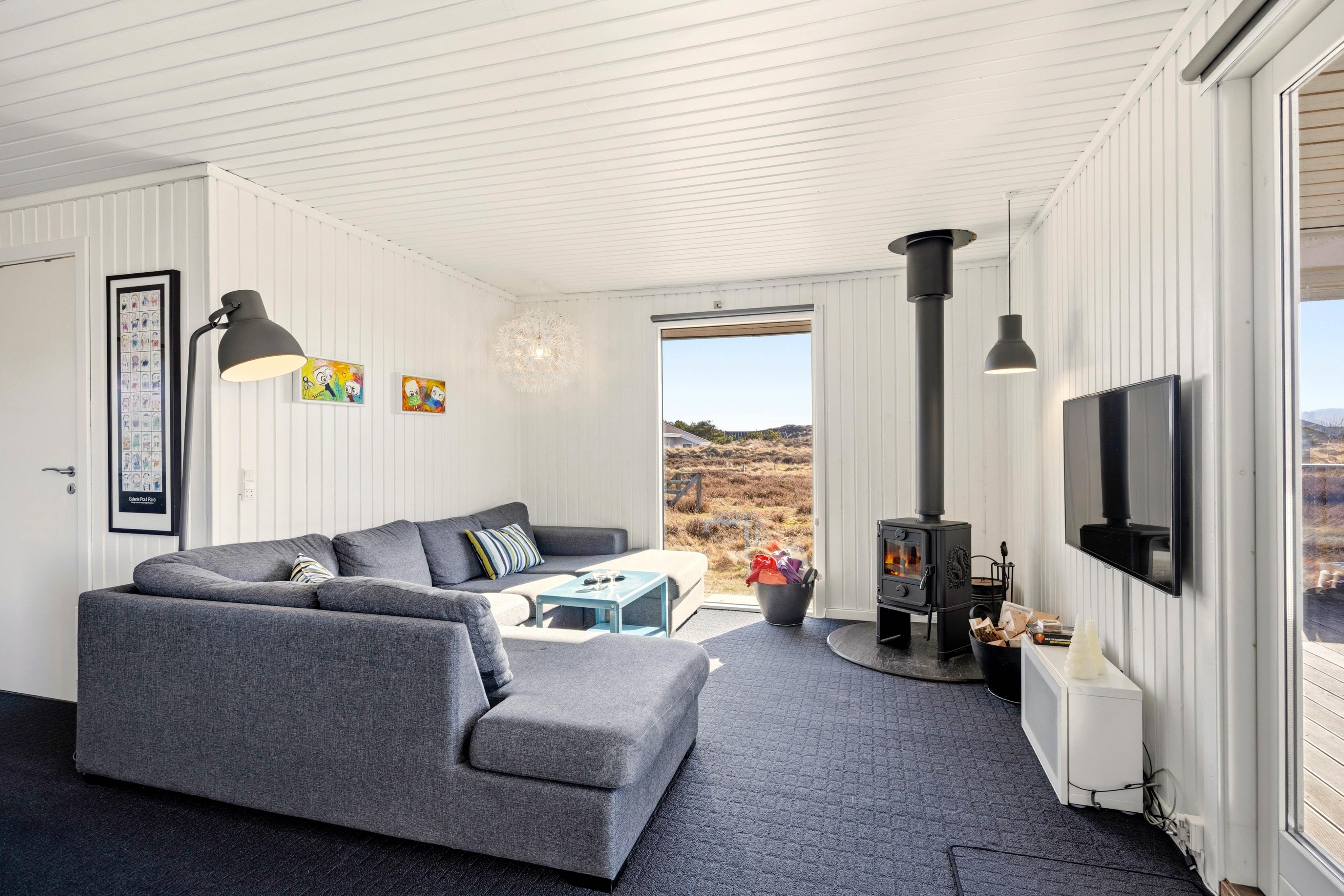 Dette hyggelige feriehus har en lys og indbydende atmosfære, hvor I hurtigt kan føle jer hjemme. Det åbne opholdsrum udstråler en lys og indbydende atmosfære takket være de store vinduer, som lukker masser af naturligt lys ind. De smagfulde møbler med en behagelig sofa og en varmende pejs skaber et hyggeligt sted, hvor I kan læne jer tilbage og nyde jeres tid sammen. Her flyder stue, spiseplads og køkken sammen og skaber et socialt miljø – perfekt til familielivet.