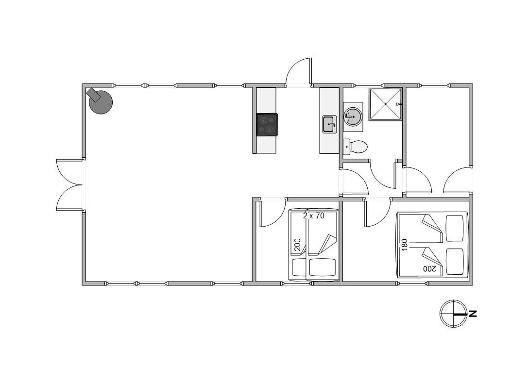 I alt indeholder feriehuset 2 soveværelser – det ene med en dobbeltseng, der tilbyder en god nats søvn, og det andet med en køjeseng, der er ideel til børn eller medrejsende venner. Så har alle 4 personer tilstrækkelig plads og privatliv. Et funktionelt badeværelse med bruser fuldender den praktiske indretning.