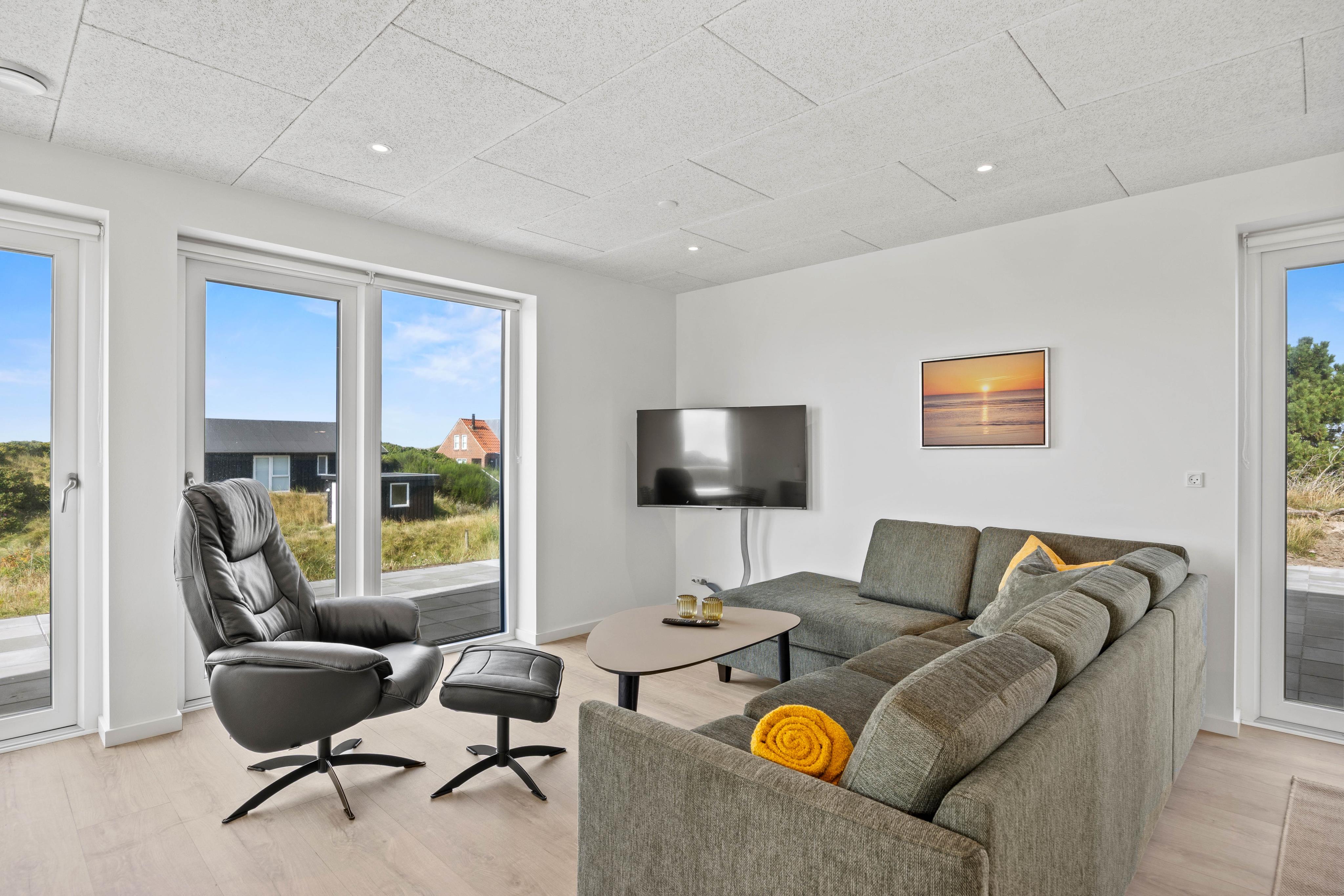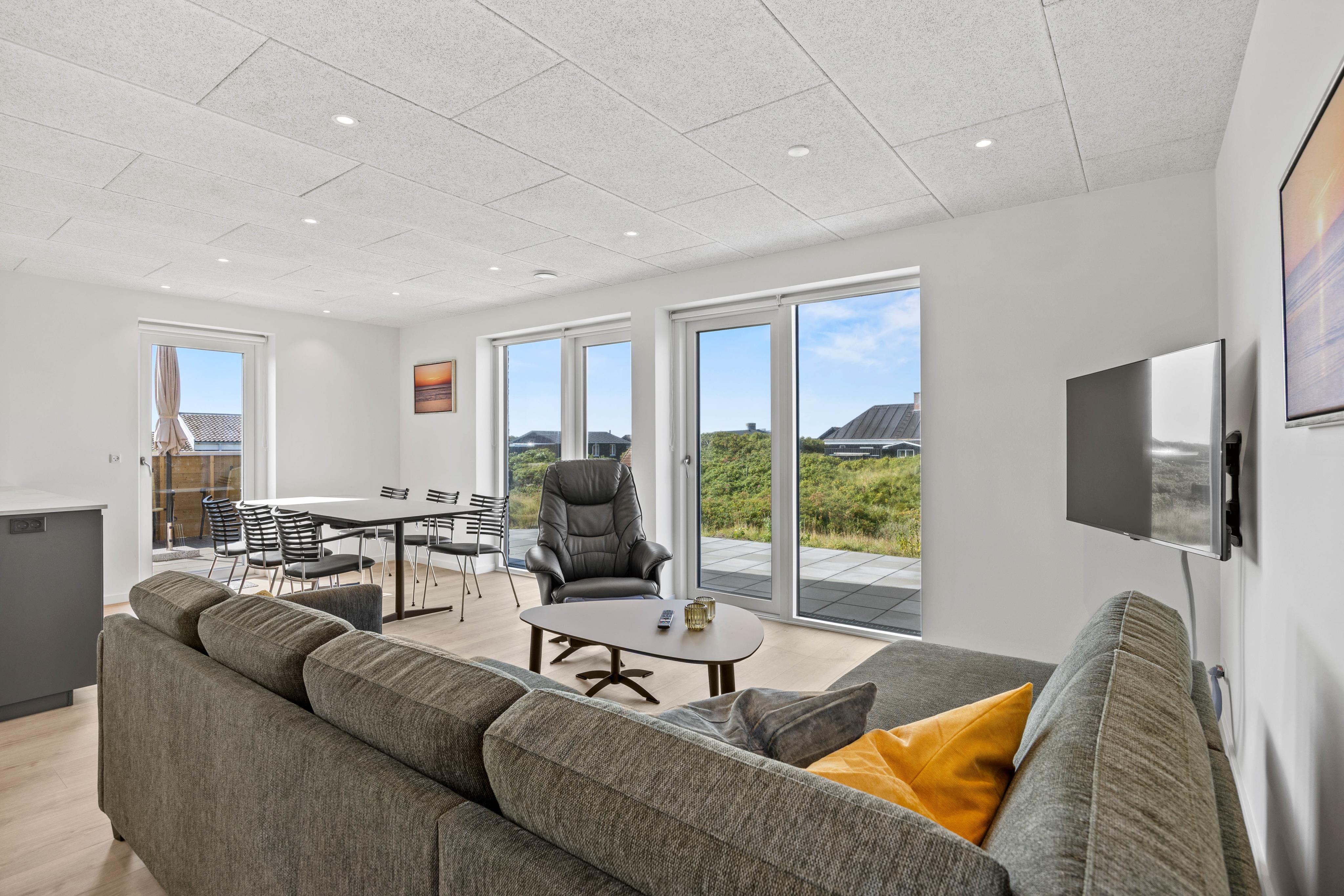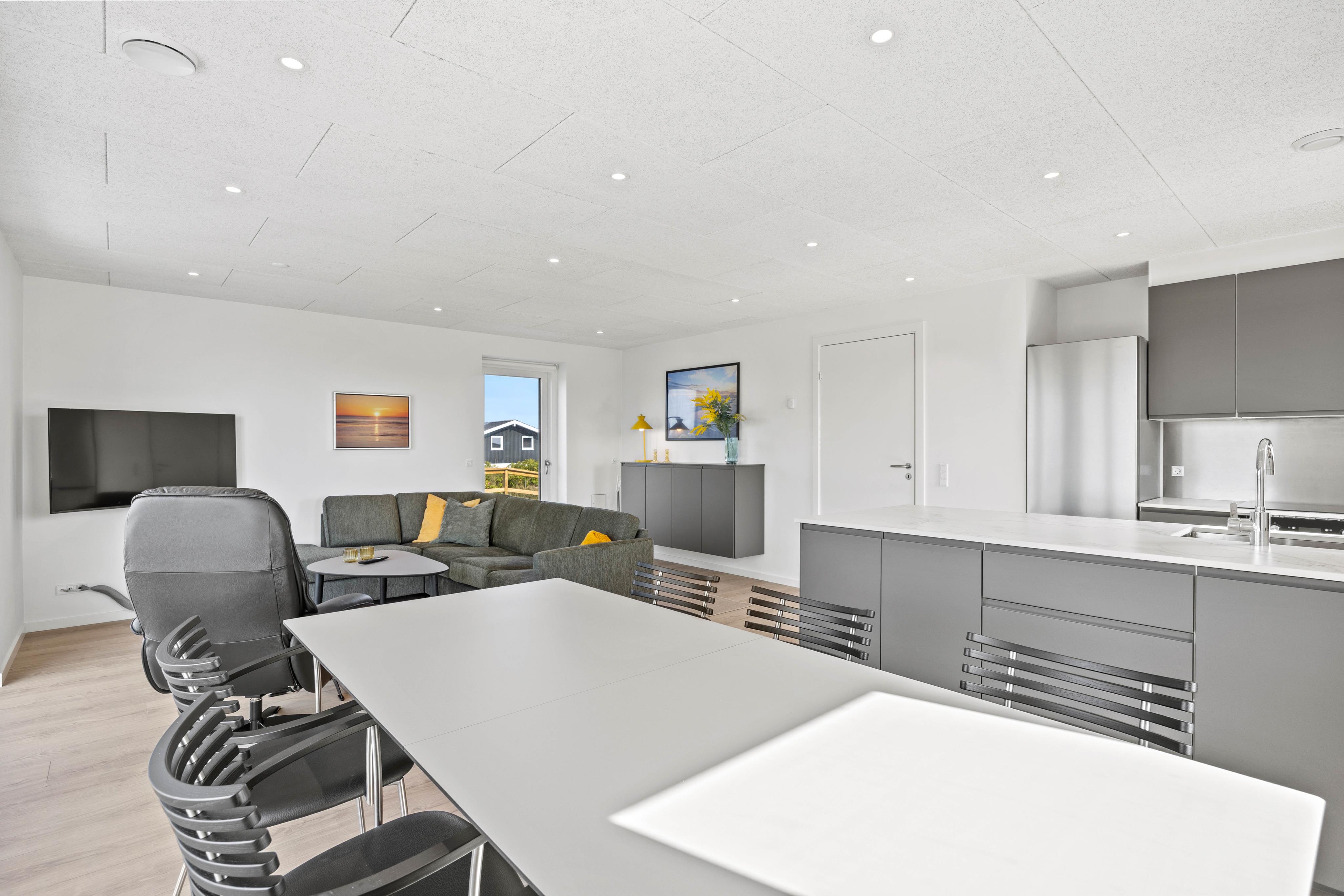 I den store opholds- og spisestue har I masser af plads til at være sammen og nyde ferielivet. Indretningen er lys, moderne og funktionel, så I straks føler jer hjemme. Da der både i stueetagen og på første sal er en opholdsstue, kan hver person finde sit helt eget yndlingshjørne – hvad enten I samles til hyggelige stunder eller trækker jer tilbage for et roligt øjeblik alene.