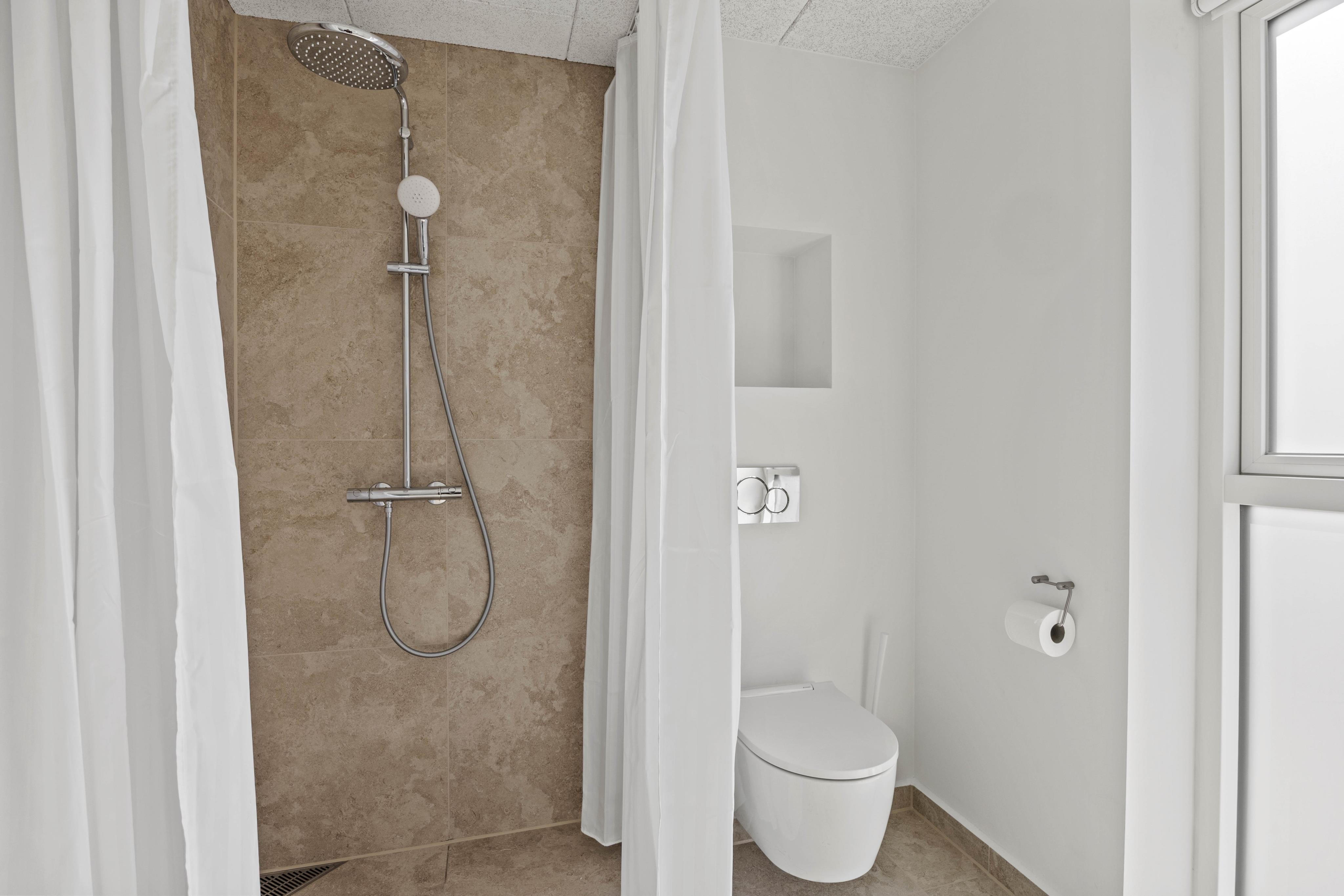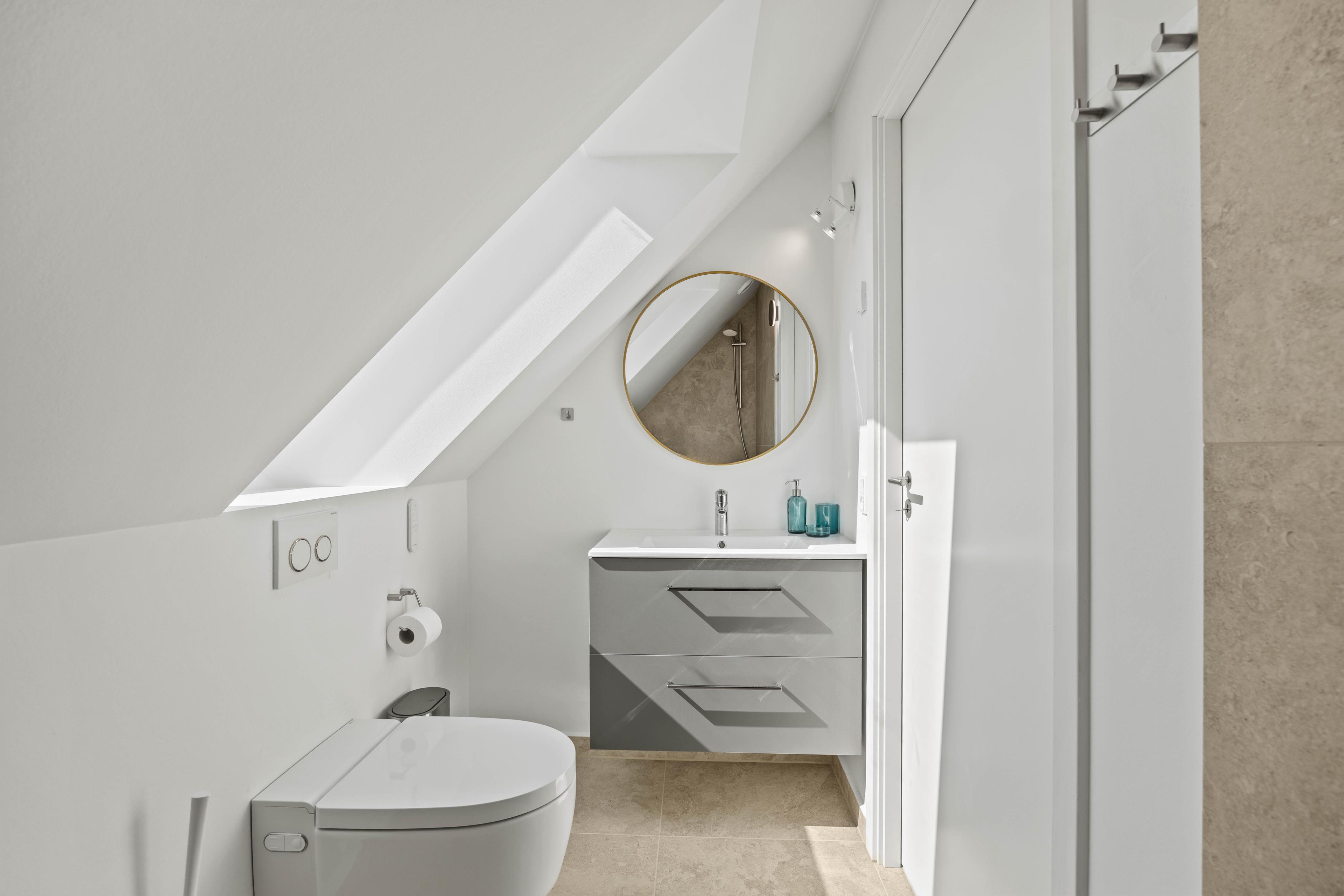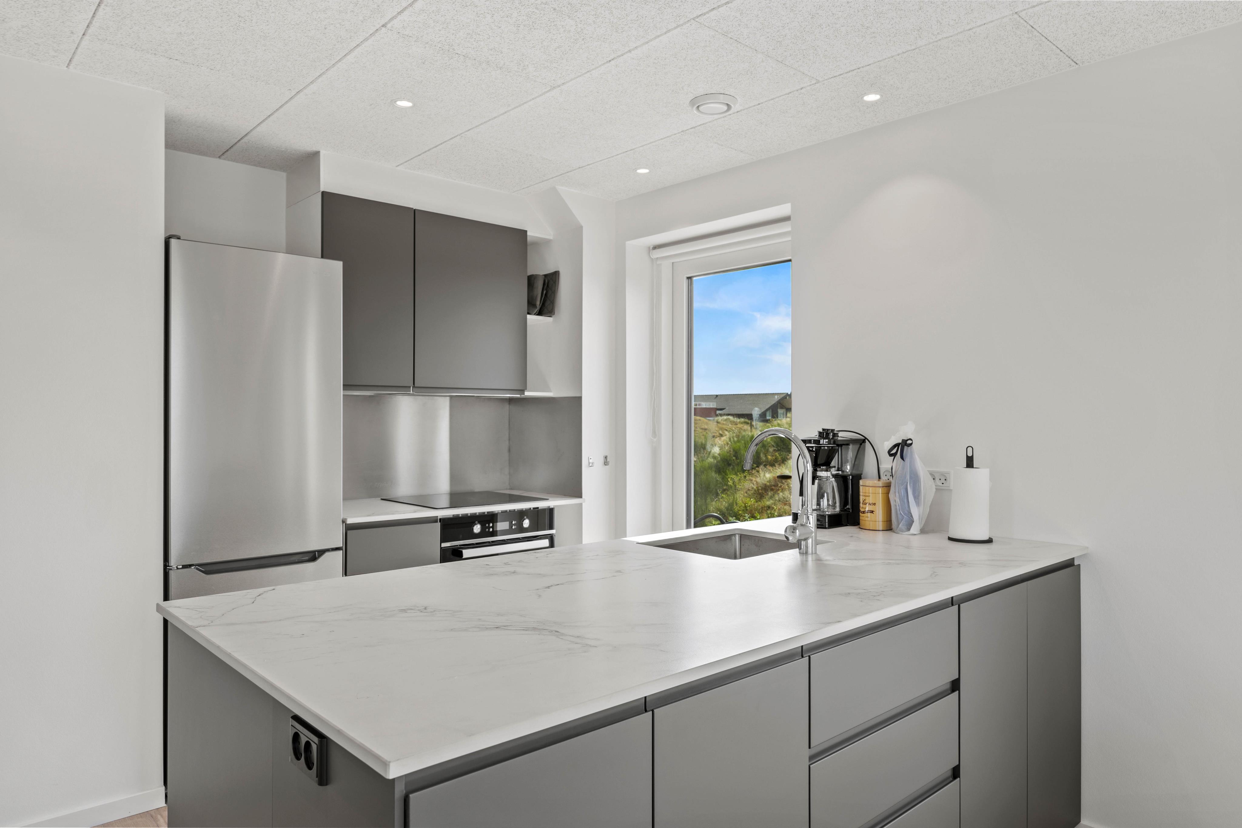 Det åbne køkken er fuldt udstyret og gør madlavningen til en fornøjelse. En opvaskemaskine sørger for, at oprydningen hurtigt er overstået, og med tre badeværelser er der god plads til alle.