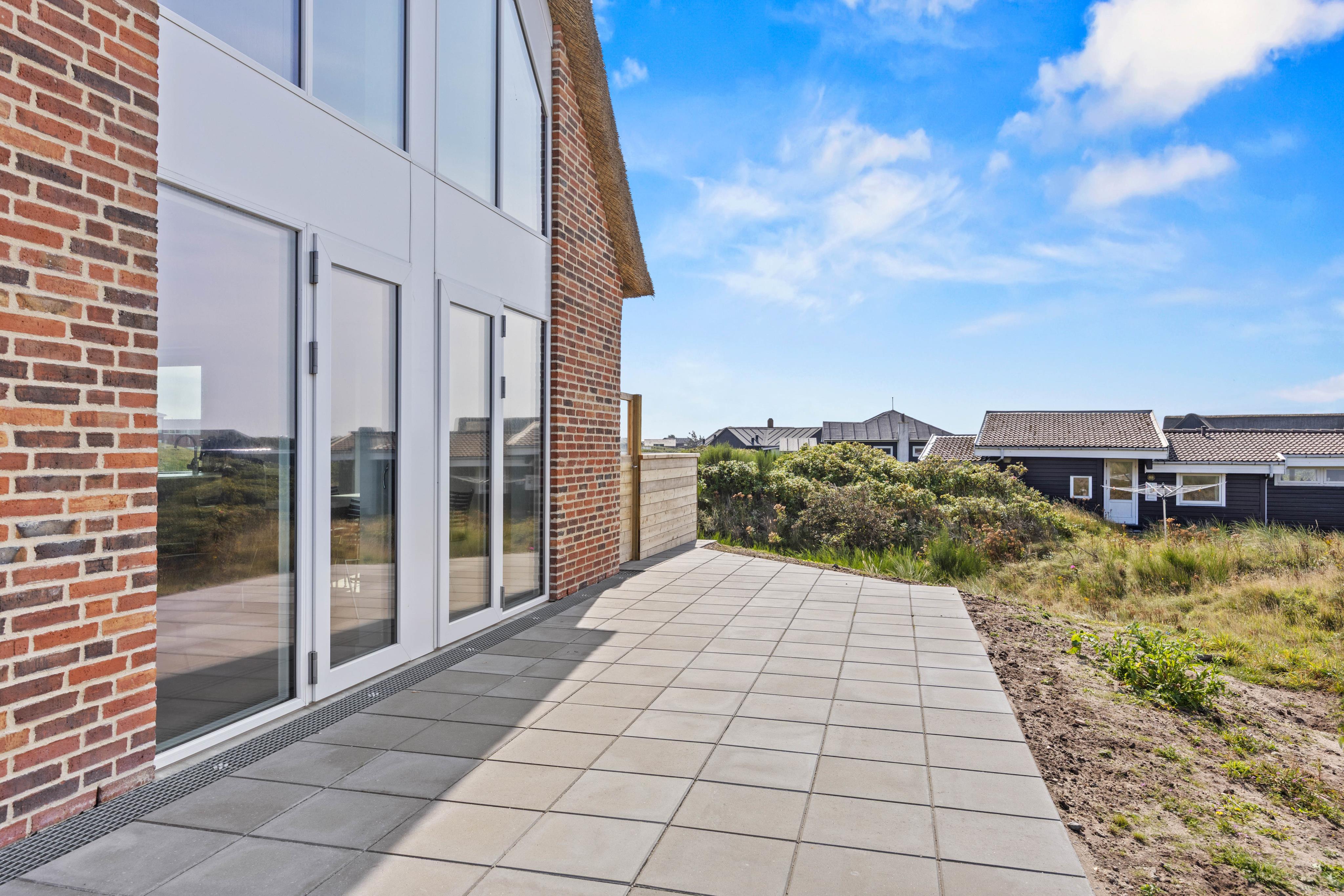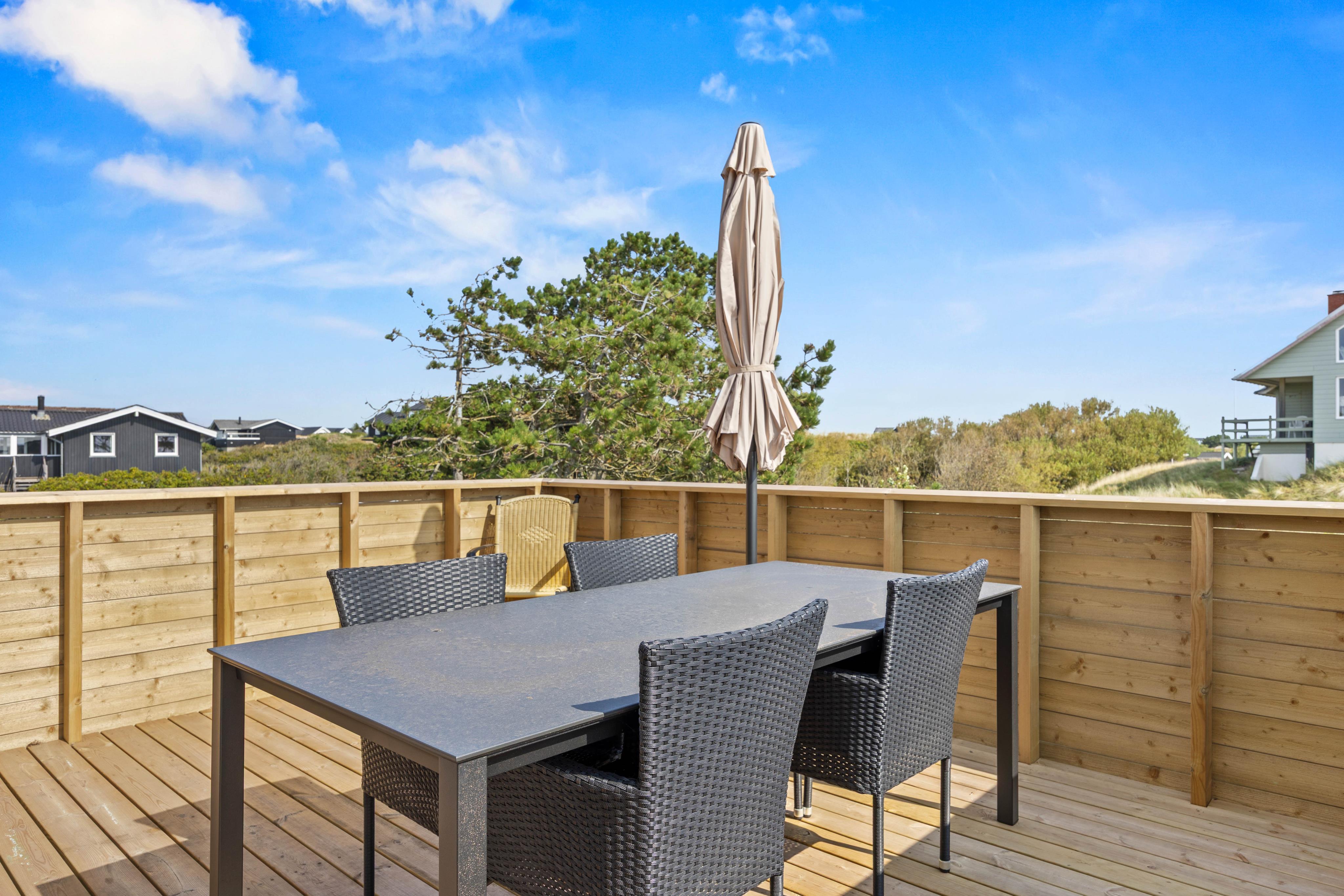 Rundt om feriehuset indbyder den åbne terrasse med havemøbler og liggestole til afslapning i den friske havluft. Her kan I nyde solen, mens jeres hund finder sit eget hjørne på grunden. På blot 200 meter står I med fødderne i sandet på den brede strand i Rindby, hvor der er rig mulighed for gåture, badeture og skønne timer ved havet.
