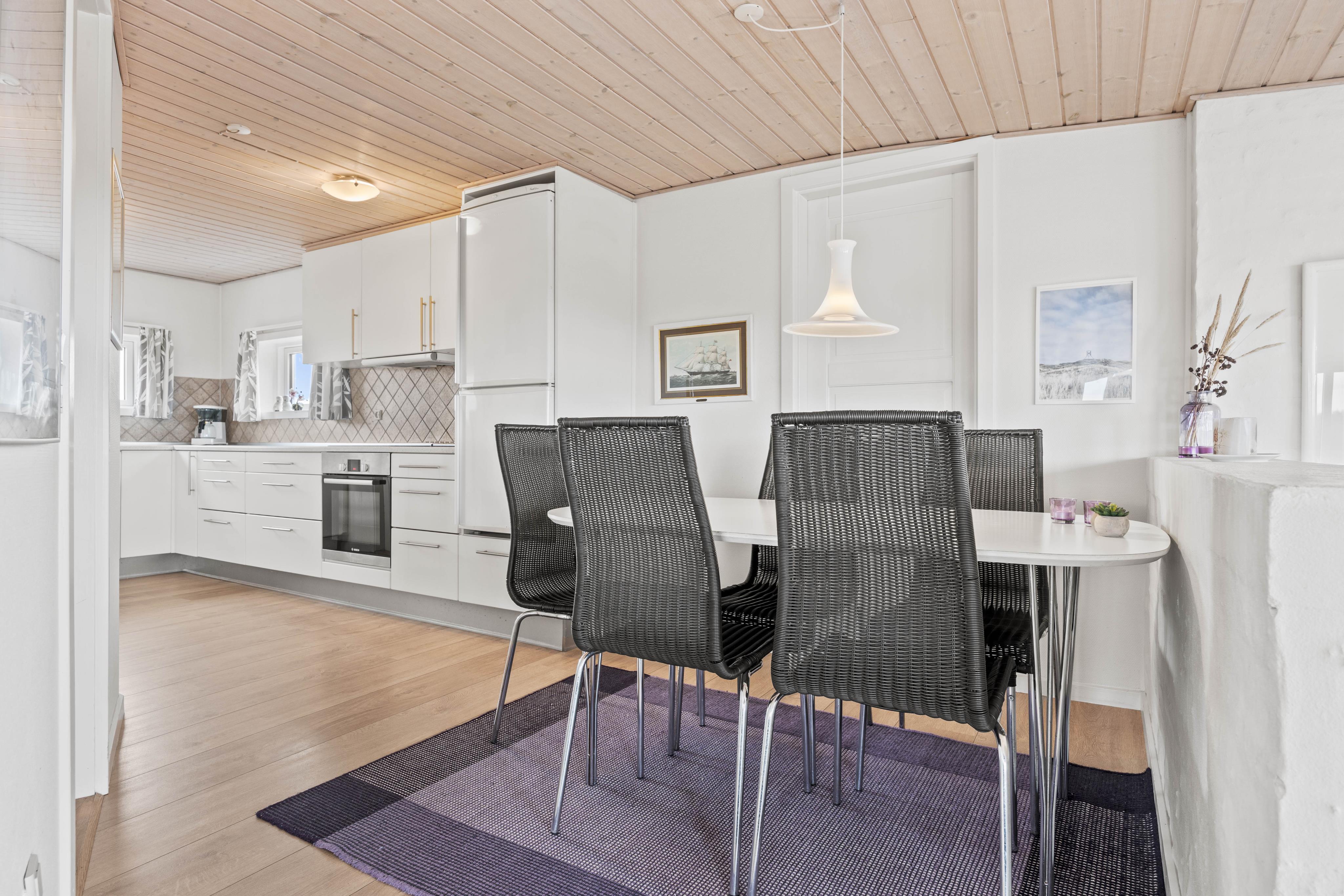 I stuen finder I den hyggelige brændeovn, som skaber en stemningsfuld atmosfære på de kølige aftener, mens luft-til-luft varmepumpen sikrer en behagelig temperatur året rundt. Køkkenet indeholder alt, hvad I skal bruge for at tilberede lækre hjemmelavede måltider, herunder induktionskomfur og opvaskemaskine. Badeværelset har gulvvarme, og der er både vaskemaskine og tørretumbler til jeres rådighed, så I kan opfriske garderoben i løbet af ferien.