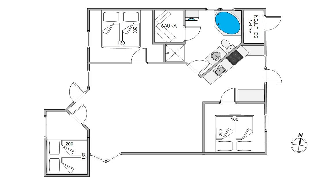 Feriehuset ligger i et klitområde og er bygget i øst-vest retning. Der er 2 terrasser. Østterrassen har en lounge og et bord med stole. Vestterrassen har et stort bord med stole og 2. Vi synes rigtig godt om rumdelingen. Der er 2 soveværelser med dobbeltsenge og et børneværelse med senge. Sengene er gode. I badeværelset er der en lille sauna og en whirlpool. Feriehuset er lyst og venligt og har en dejlig praktisk indretning. Køkkenet er også meget godt udstyret. WLAN fungerer godt, og tv-programmet har ARD, ZDF, NDR og RTL samt diverse danske, svenske og norske kanaler. Feriehuset er top og med et dansk udtryk meget hyggeligt!!!