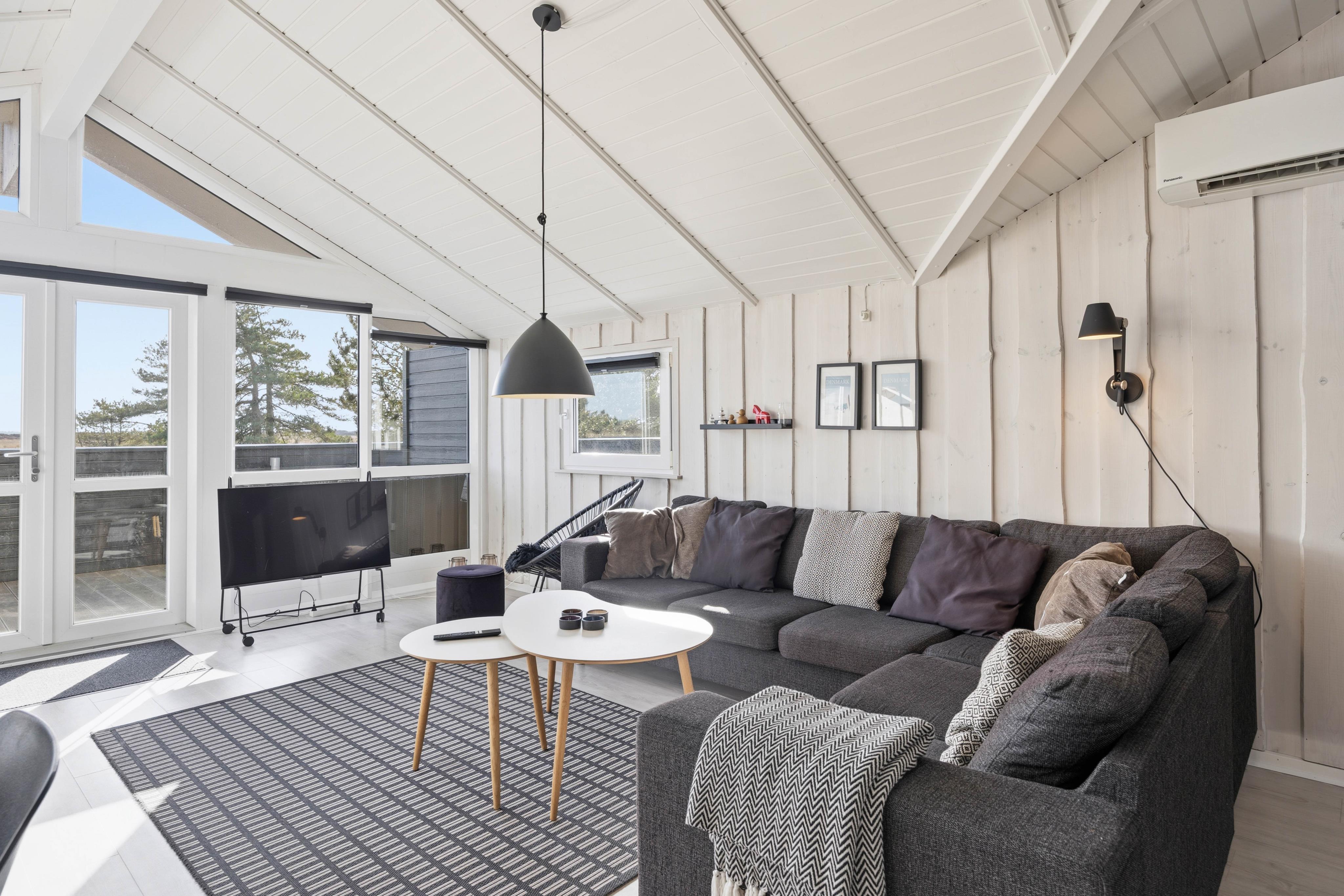 Feriehusets indbydende stue, køkken og spiseplads ligger i åben forbindelse, og her kan hele familien samles til hygge med en god film i fjernsynet eller et sjovt brætspil. Her er en rigtig hyggelig atmosfære og et godt lysindfald fra det store vinduesparti mod syd. I kan tænde op i brændeovnen, som ikke blot spreder varme, men også en ekstra hyggelig feriestemning. Derudover er der en energibesparende varmepumpe i feriehuset, som I kan benytte til at holde temperaturen i rummet behagelig.