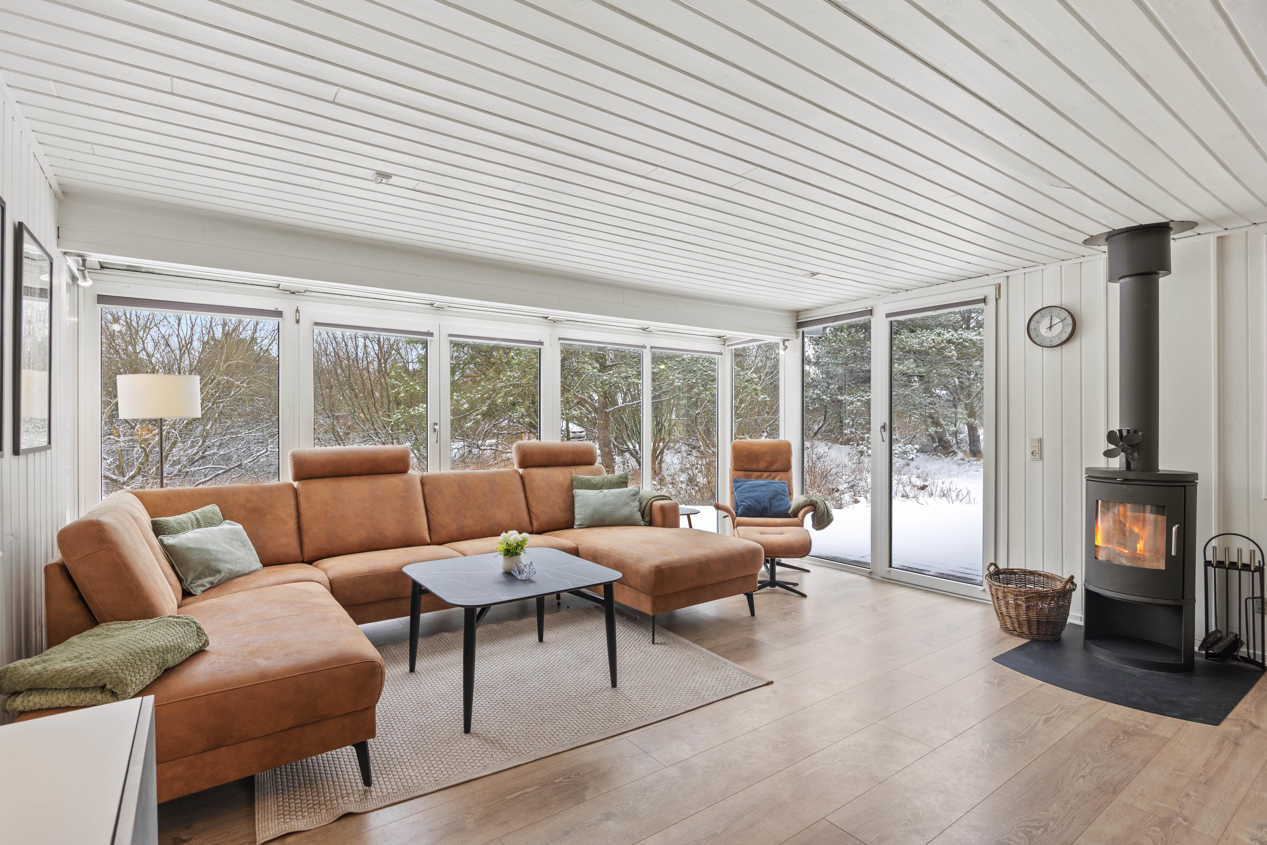 Om aftenen kan I hygge jer foran pejsen, og i løbet af dagen giver de store, lyse vinduer en vidunderlig udsigt ud i den idylliske natur.