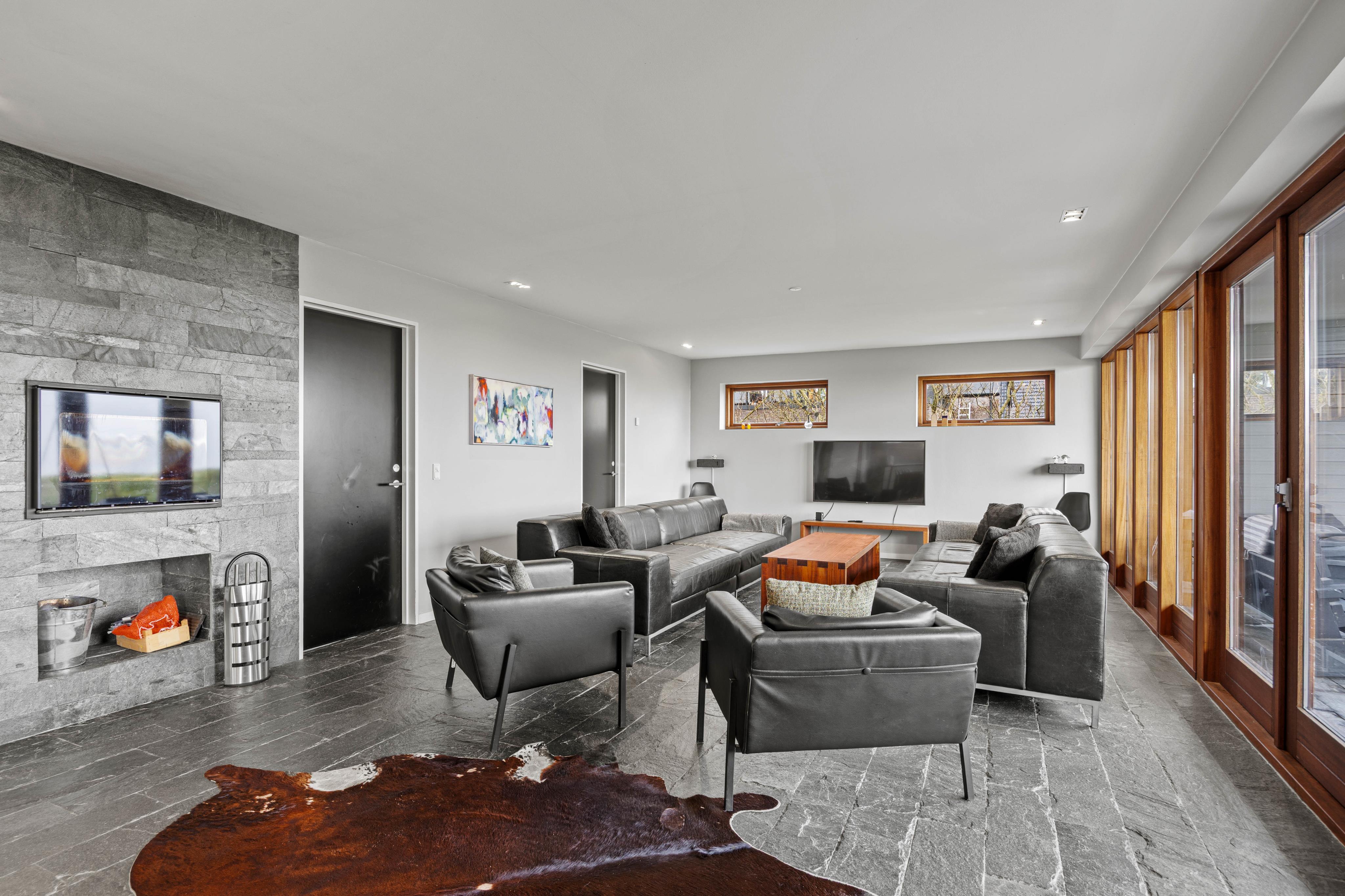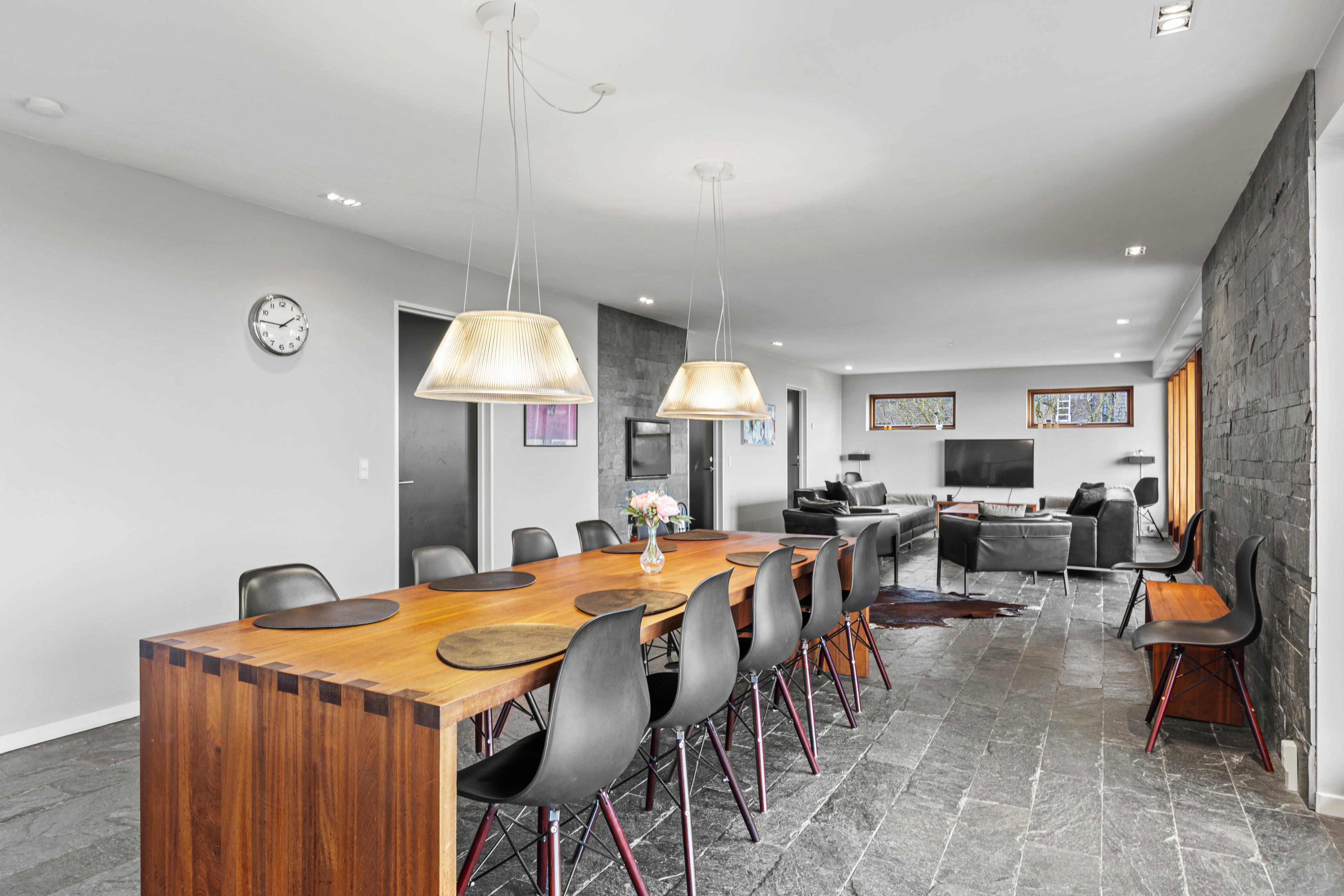 Stort opholdsrum med brændeovn