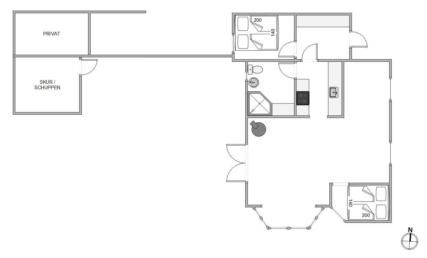 I kan lave mad sammen i det åbne køkken og nyde lækre måltider sammen ved spisebordet. Opvaskemaskinen tager sig af opvasken bagefter. I sommerhuset er der også badeværelse og to hyggelige soveværelser med komfortable dobbeltsenge.