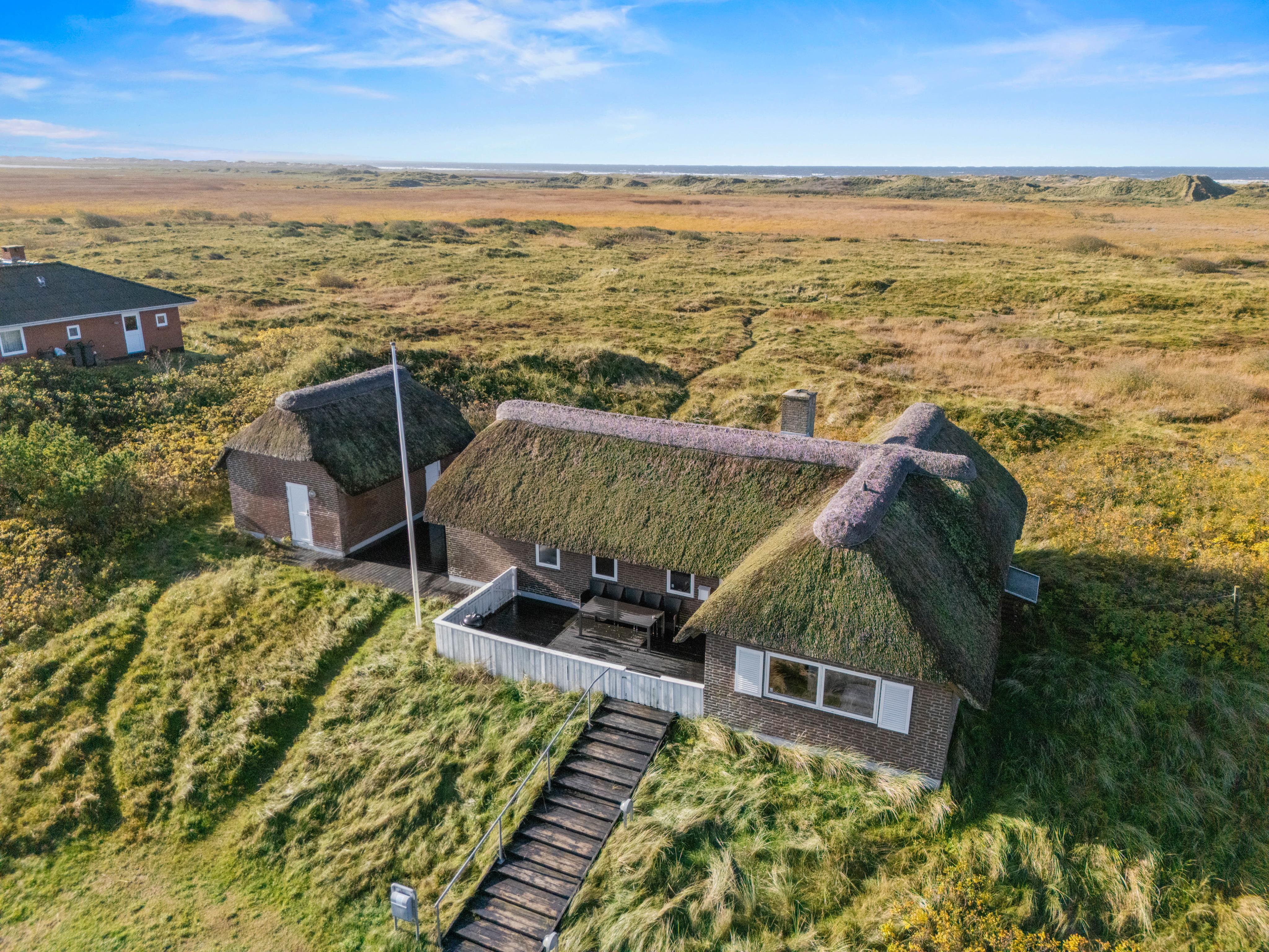 Sommerhuset ligger 600 meter fra den brede sandstrand på Lakolk, og en lille sti ved huset fører gennem klitterne til stranden. Ved huset er der flere store og beskyttede terrasser med havemøbler, så I altid kan finde en plads i solen og læ for vinden. Her kan I virkelig nyde husets unikke beliggenhed og roen og friheden.
