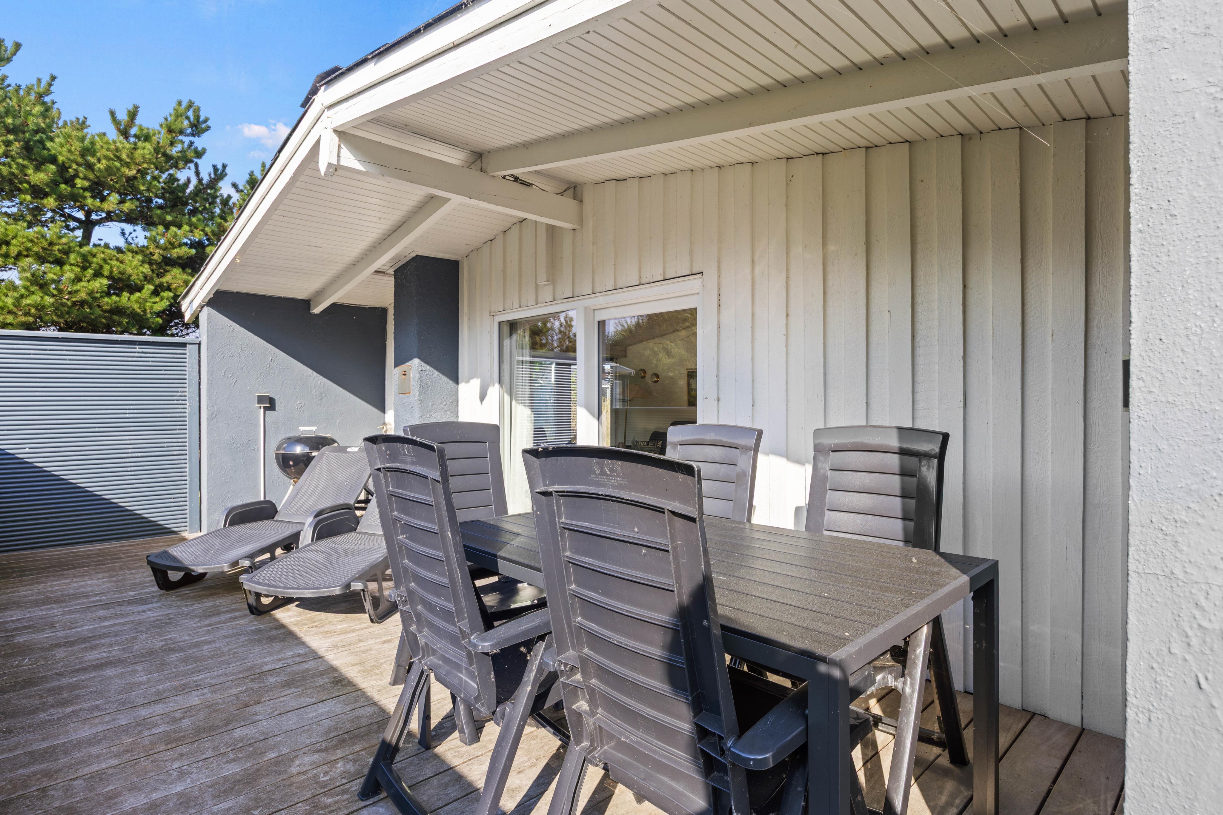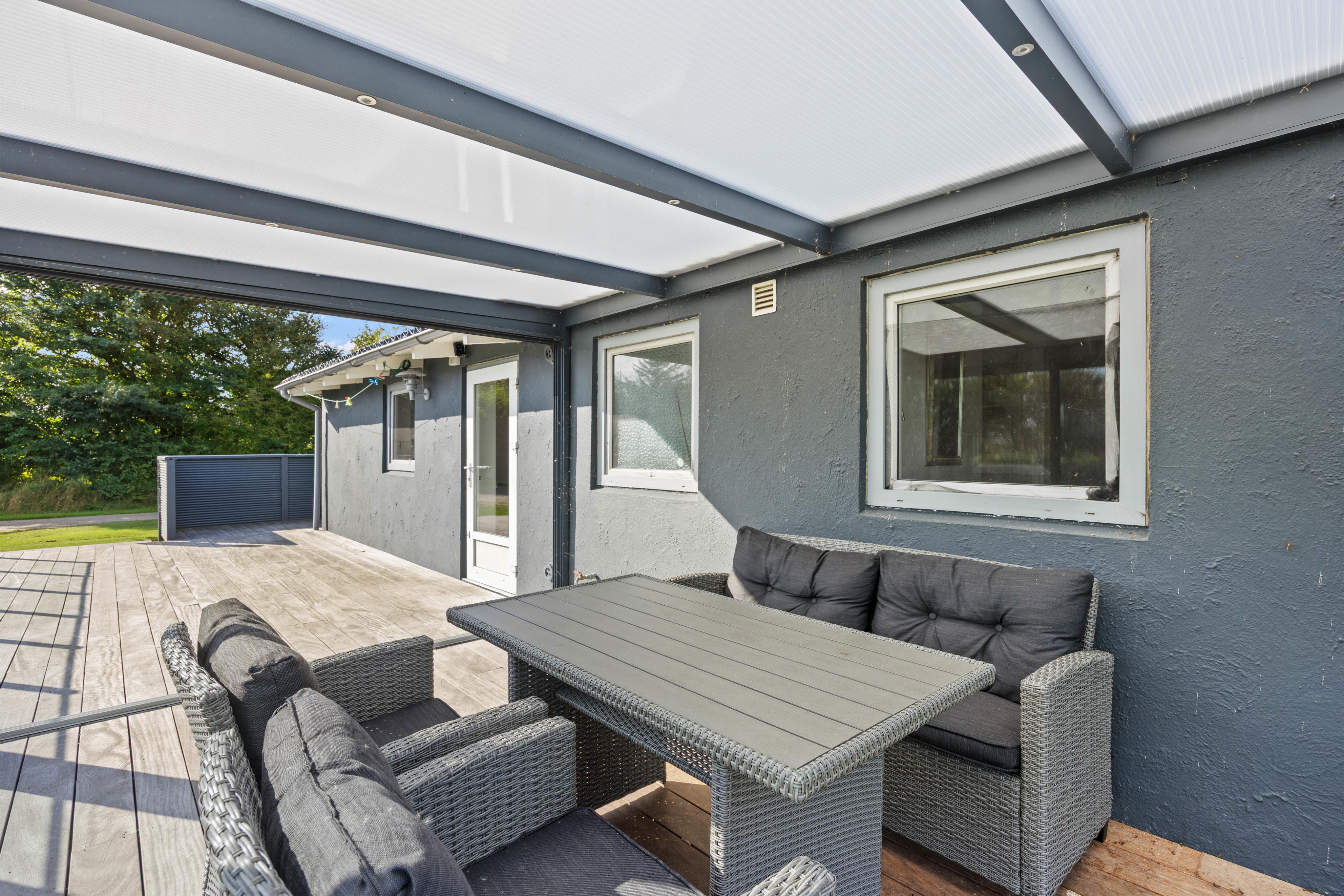 Jeres private feriested ligger på en næsten 1.000 m² stor naturgrund, der giver mulighed for absolut afslapning og udendørs aktiviteter. Nyd den overdækkede terrasse med havemøbler og grill til hyggelige stunder under åben himmel. Kun 1,3 km skiller jer fra den skønne sandstrand, mens indkøbsmuligheder kun er 1,5 km væk.