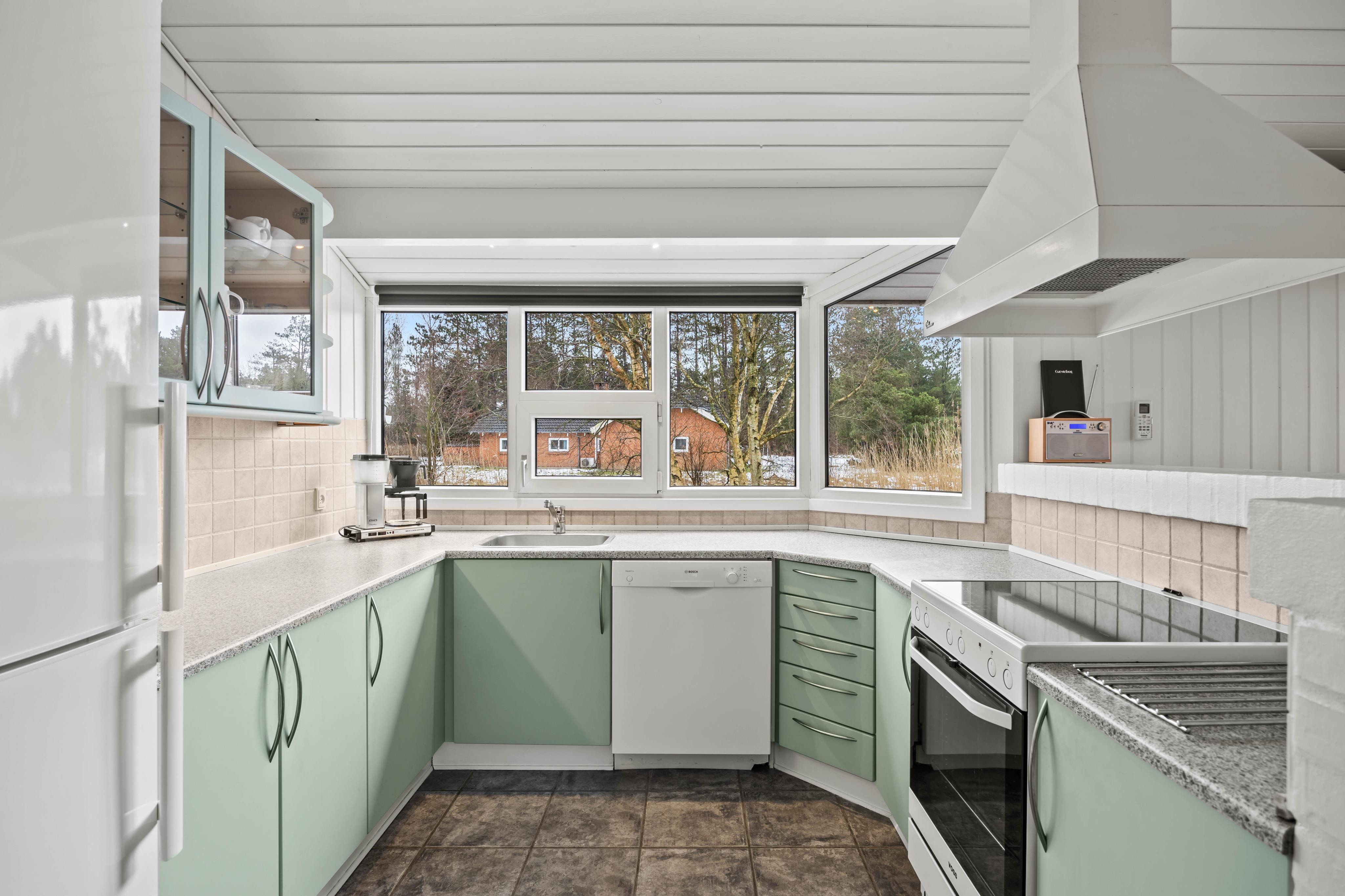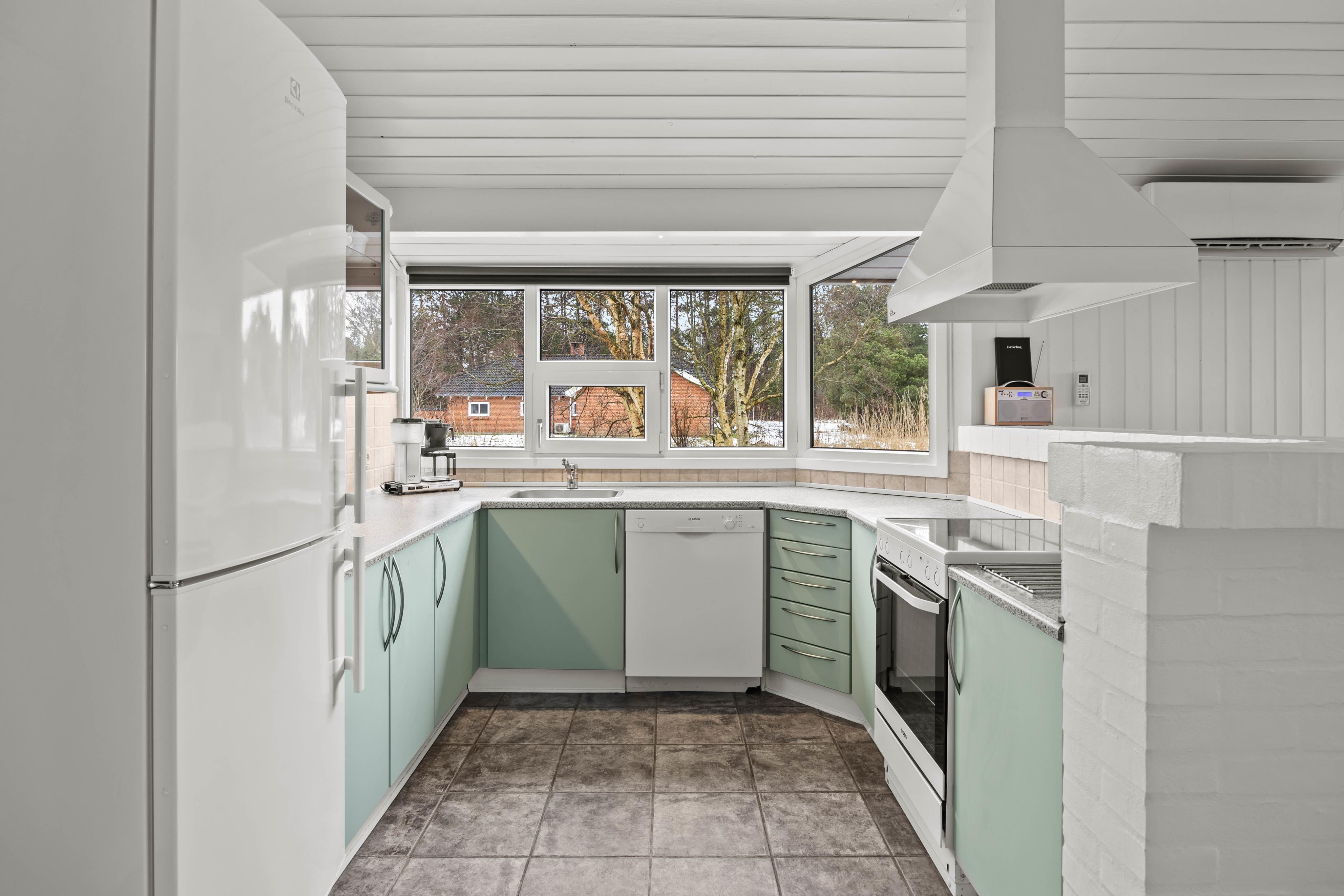 Der findes en hyggelig stue med brændeovn og et stort vinduesparti, så I rigtig kan nyde udsigten i den smukke natur ved Vadehavet. Her kan I nyde mange gode timer med afslapning og samvær. Stuen ligger i åben forbindelse med spisestuen og køkkenet, så hele familien kan være sammen, mens der kokkeres. Køkkenet er selvfølgelig udstyret med opvaskemaskine, som tager sig af arbejdet efter et godt måltid.