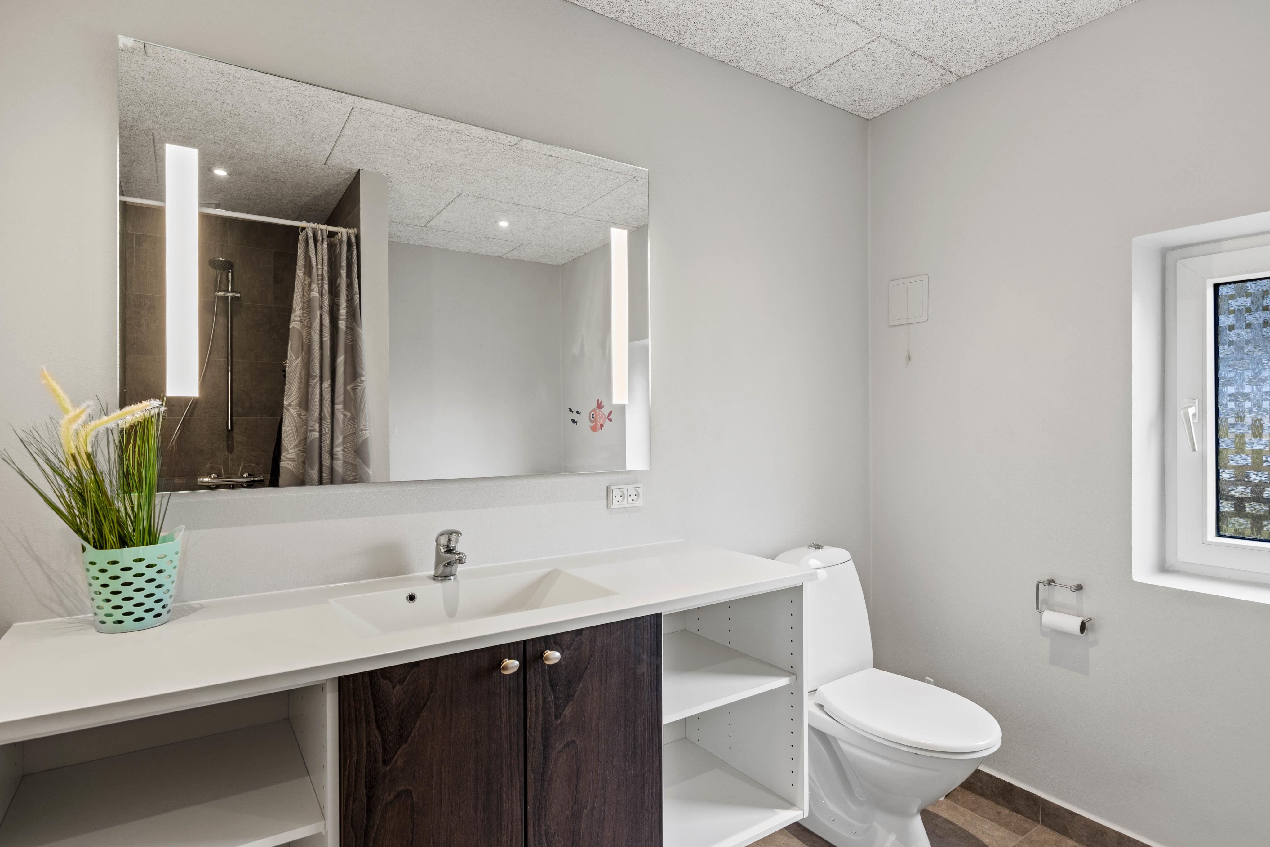 Køkkenet er udstyret med en stor kogeø, opvaskemaskine, mikrobølgeovn, køleskab og fryser. Feriehuset har 5 soveværelser, herunder 4 dobbeltsenge og en køjeseng. Der er et stort badeværelse med bruser, vaskemaskine og tørretumbler samt et ekstra gæstetoilet. Begge badeværelser har gulvvarme.