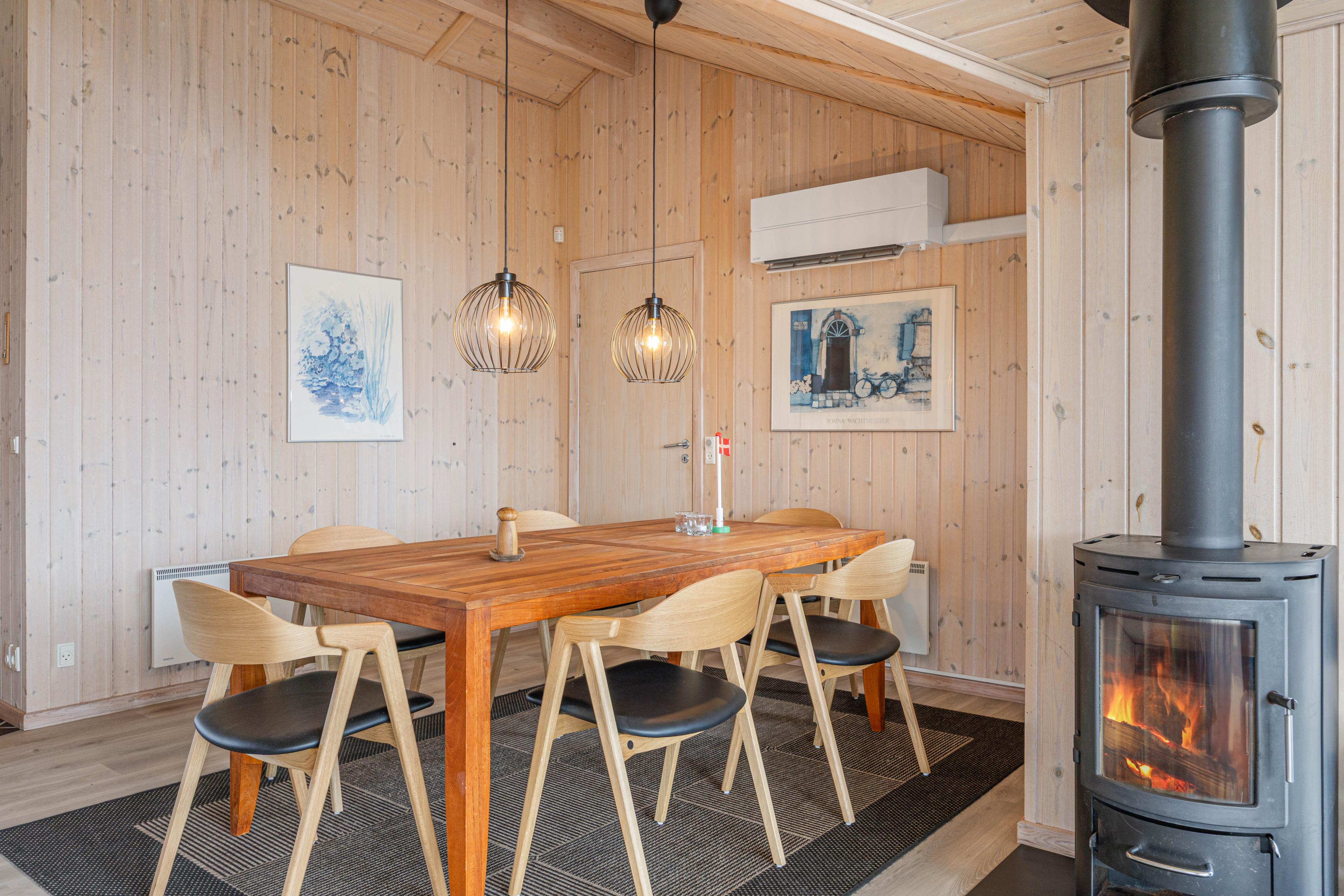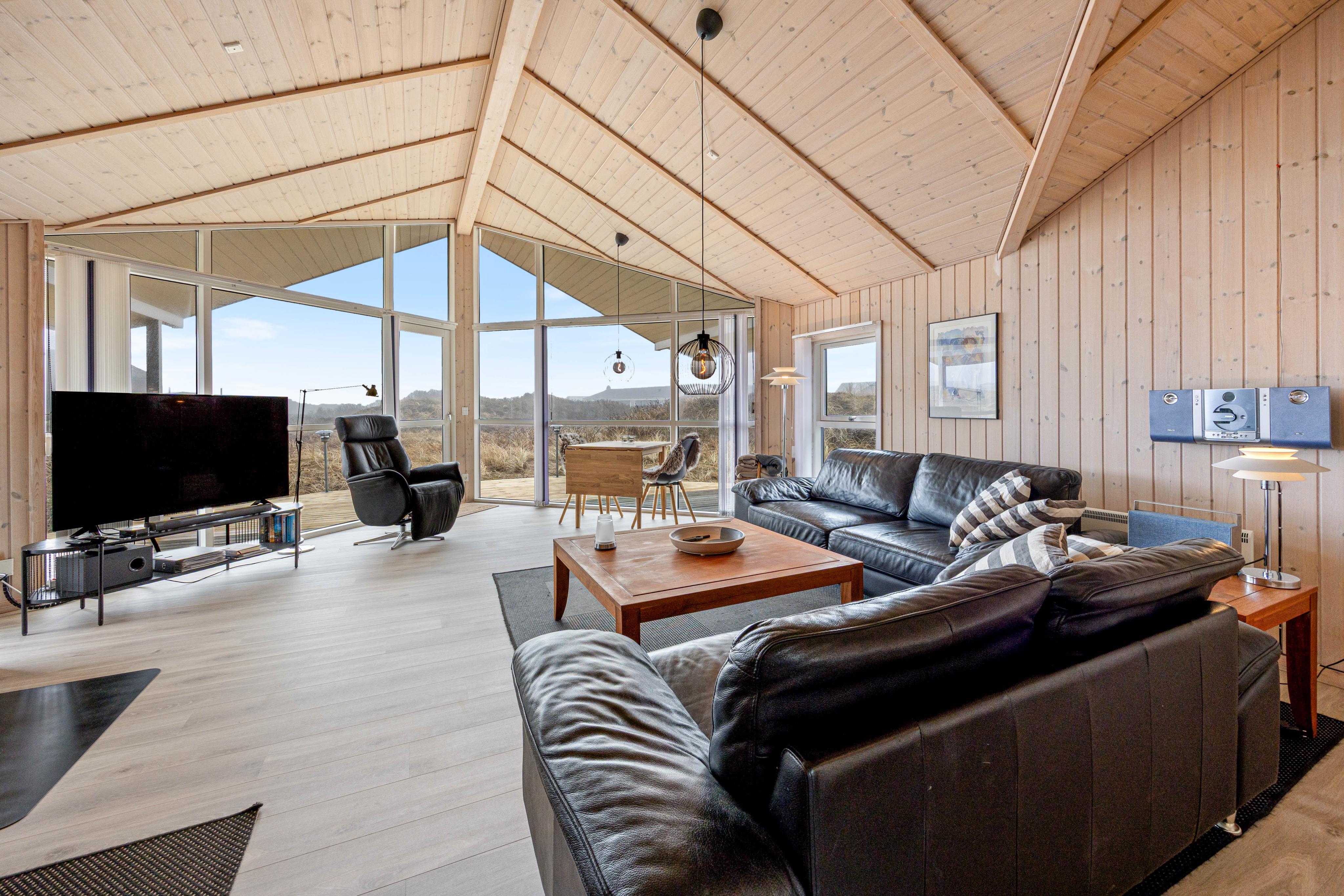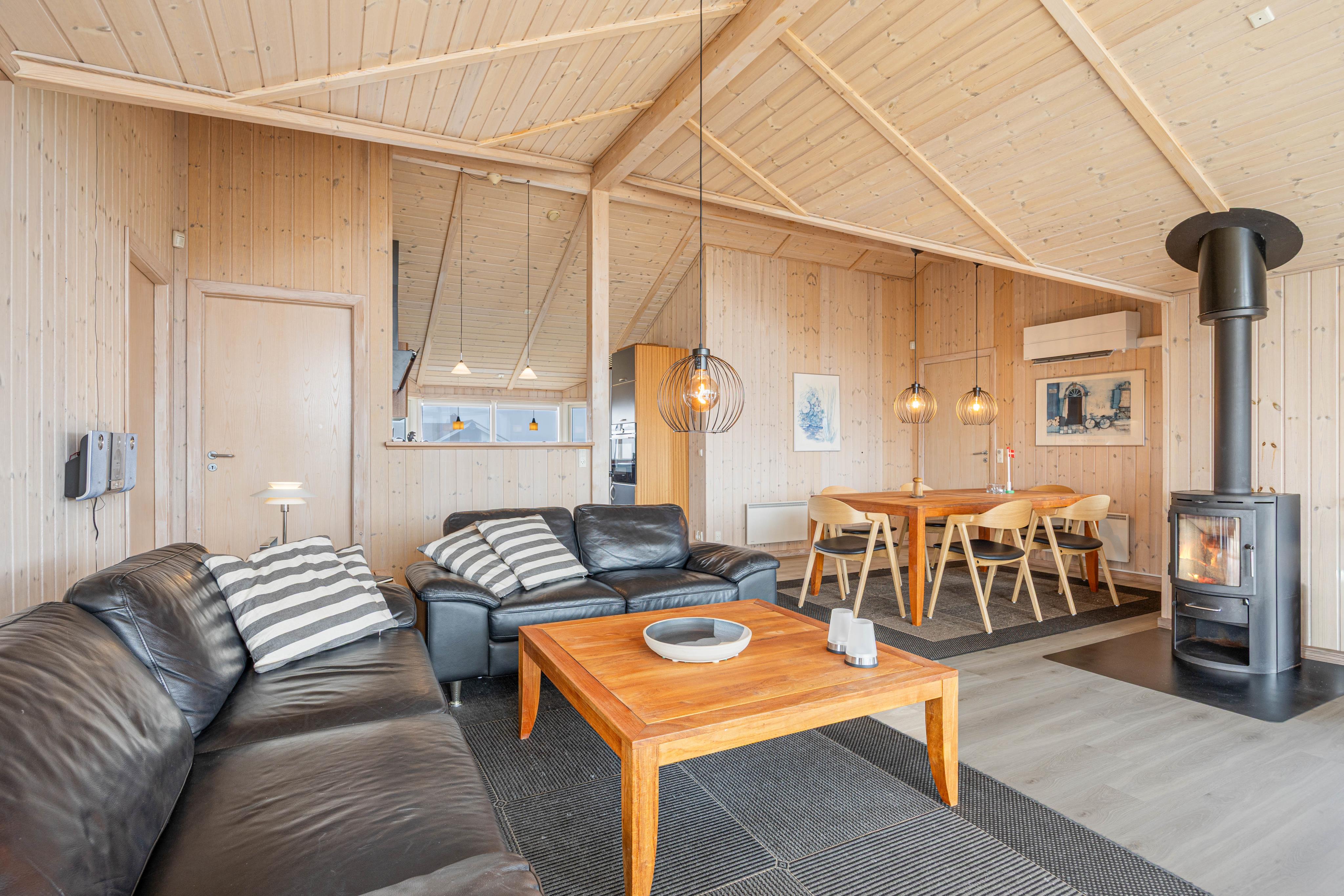 Fra det store glasparti i stuen strømmer lyset ind, og man kan kun føle sig godt tilpas. Slap af med en bog i de komfortable møbler, mens brændeovnen knitrer i baggrunden, eller se en god film på fjernsynet, som har et Apple-tv til fri afbenyttelse.