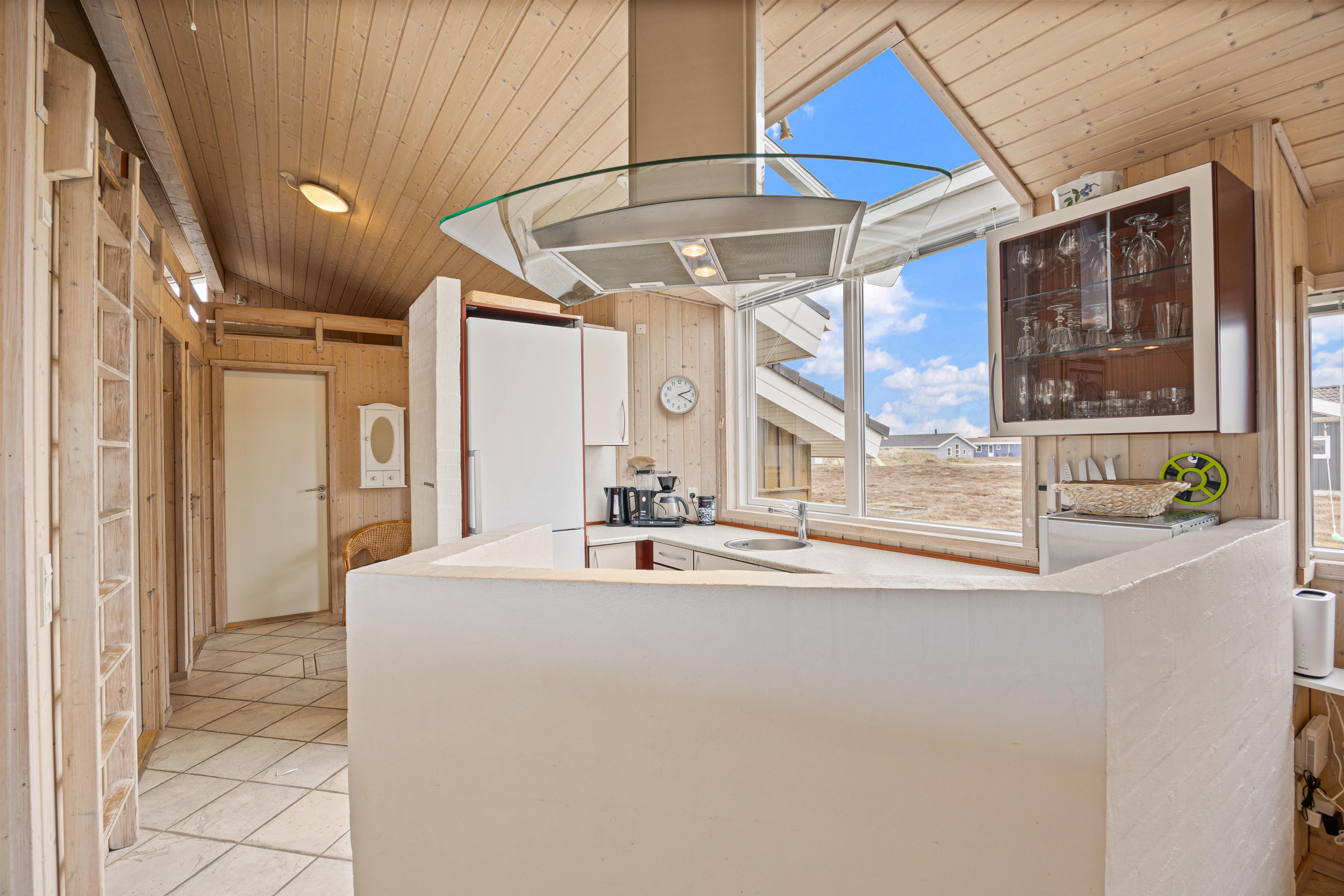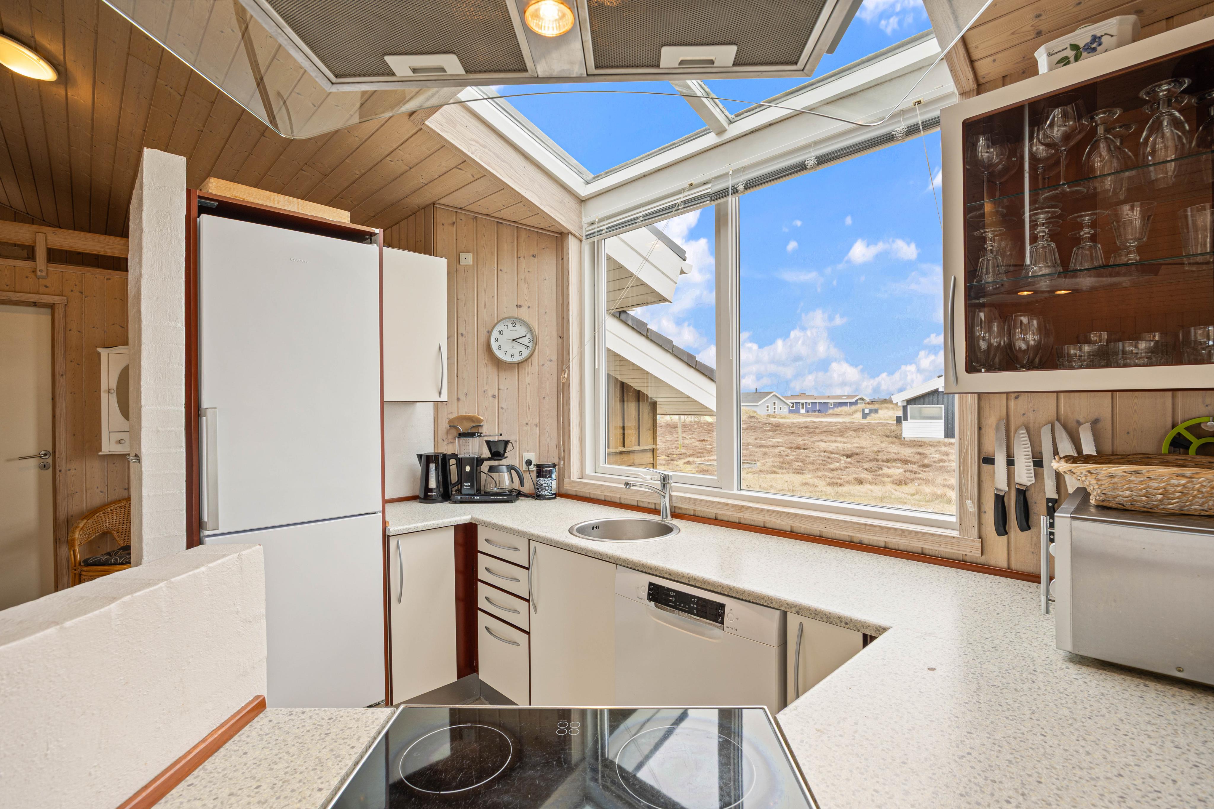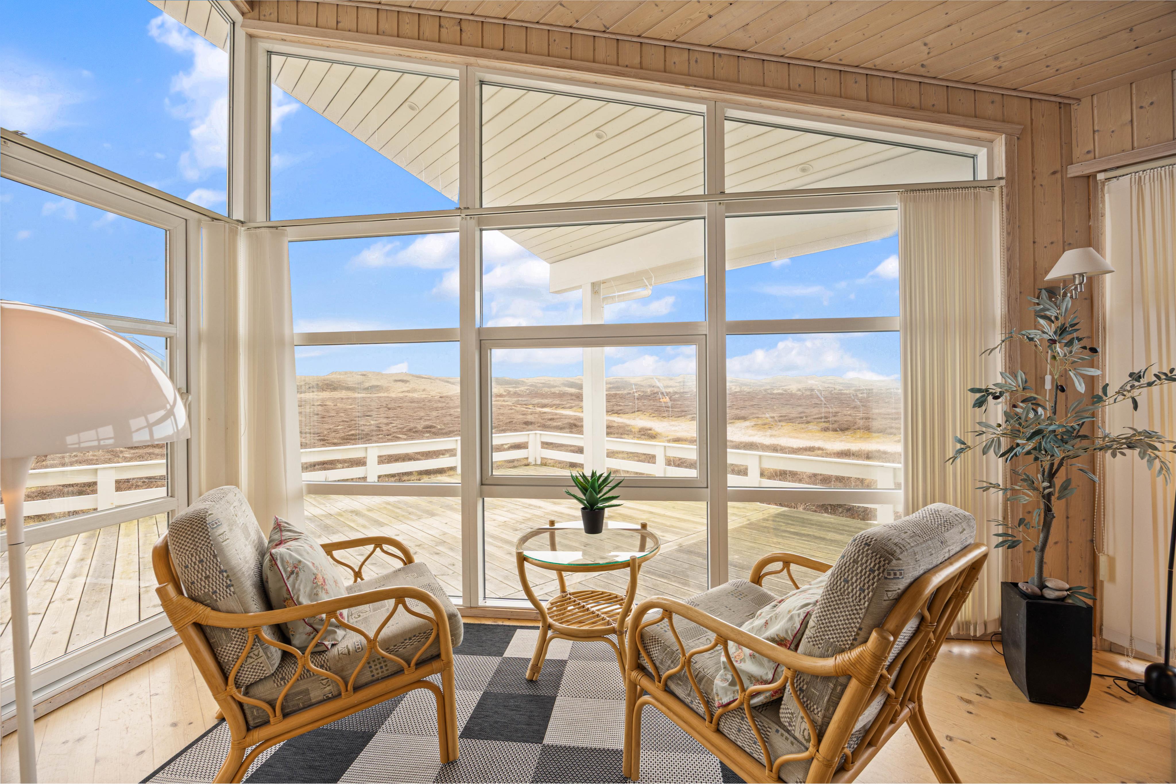 Huset har en fantastisk beliggenhed og byder med sin grundplan på en smuk udsigt over heden og klitterne. På den omkransende terrasse kan man finde en plads i skygge eller sol hele dagen. Havemøblerne indbyder til afslapning eller fælles måltider udenfor. Indenfor er huset hyggeligt og praktisk indrettet. Op til otte personer kan trække sig tilbage eller nyde ferien sammen.