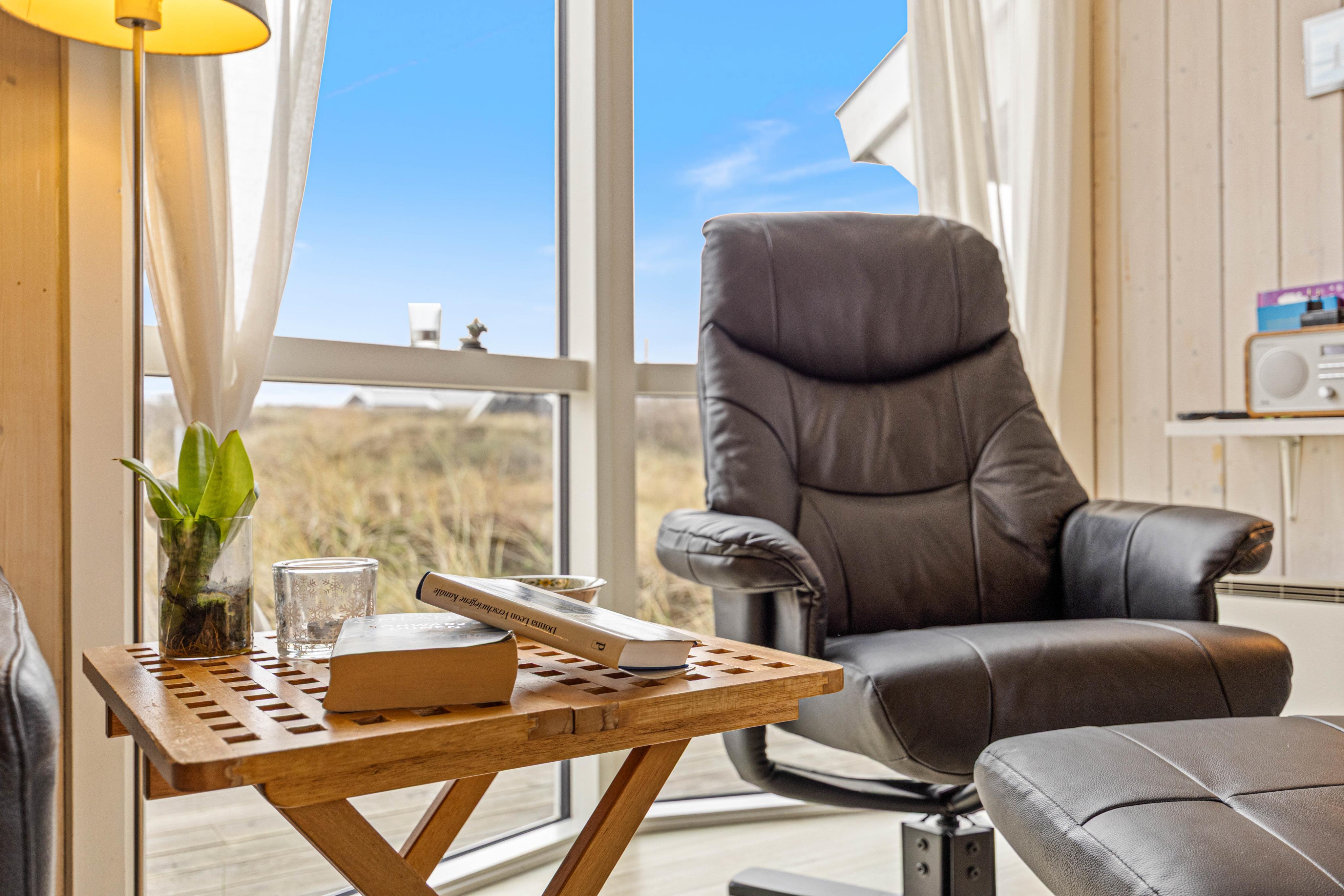 Feriehuset er helt perfekt, hvis du ønsker en afslappende ferie i smukke naturomgivelser tæt på Vesterhavet og den gode sandstrand. Det er hyggeligt indrettet, og i stuen har du en dejlig karnap, der giver et godt lysindfald og udsigt til naturgrunden.