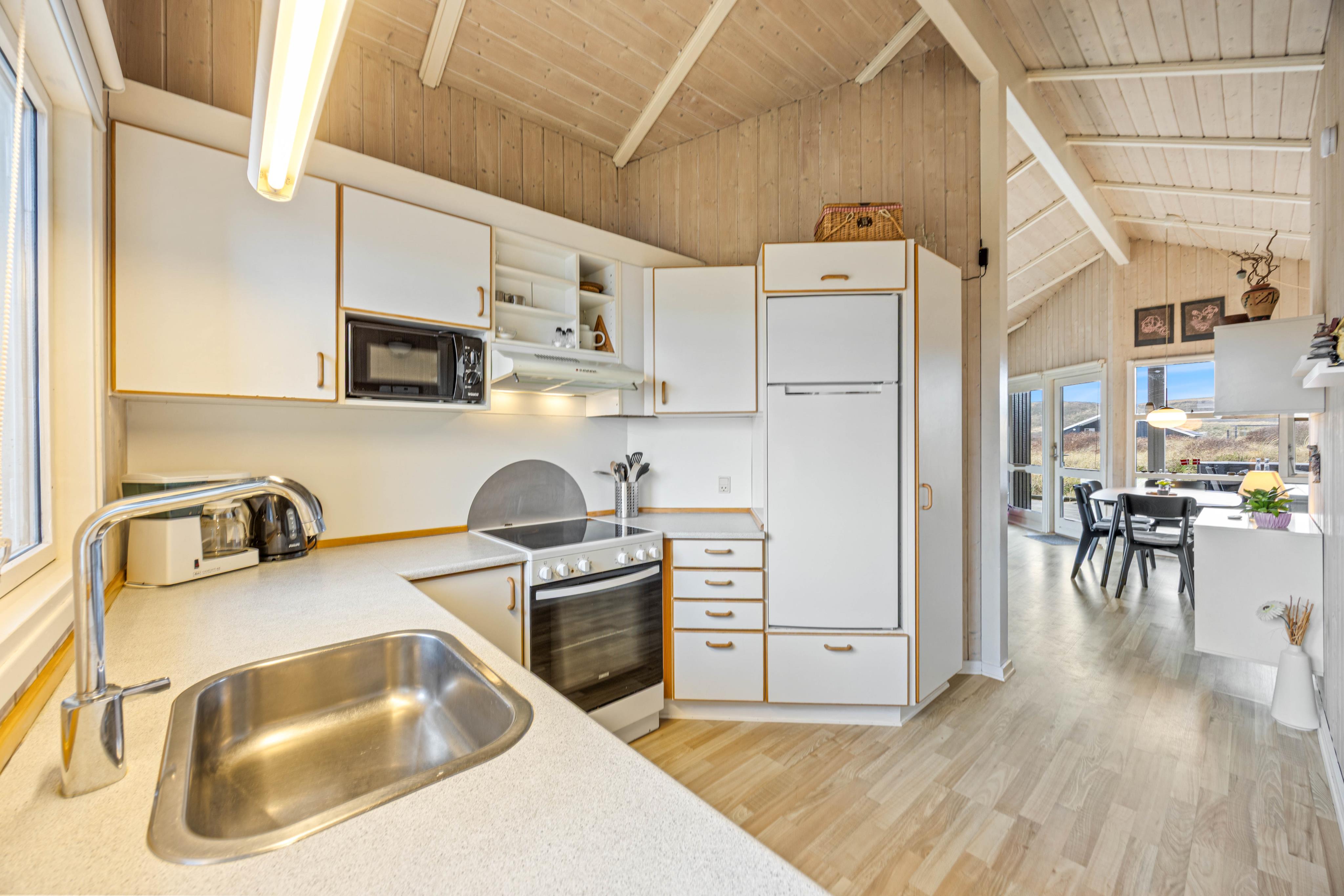 Det er et meget hyggeligt sommerhus med kort gåafstand til stranden. Køkkenet er funktionelt indrettet. Man må bare føle sig godt tilpas i dette hus