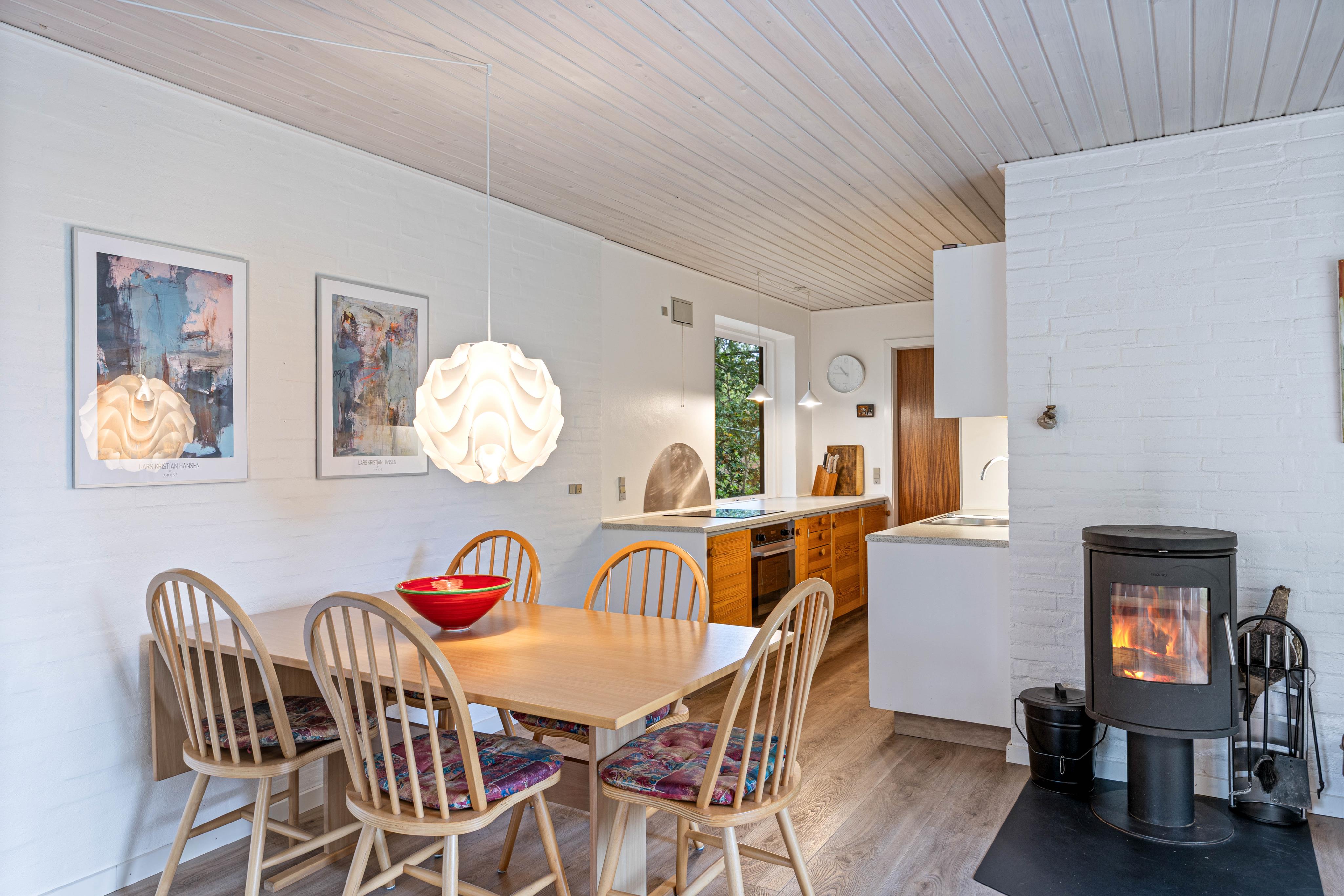 I stuen er brændeovnen centralt placeret, så om I samles omkring spisebordet, i sofaen eller nyder den smukke udsigt gennem stuens panoramavinduer, kan I gøre det i det gyldne skær og den knitrende lyd fra brændeovnen.