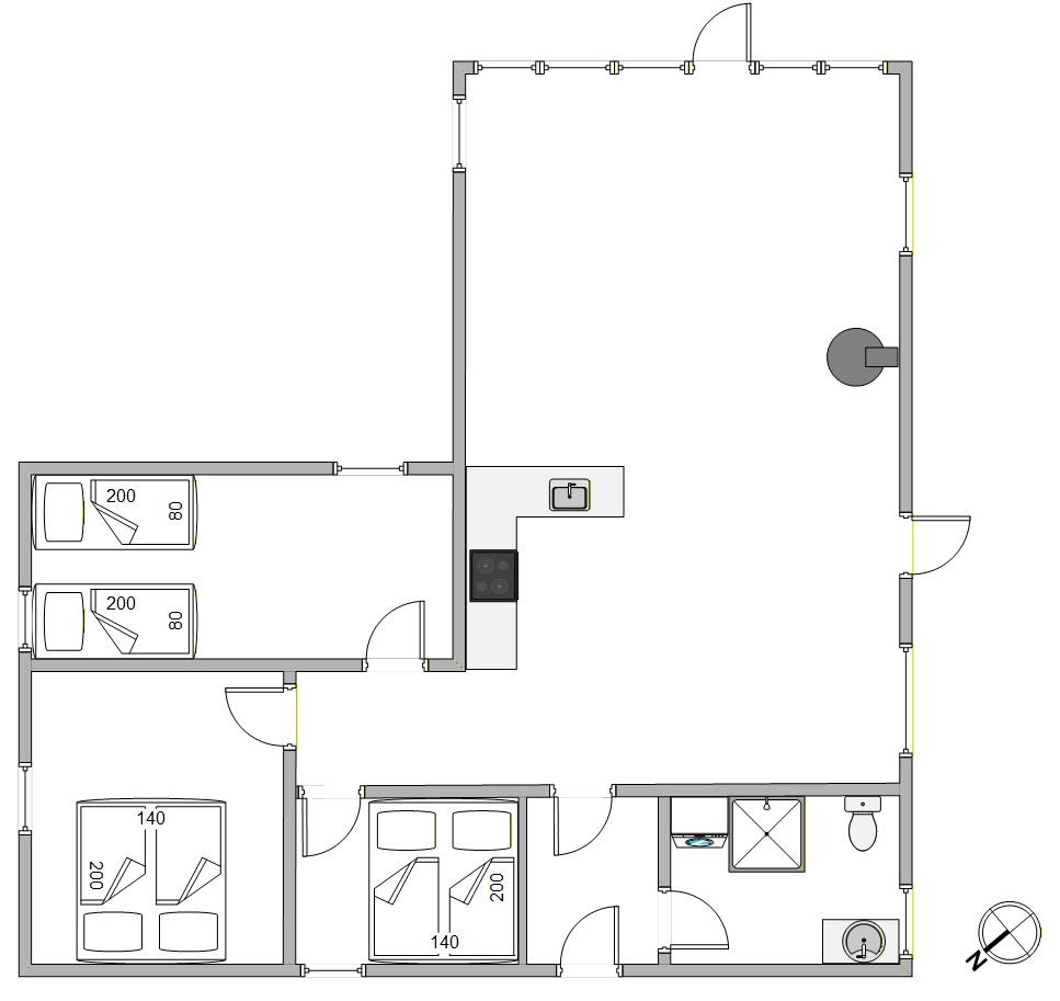Et lyst trægulv og et stort vinduesparti sørger for en lys og hyggelig stemning i sommerhusets opholdsstue. Køkkenet ligger i åben forbindelse med spiseplads og stuen. Her er der plads til, at hele familien kan samles til hygge og afslapning, mens I lytter til den gnistrende brændeovn, som spreder varme og ekstra feriestemning. Hvis det bliver nødvendigt, kan I også tænde for den energibesparende varmepumpe, så temperaturen kan holdes behagelig.