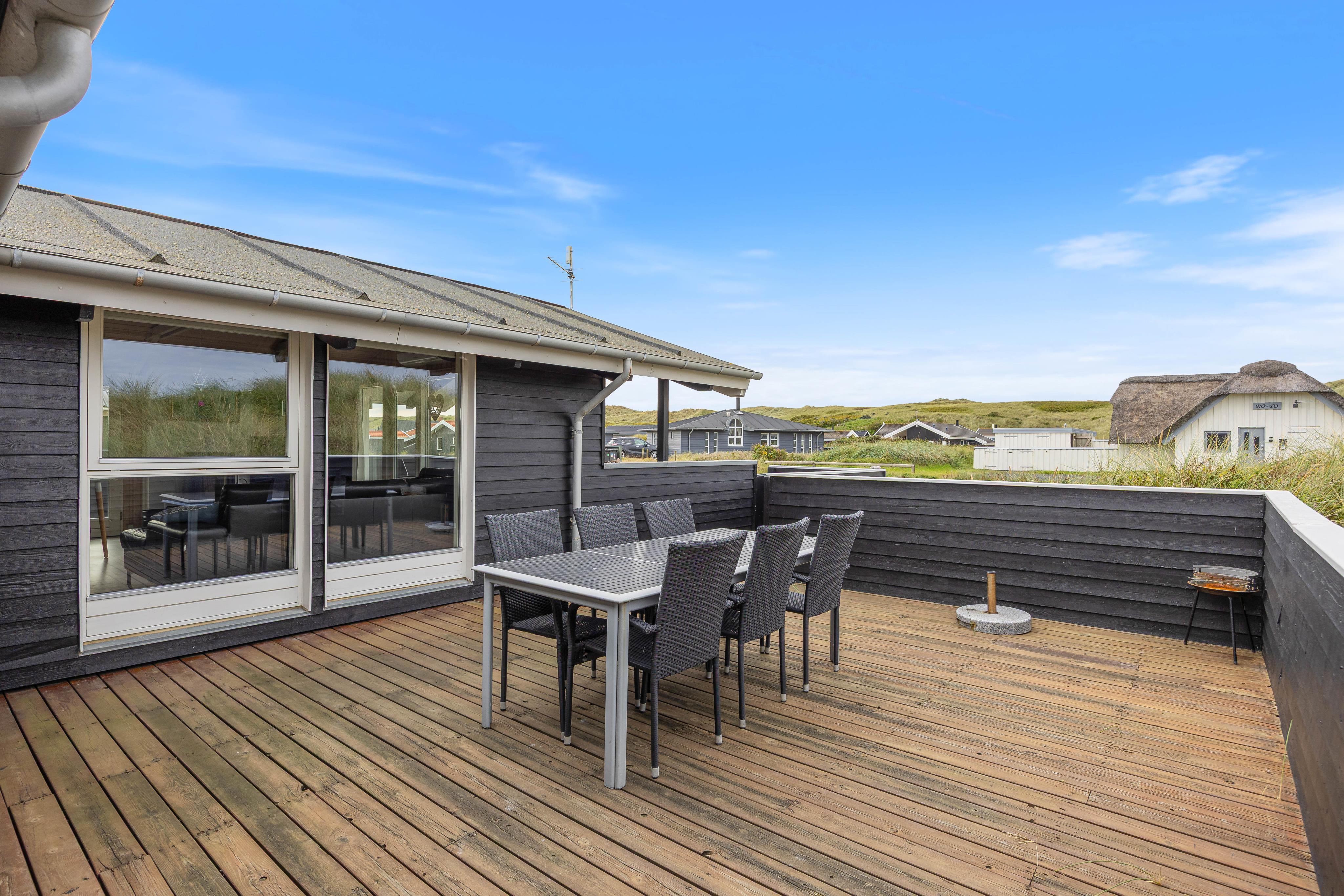 Feriehuset ligger ca. fem minutter fra stranden. Huset er allerede lidt ældre, men godt udstyret. Der er lukkede og åbne terrasser. Sengene er komfortable. Køkkenet er godt udstyret. Der er en stor sofa, hvorfra man har en smuk udsigt over klitterne.