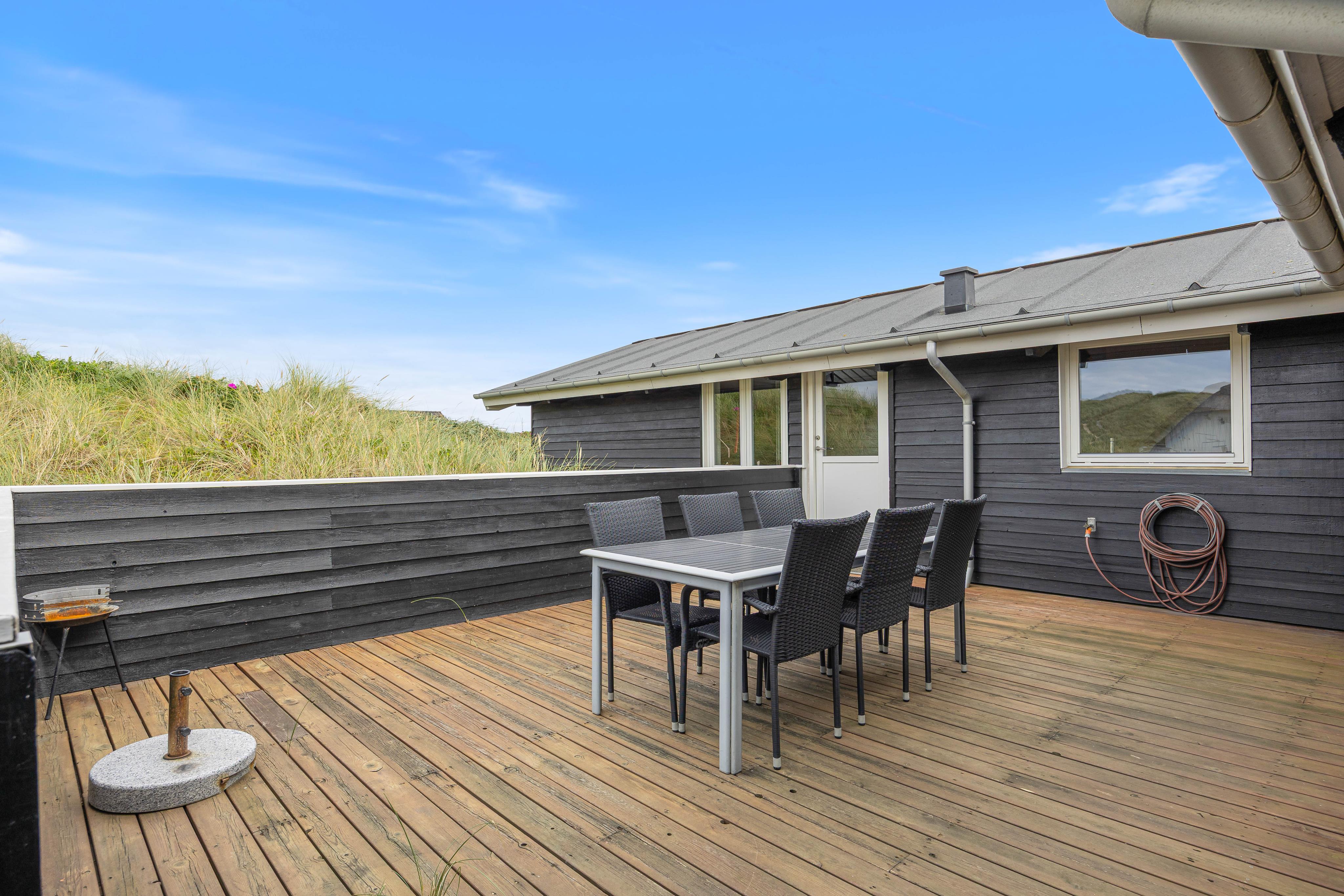 Et hyggeligt feriehus beliggende i Bjerregård, som ligger ca. 15 km syd for Hvide Sande. Her er kun 150 meter til den skønne sandstrand, og området er præget af masser af smuk natur og frisk luft. Sommerhuset er omgivet af terrasser, både afskærmet og delvist overdækket. Efter en god dag på stranden kan I hygge jer ved brændeovnen eller tage en tur i sommerhusets sauna. Derudover er det også tilladt at medbringe op til 2 hunde.