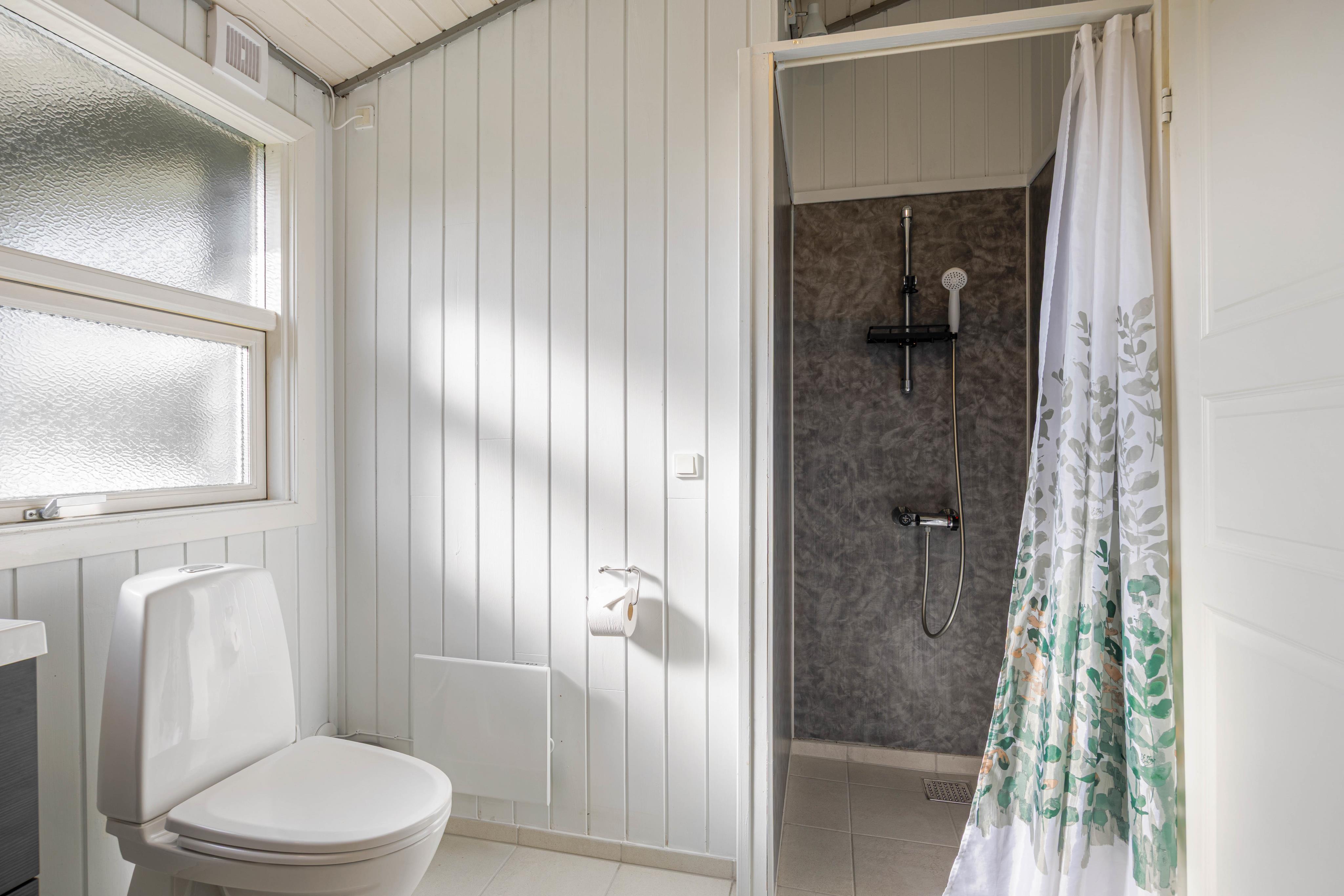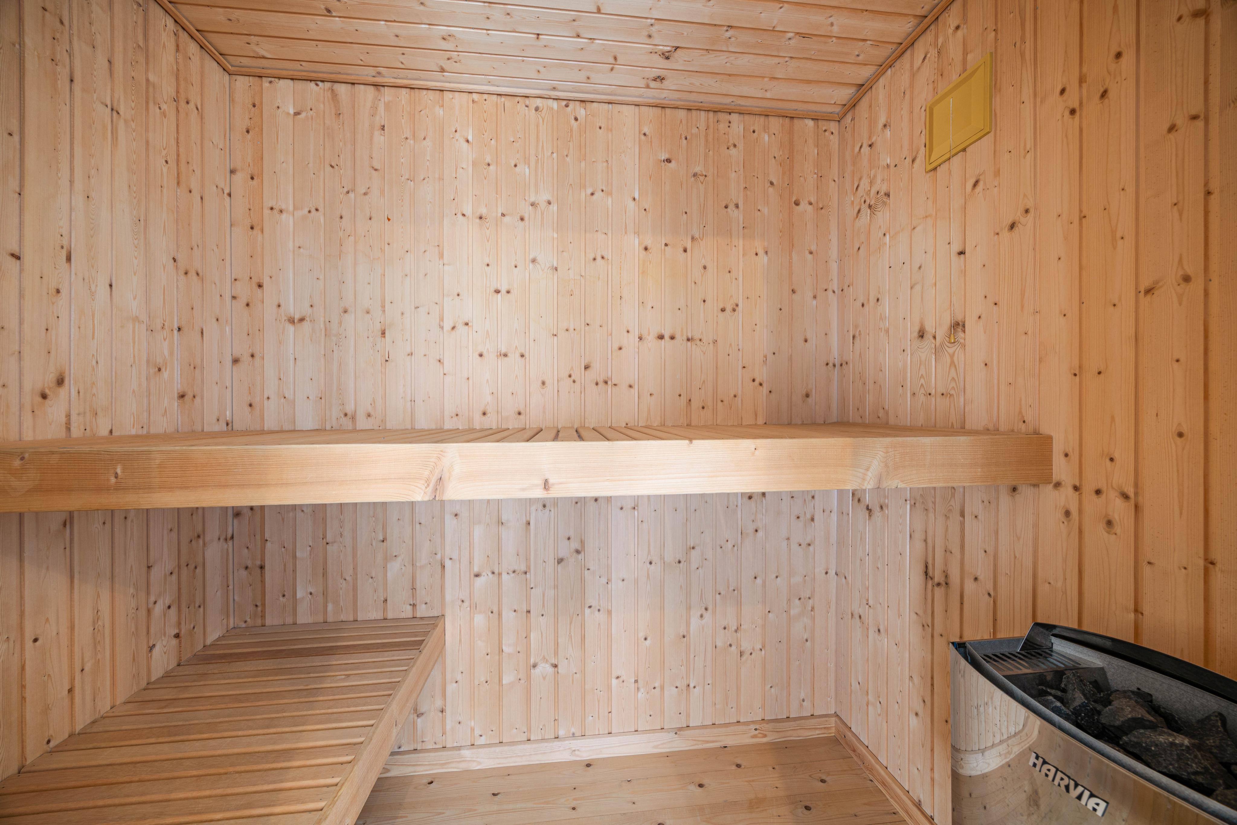 Der er et stort og pænt badeværelse med bruseniche og gulvvarme samt adgang til sauna med bænke i 2 niveauer.