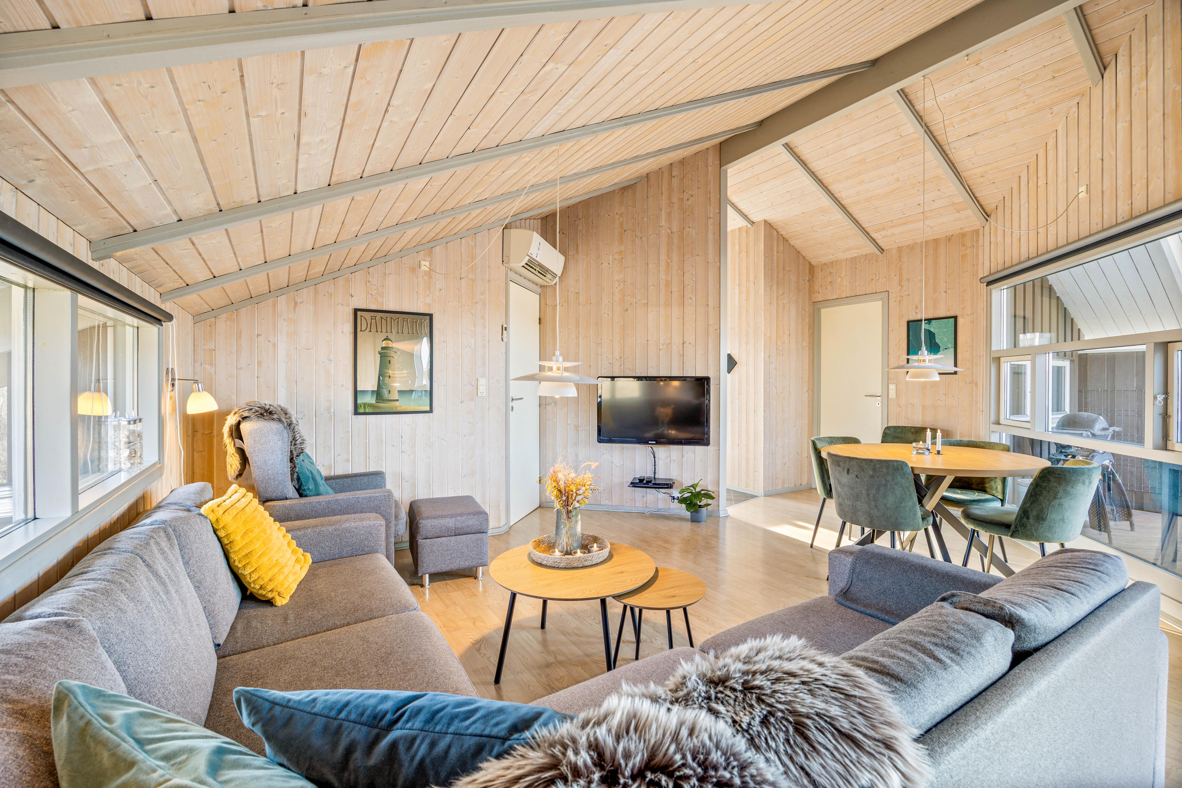 Feriehuset er lyst og venligt. Pejsen skaber en hyggelig atmosfære. Møblerne er også afstemt med hinanden. Køkkenet var meget godt udstyret og havde alt, hvad man har brug for til daglig brug. Badeværelset er lidt gammeldags, men helt i orden. Saunaen er også nem at betjene.