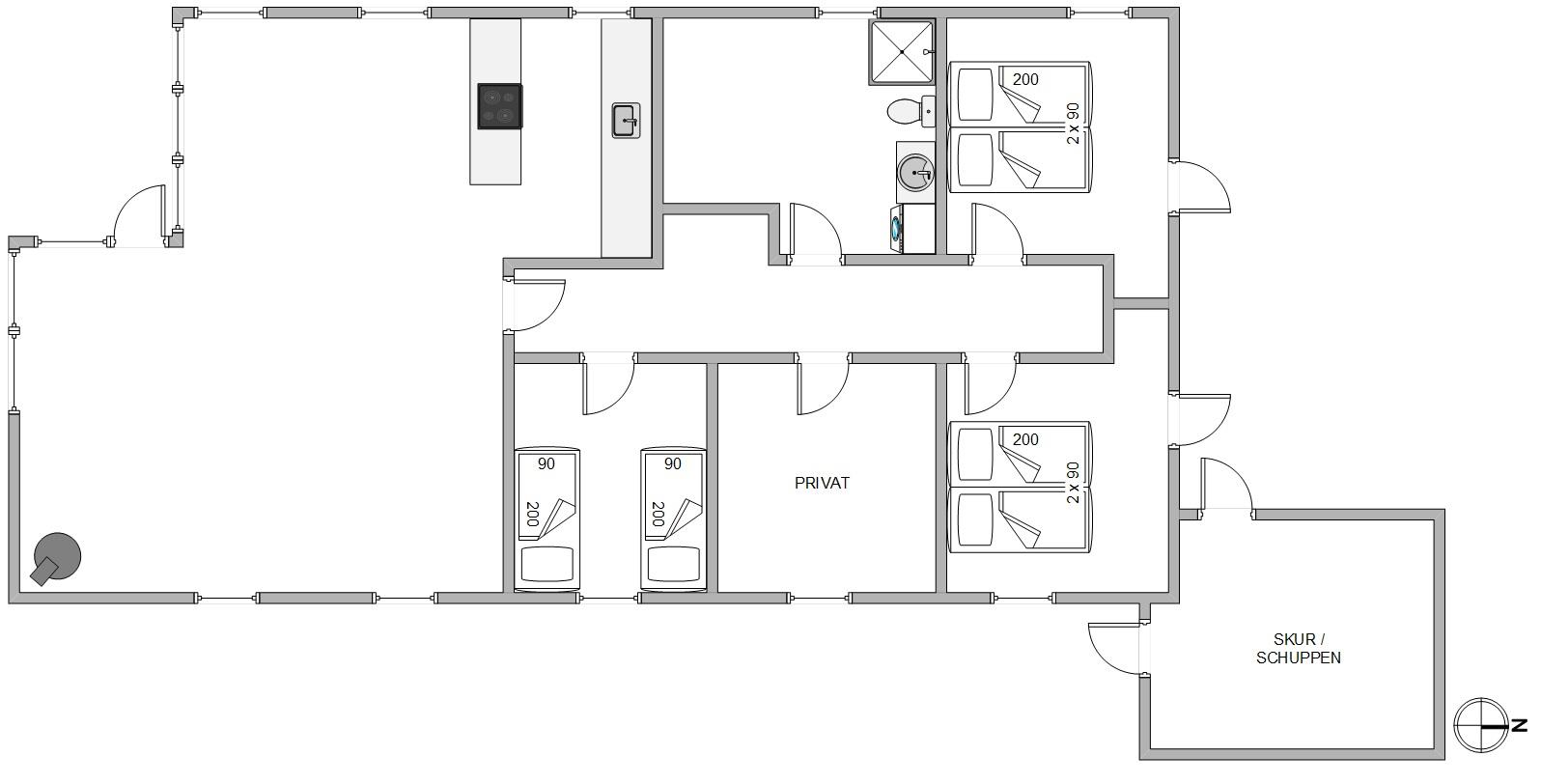 Et moderne rummeligt indrettet feriehus. Imponerende den lyse vinduesfront i husets forreste del. Det har tre soveværelser, hvoraf to med dobbeltseng og et med separate senge. Opholdsområdet er meget rummeligt med komfortable siddepladser, moderne TV med online funktioner. Spisebord med 6 siddepladser. Komplet indrettet moderne åbent køkkenområde. For køkkenfans et must! Badeværelse med stort bruseområde. Rummeligt terrasseområde med borde, stole og liggestole. Man ønsker automatisk at blive der længere!