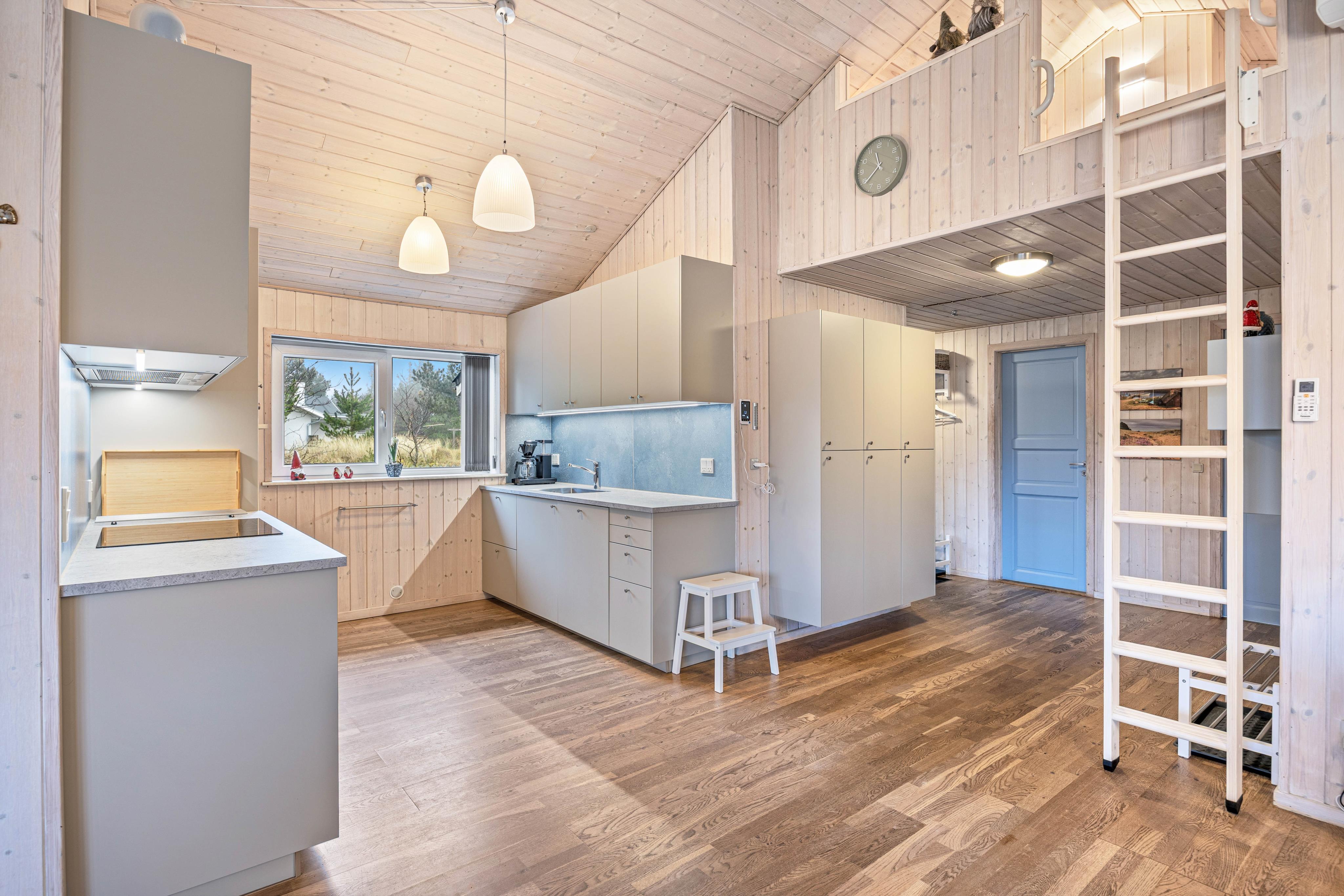 De 112 m2 er praktisk fordelt: Det åbne køkken-alrum med stue, moderne køkken samt adgang til udestuen, bliver utvivlsomt samlingspunktet. Her er der plads til fælles madlavning, filmaftener i sofaen, sjove spil og planlægning af feriens udflugter i den unikke natur - lokalt som regionalt. Desuden er hemsen et perfekt sted at trække sig tilbage for at slappe af. Den isolerede udestue tillader tilbagetrækning og afslapning med lys og udsigt til natur og himmel.
