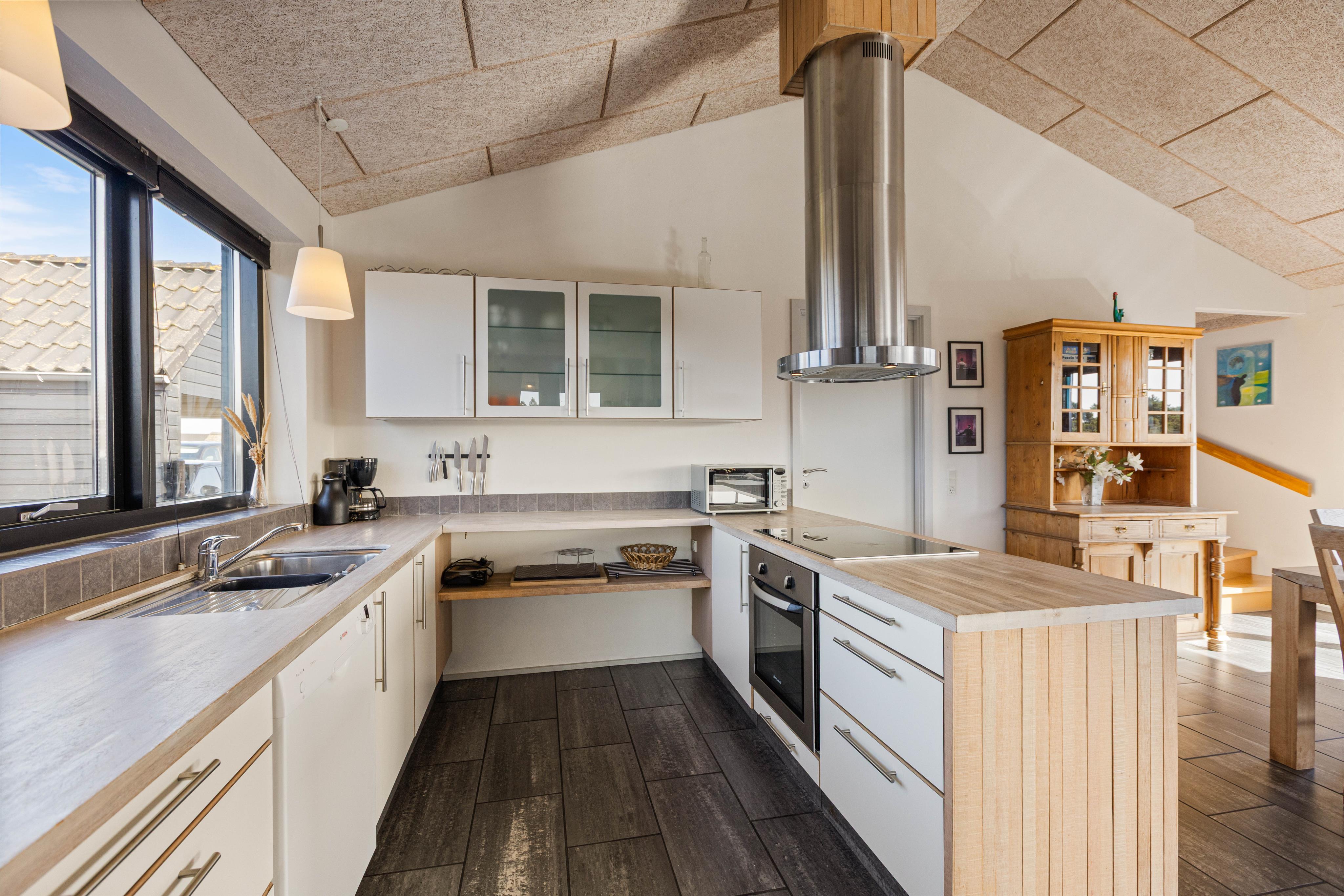 Køkken og stue er sammenhængende og råder over alt, hvad man kan ønske sig på en ferie ved Vesterhavet. Køkkenet har en opvaskemaskine, en fryser på 60 liter og en mikroovn. I stuen er der som i køkkenet flisegulv med gulvvarme, en flot og hyggelig brændeovn, et fladskærms-TV, en radio m/CD-afspiller og gratis trådløst internet. Fra stuen er der udgang til den lukkede terrasse mod syd, og fra køkkenet er der udgang til en nordvestvendt terrasse. Der står desuden en vaskemaskine og en tørretumbler til rådighed i huset.