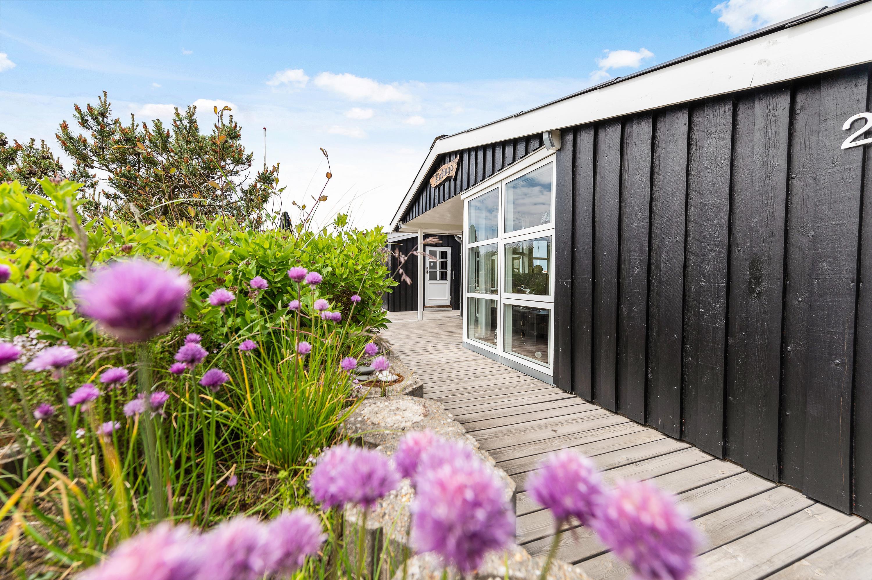 Feriehuset ligger på en dejlig nedsænket naturgrund, så de små klitter omkring sommerhuset giver god læ og sørger for, at I uforstyrret kan sidde ude på terrassen. Hele vejen rundt om feriehuset er der anlagt en god terrasse, så uanset hvor vinden kommer fra, vil I altid kunne finde et godt sted med læ og sidde ude.