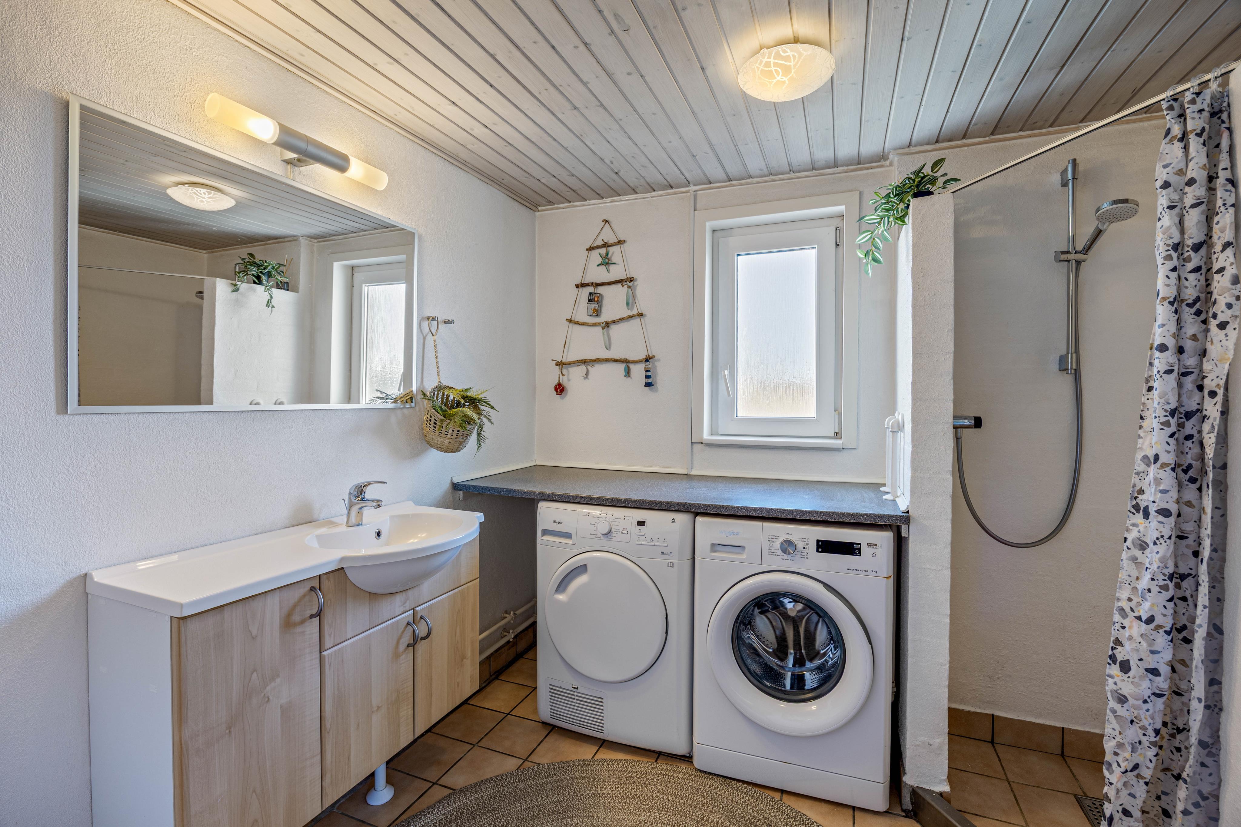 Badeværelset er enkelt indrettet og med både vaskemaskine og tørretumbler, kan I nemt friske tøjet op under jeres ophold. På feriehusets velindrettede 82m2 finder I 3 rummelige soverum, hvor I kan slappe af og nyde en god nattesøvn i de komfortable senge.