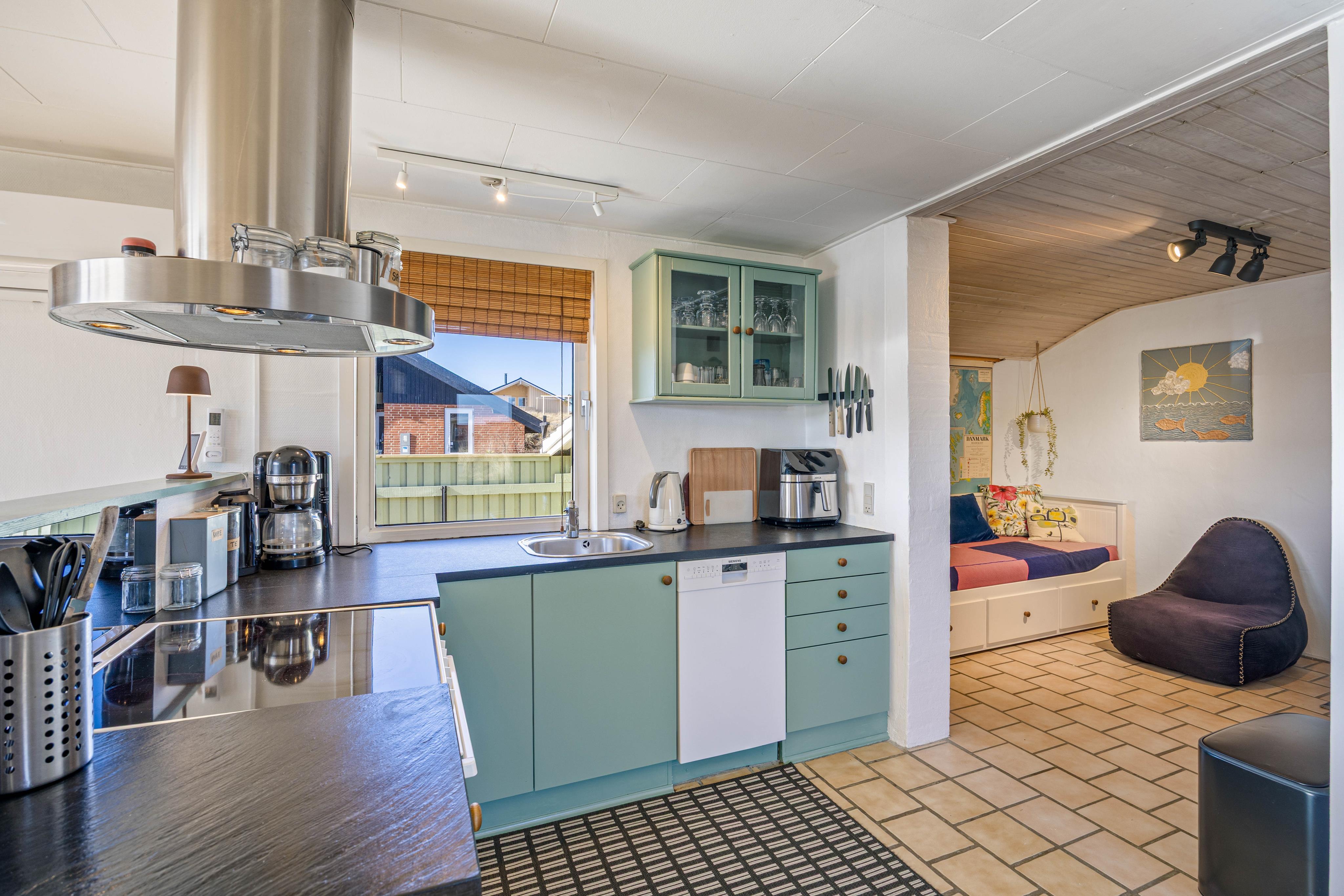 Den lyse og venlige indretning byder velkommen så snart, du træder ind over dørtrinnet. I stuen er brændeovnen, der sørger for varme og hyggestemning på de køligere aftener, samt en energibesparende luft-til-luft varmepumpe, der sikrer en behagelig temperatur hele året. Det åbne køkken med klinker er udstyret med alt, hvad I behøver for at forkæle hinanden med lækre hjemmelavede måltider, herunder opvaskemaskine.