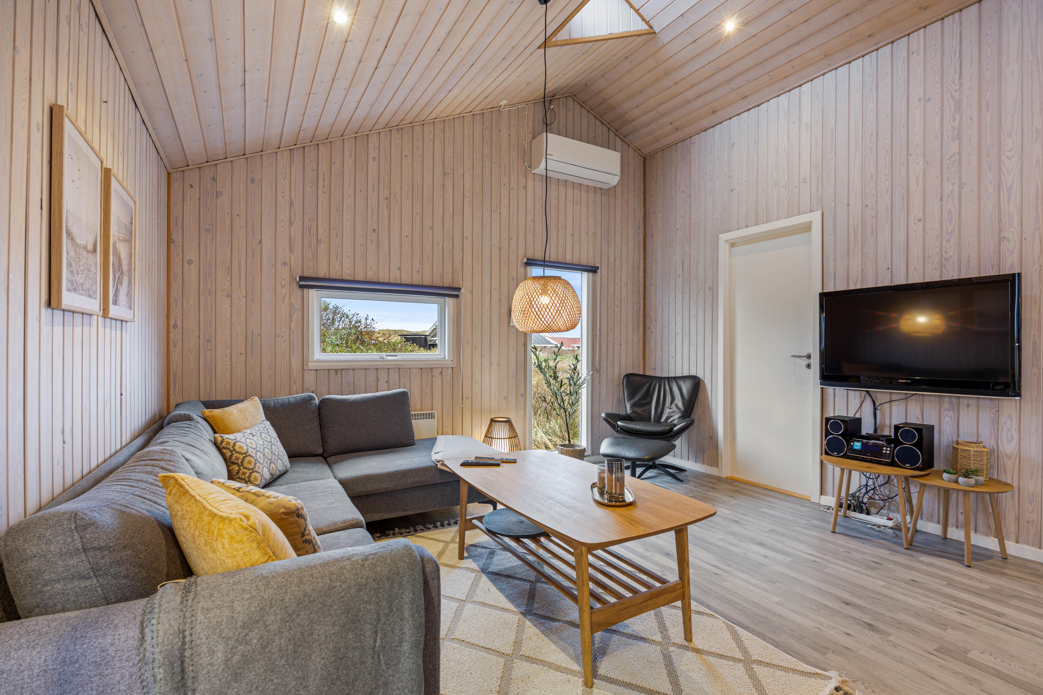 Det åbne køkken- og spisestueområde er feriehusets hjerte og indbyder til mange timers samvær og fælles madlavning. Om aftenen kan I læne jer tilbage i sofaen og hygge jer med en god film, der kan streames vha. Chromecastet. Stuens lænestol er perfekt til ferielæsningen, mens brændeovnen knitrer i baggrunden. Alrummet varmes op af en energibesparende varmepumpe.