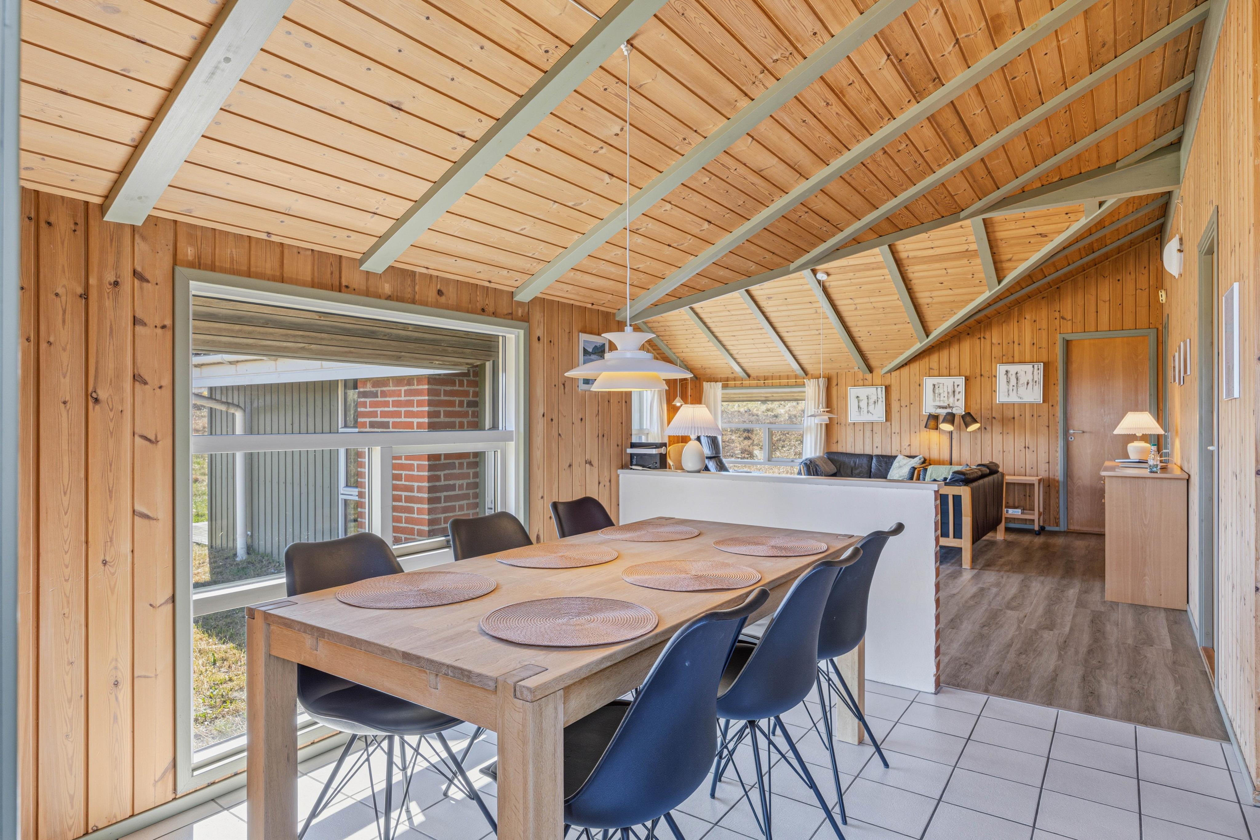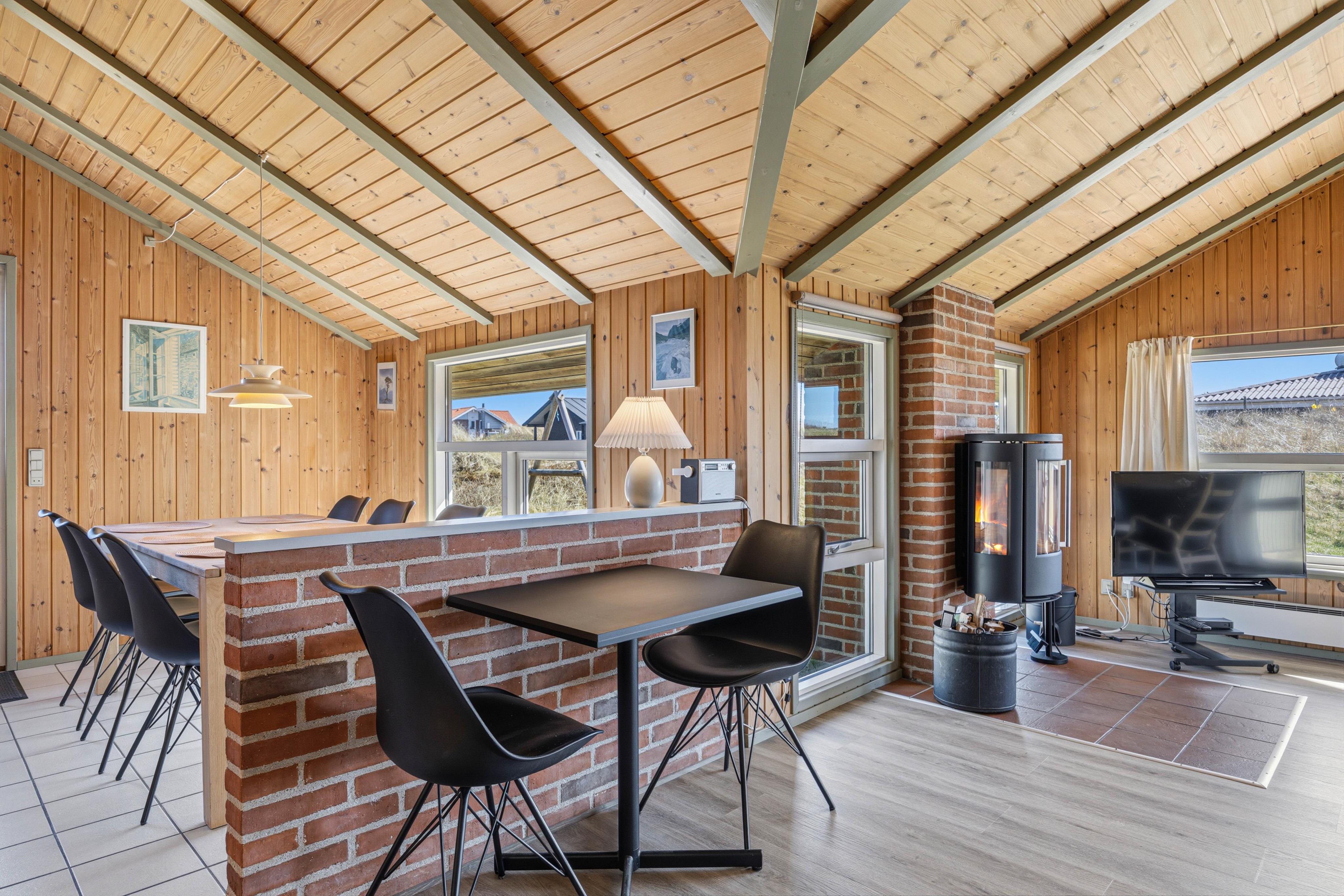 Indretningen i feriehuset er lys og enkel med fokus på funktionalitet og en klassisk stil, som skaber en behagelig og afslappet atmosfære. Stuen giver god plads til fælles aktiviteter – hvad enten I samles om et spil, en film eller blot nyder roen foran brændeovnen. Samtidig gør planløsningen det muligt at trække sig lidt tilbage, når der er behov for det, hvilket gør feriehuset særligt velegnet til familier, der ønsker både samvær og fleksibilitet i deres ferie.