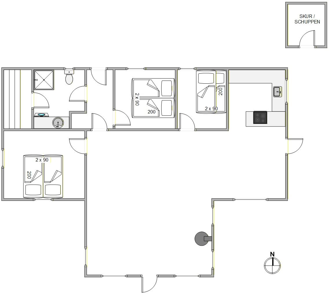Feriehuset på Julianevej 92 byder på 86 m² bolig og en gennemtænkt planløsning, som passer godt til en familie. De 3 soveværelser er fordelt, så der er plads til både fællesskab og privatliv, og med 2 dobbeltsenge og 1 køjeseng har alle personer en god og praktisk soveplads. Hjertet i feriehuset er opholdsrummet, hvor stue og køkken ligger i åben forbindelse med hinanden. Her skaber brændeovnen en varm og hyggelig stemning, som inviterer til afslapning efter en dag ved stranden eller i naturen.