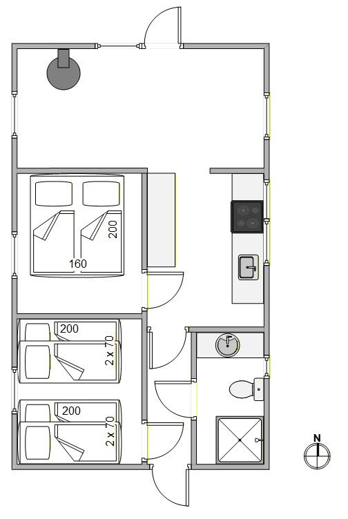 Huset har 2 soveværelser – et med dobbeltseng og et med 2 køjesenge til i alt 6 personer. Omkring huset er en fin træterrasse, så du i løbet af hele dagen kan finde et solrigt sted med læ for vestenvinden. Nye stilheden med vindens raslen i trætoppene, fuglesang og lad dine tanker få frit løb.