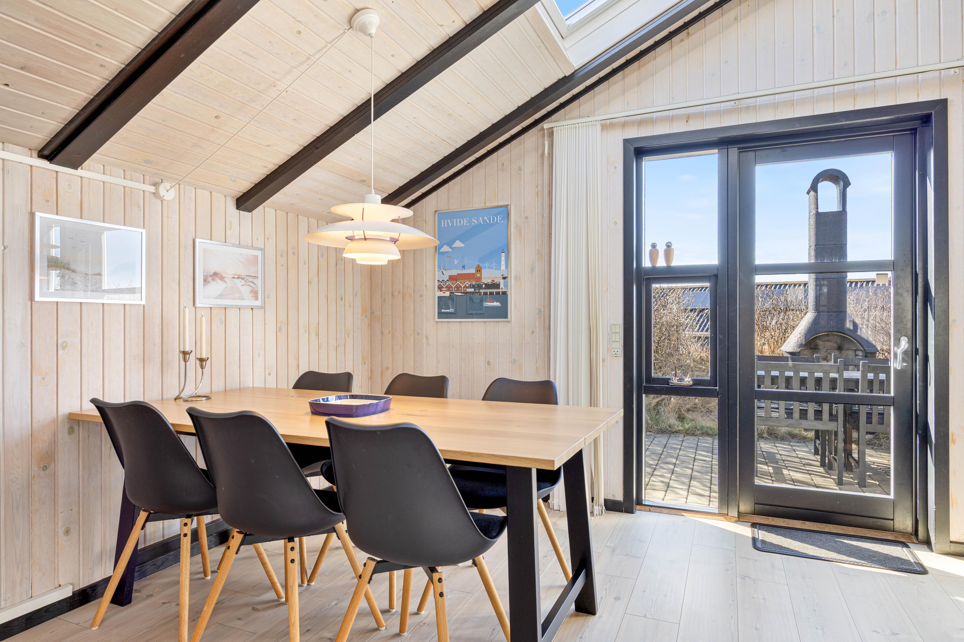 Rundt om sommerhuset er der flere dejlige terrasser med gode læforhold. Her står komfortable havemøbler, liggestole og en grill klar til hyggelige stunder under åben himmel. Mod syd findes en overdækket del, hvor du kan sidde ude selv på dage med lidt vind eller småregn. På toppen af klitten bag sommerhuset ligger en lille udsigtsterrasse, hvorfra du kan nyde panoramaudsigten over området, klitterne, heden og fjorden i det fjerne.