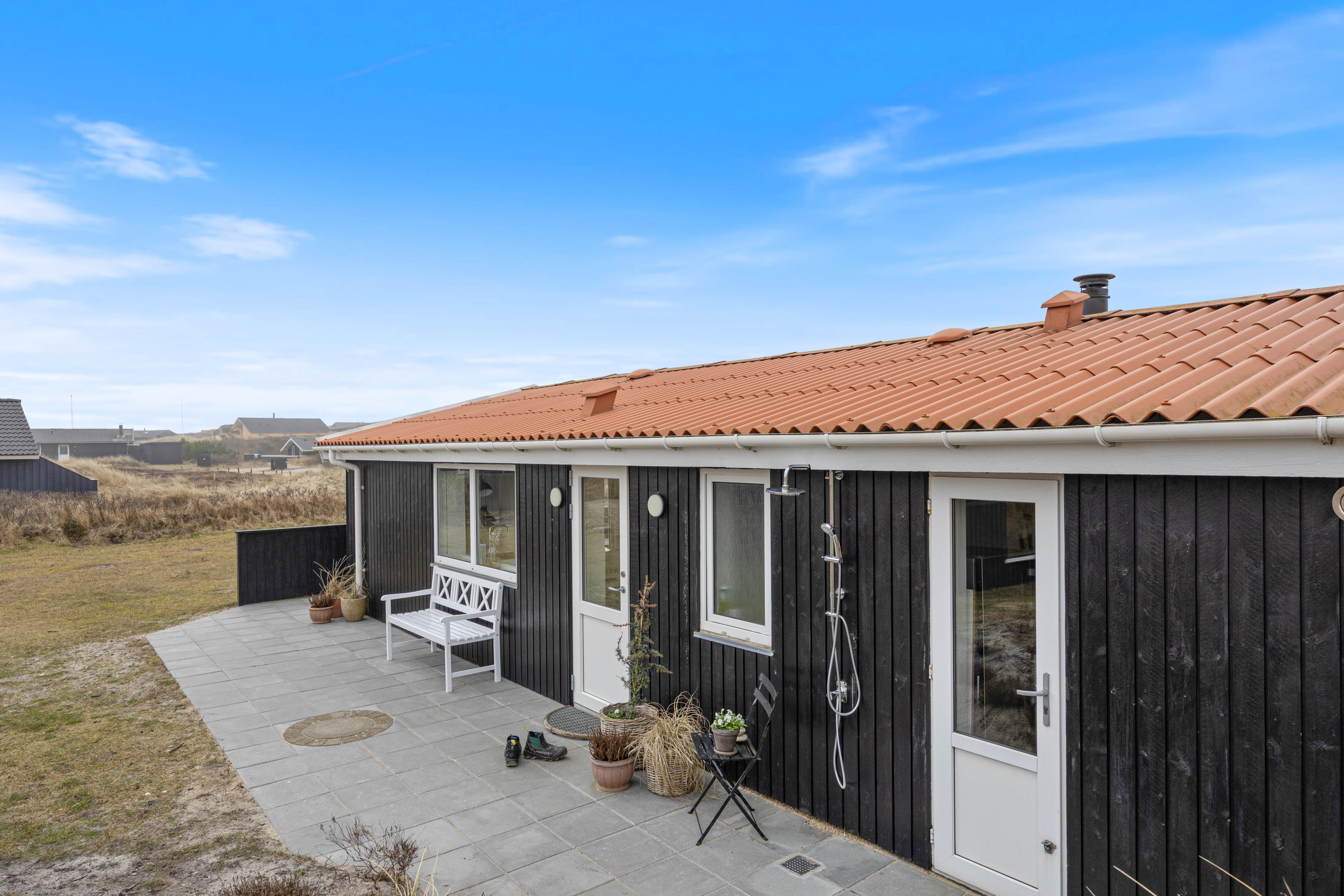 Med sine mange terrasser er sommerhuset også perfekt til udefolket – Mod øst finder I en lille og hyggelig morgenkaffe-terrasse, hvor I kan se solen stå op over Ringkøbing fjord, mens I nyder en kop kaffe.