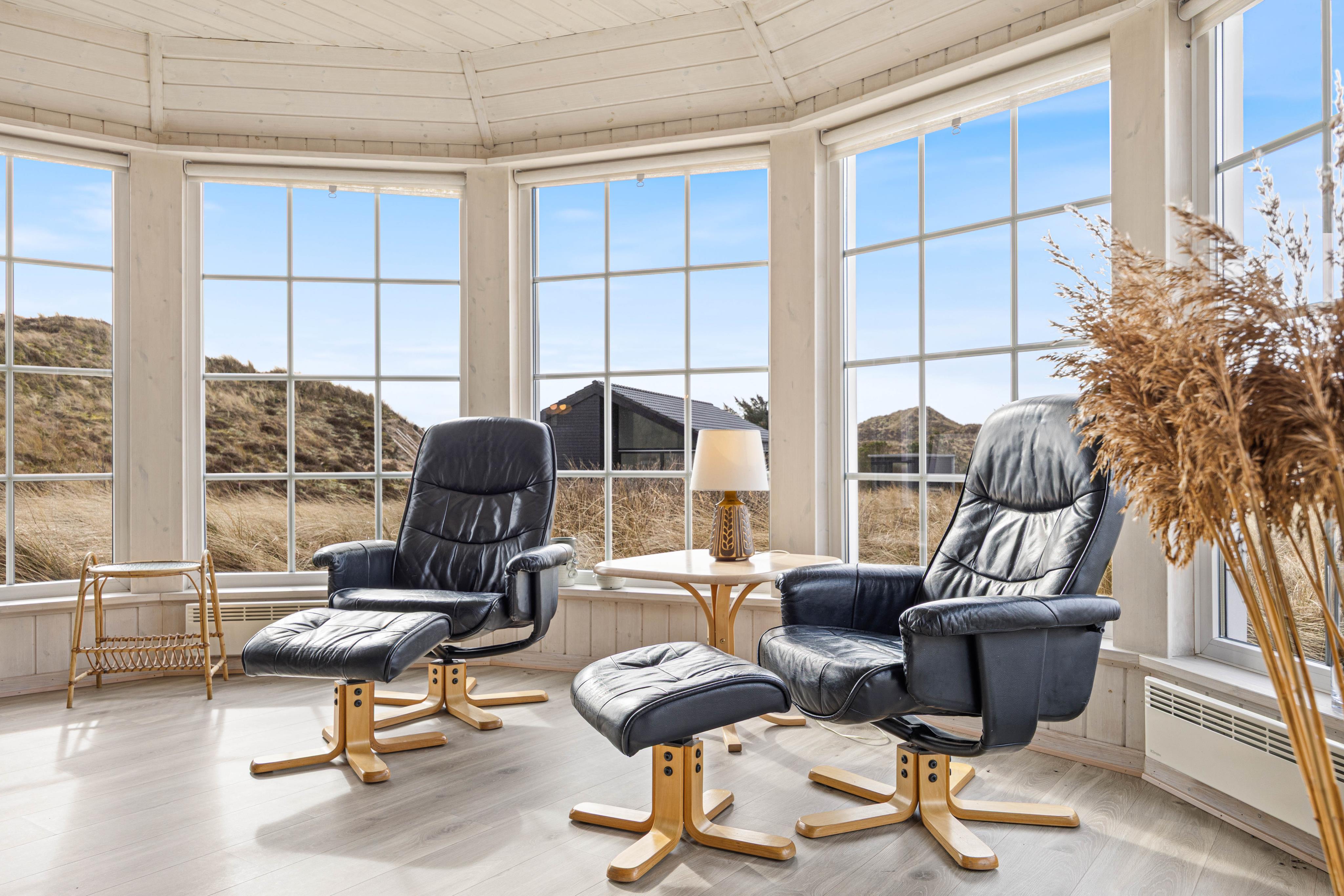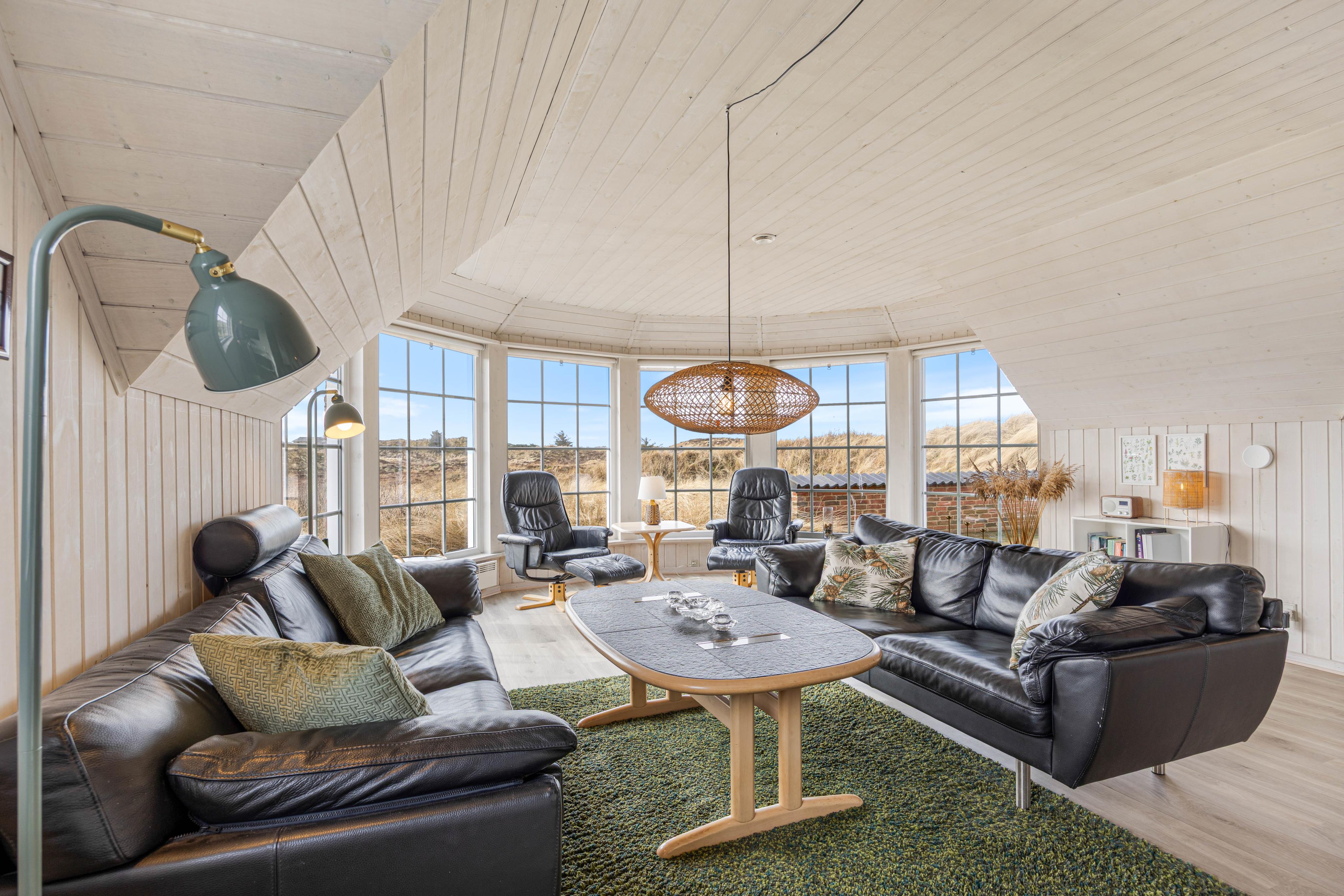 Her har I et feriehus, som er flot og indbydende inde såvel som ude. Der er en dejlig stue med store vinduer, der giver et godt lysindfald og mulighed for at nyde udsigten over naturgrunden.