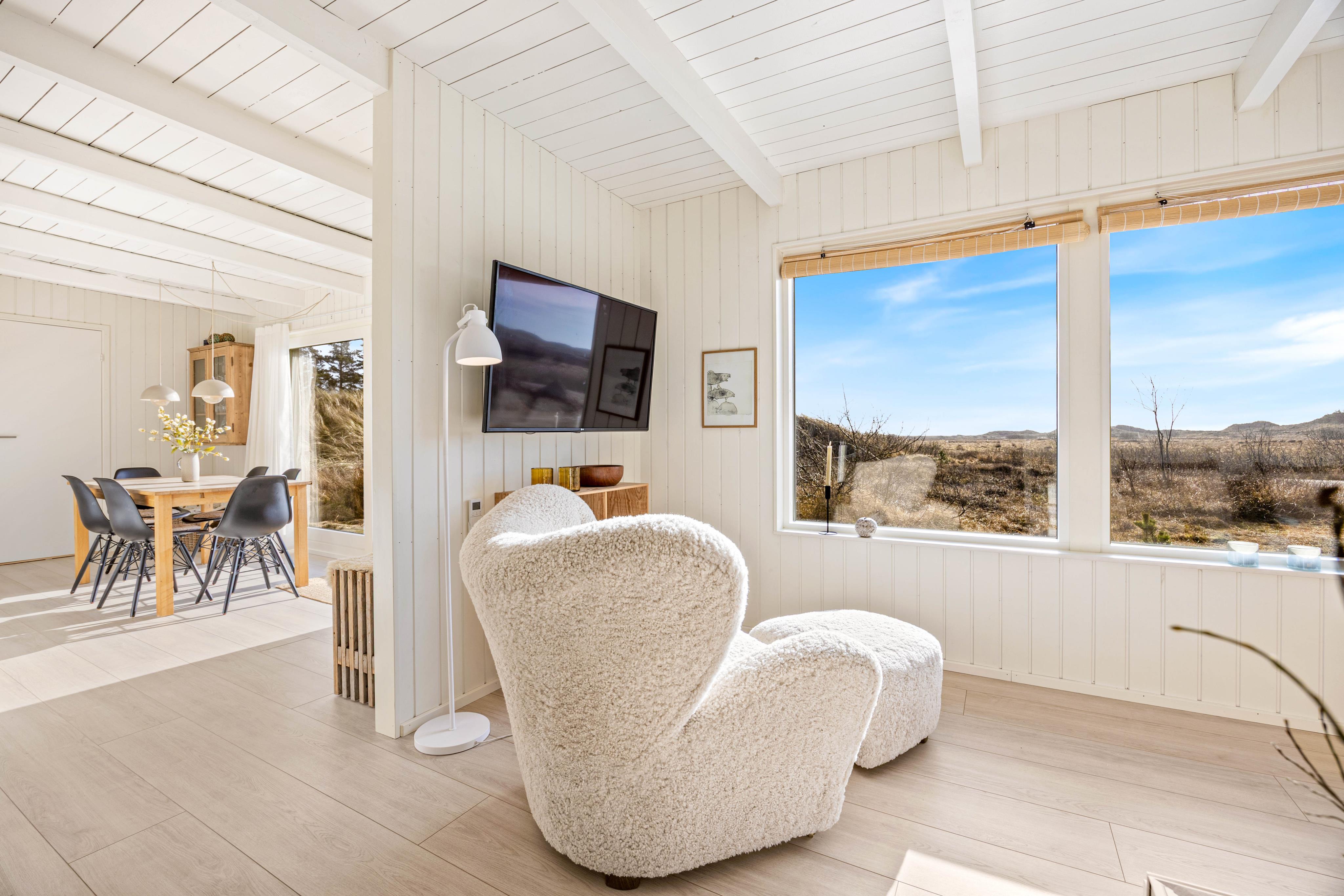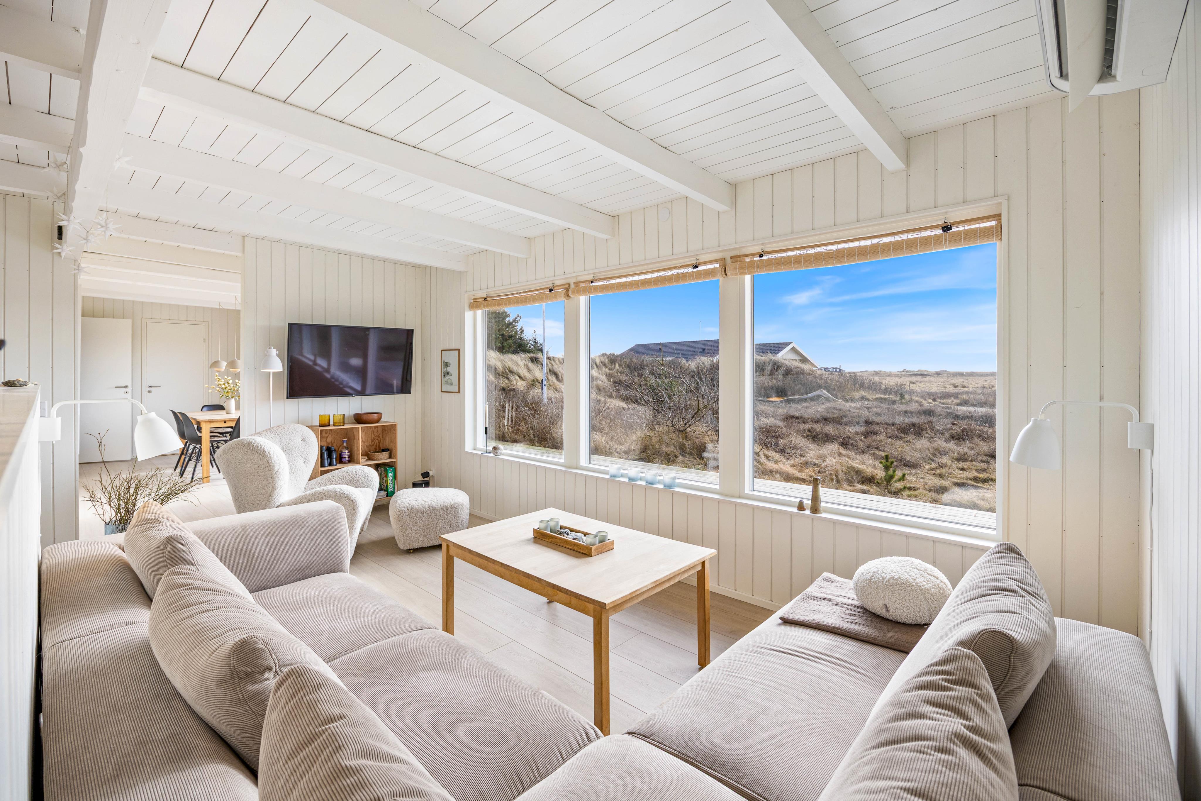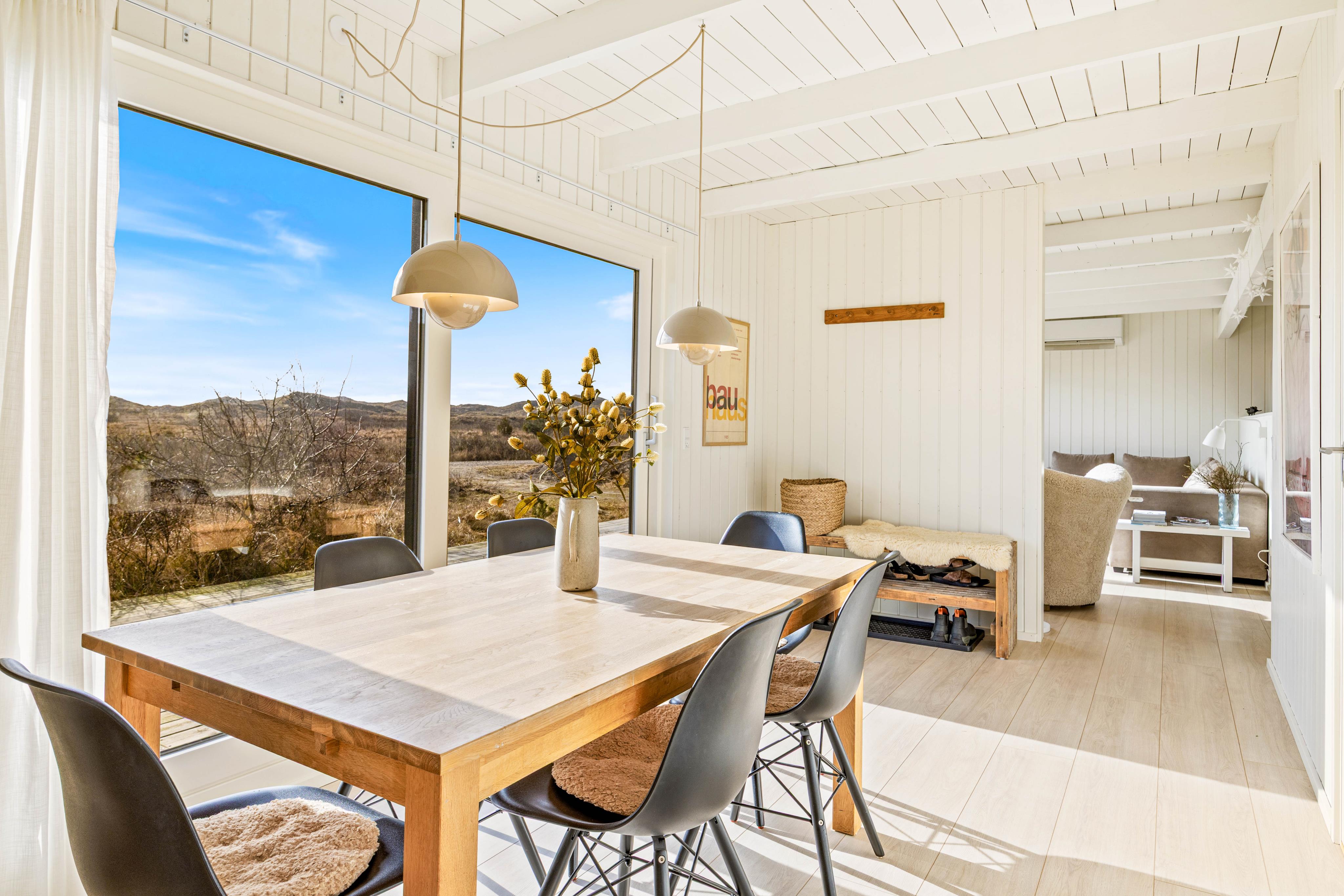 Hjerterummet er alrummet, der kombinerer køkken, spiseplads og stue. Her er lagt op til mange hyggelige stunder i familiens selskab. I sofahjørnet kan I smide fødderne opad med en god bog og en varm kop kaffe, og efter aftensmaden kan I tage en runde kortspil rundt om spisebordet. Både her og i fordelingsgangen foran værelserne kan I kigge ud over det smukke kuperede klitlandskab, der præger området.