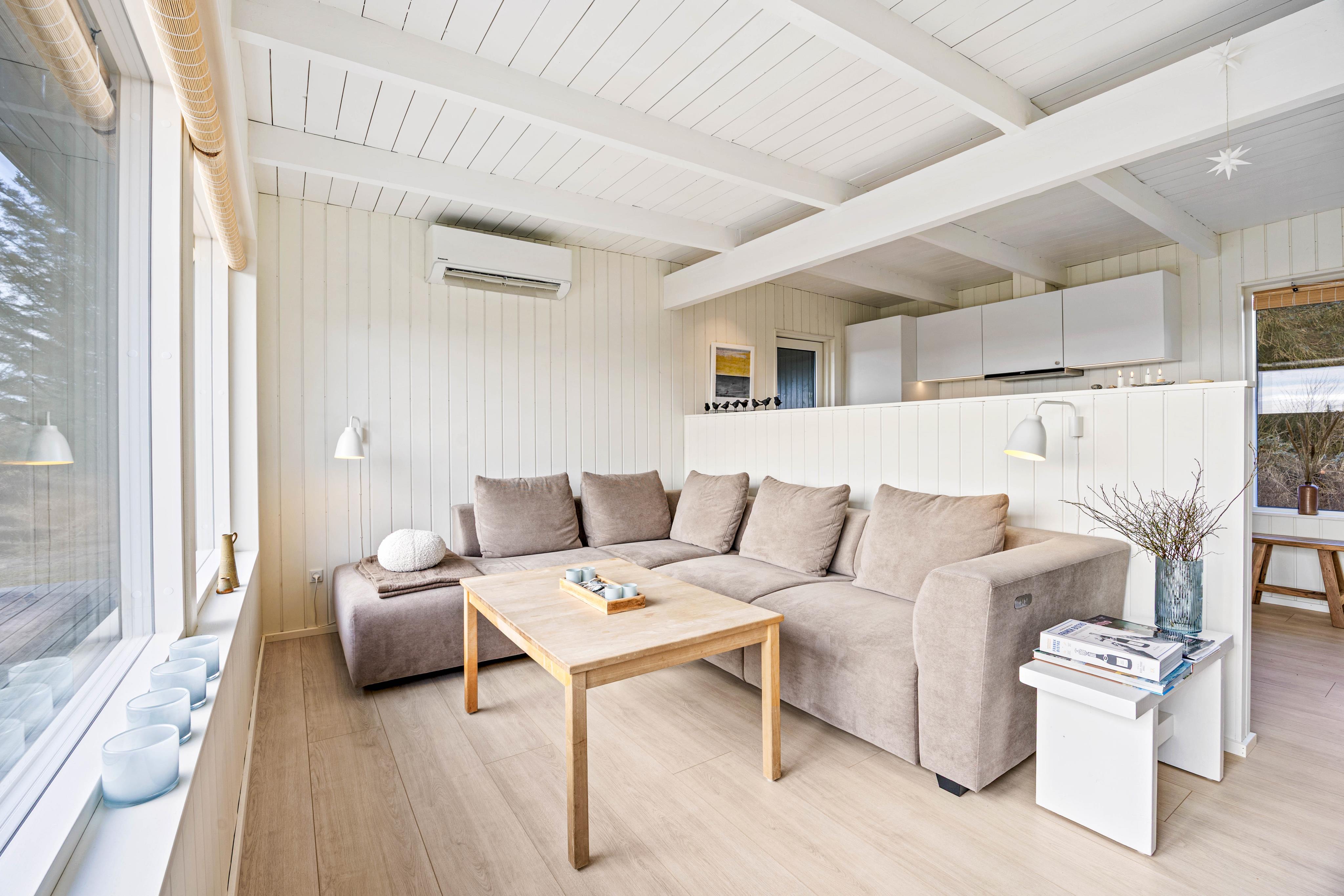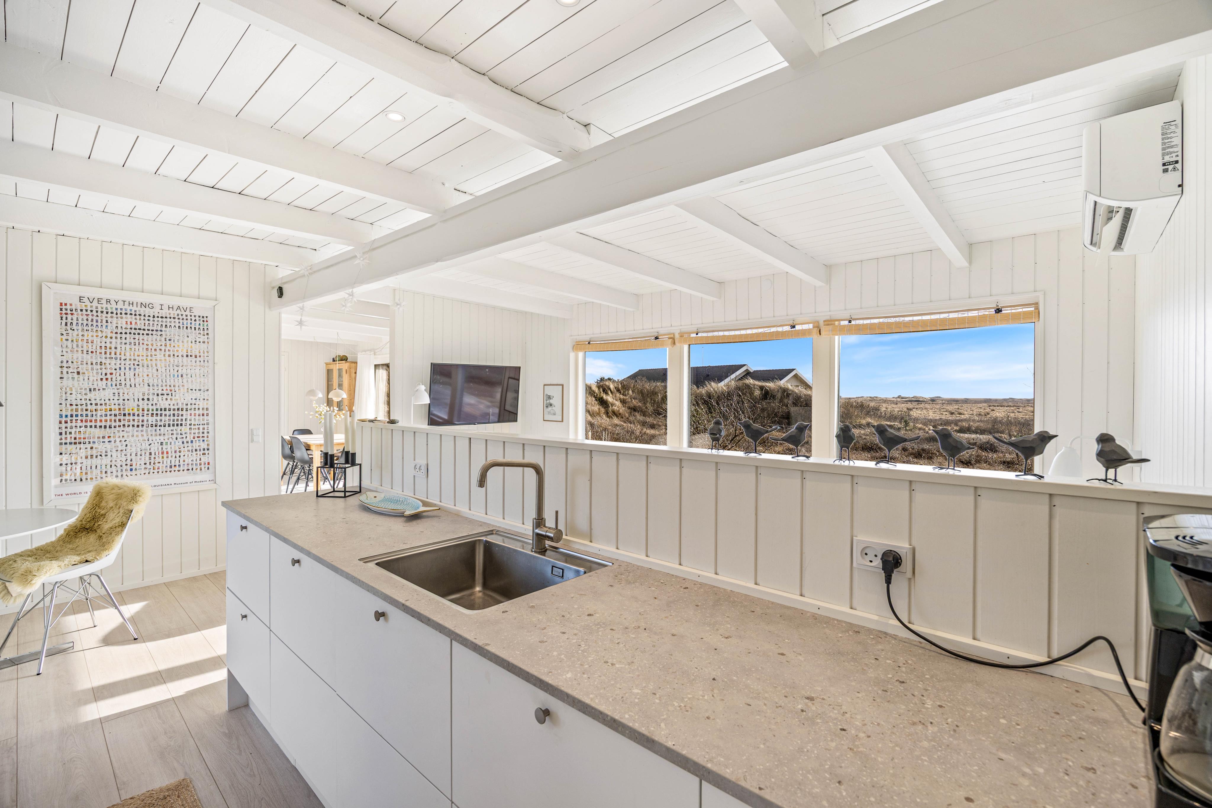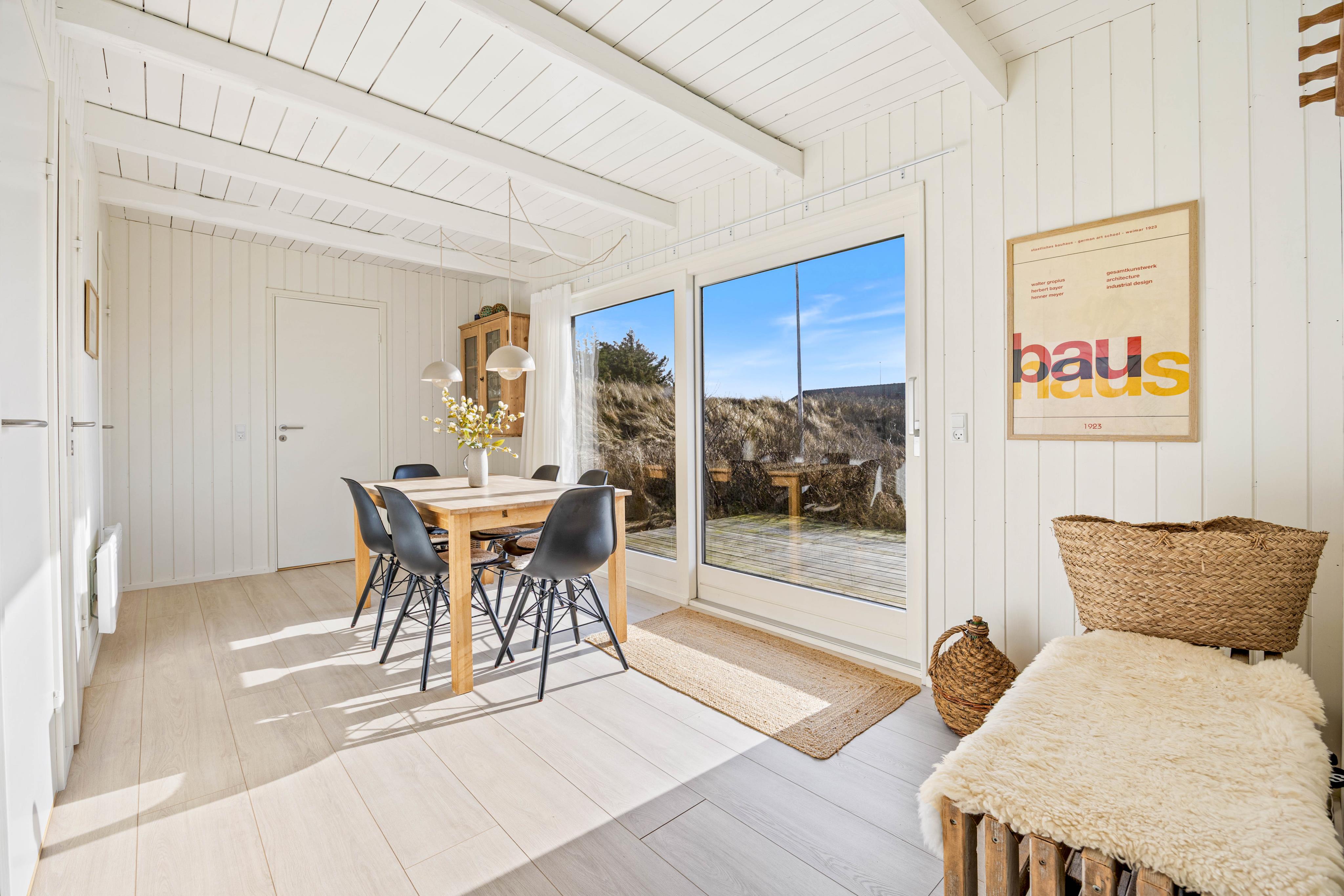 Hjerterummet er alrummet, der kombinerer køkken, spiseplads og stue. Her er lagt op til mange hyggelige stunder i familiens selskab. I sofahjørnet kan I smide fødderne opad med en god bog og en varm kop kaffe, og efter aftensmaden kan I tage en runde kortspil rundt om spisebordet. Både her og i fordelingsgangen foran værelserne kan I kigge ud over det smukke kuperede klitlandskab, der præger området.