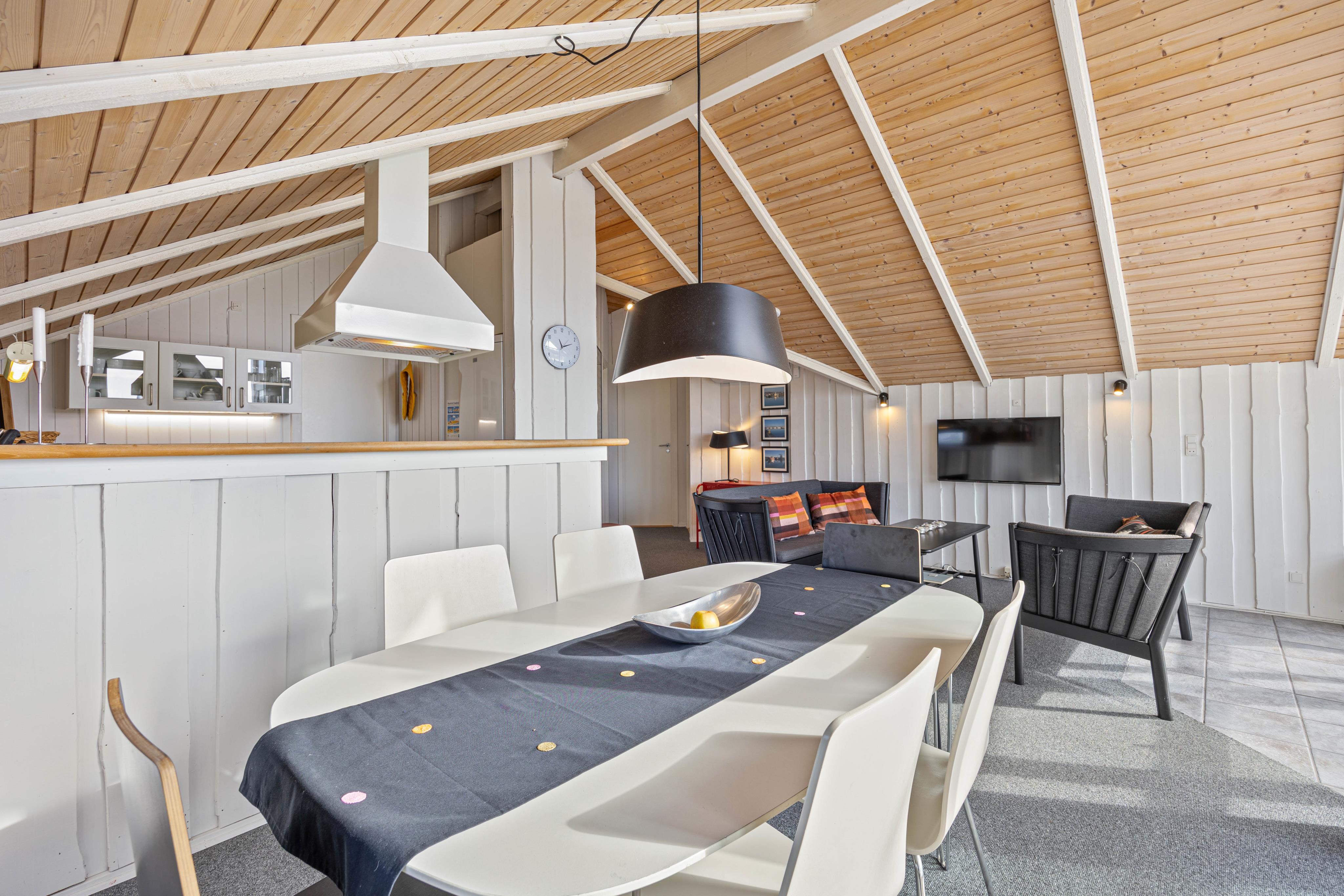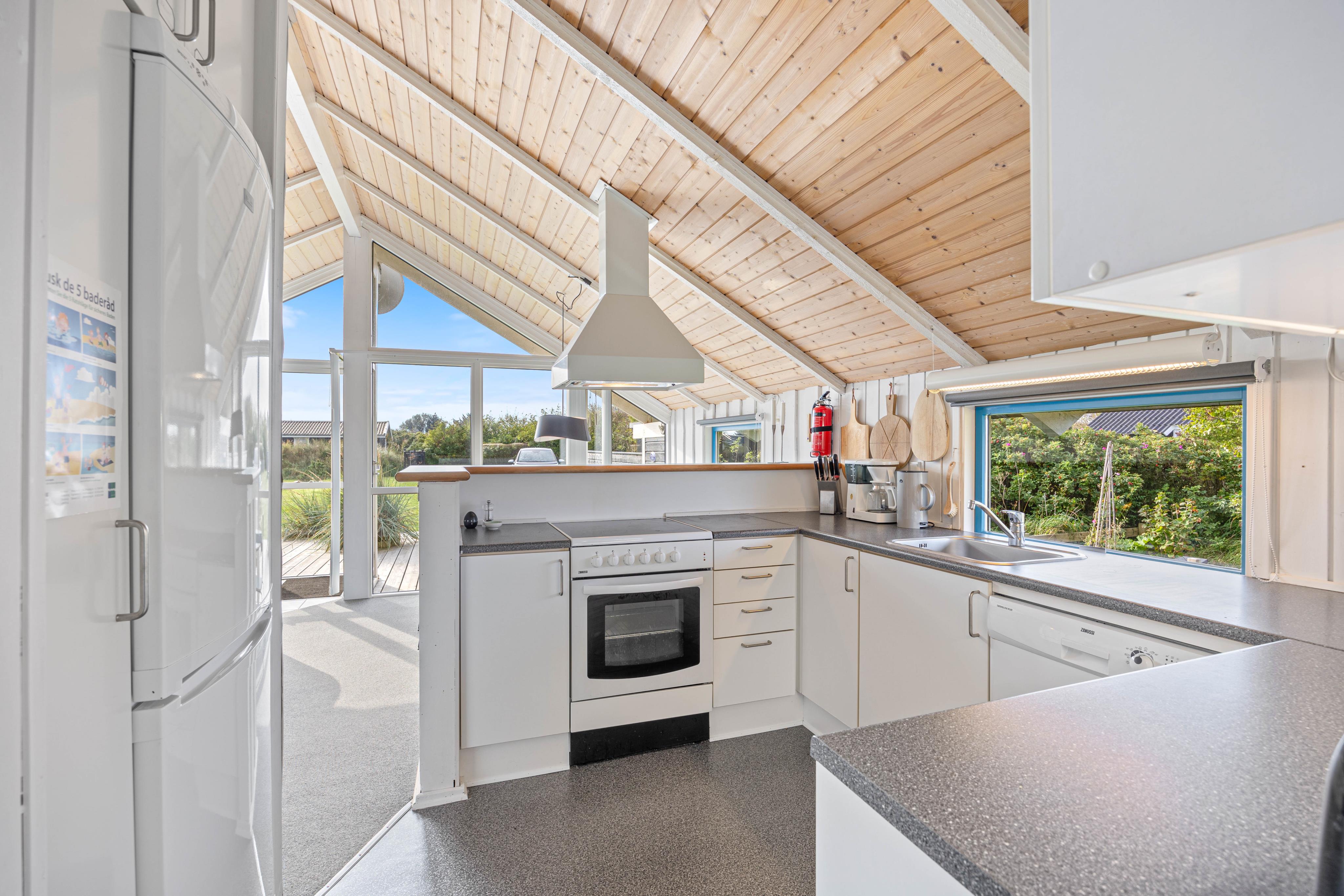 Feriehuset indbyder til en dejlig, afslappende familieferie. Køkkenet ligger i åben forbindelse med stuen og spisestuen og her kan familien være tæt sammen, også når du forbereder en lækker aftensmad. I køkkenet finder du opvaskemaskine og mikroovn samt en separat fryser (80l).