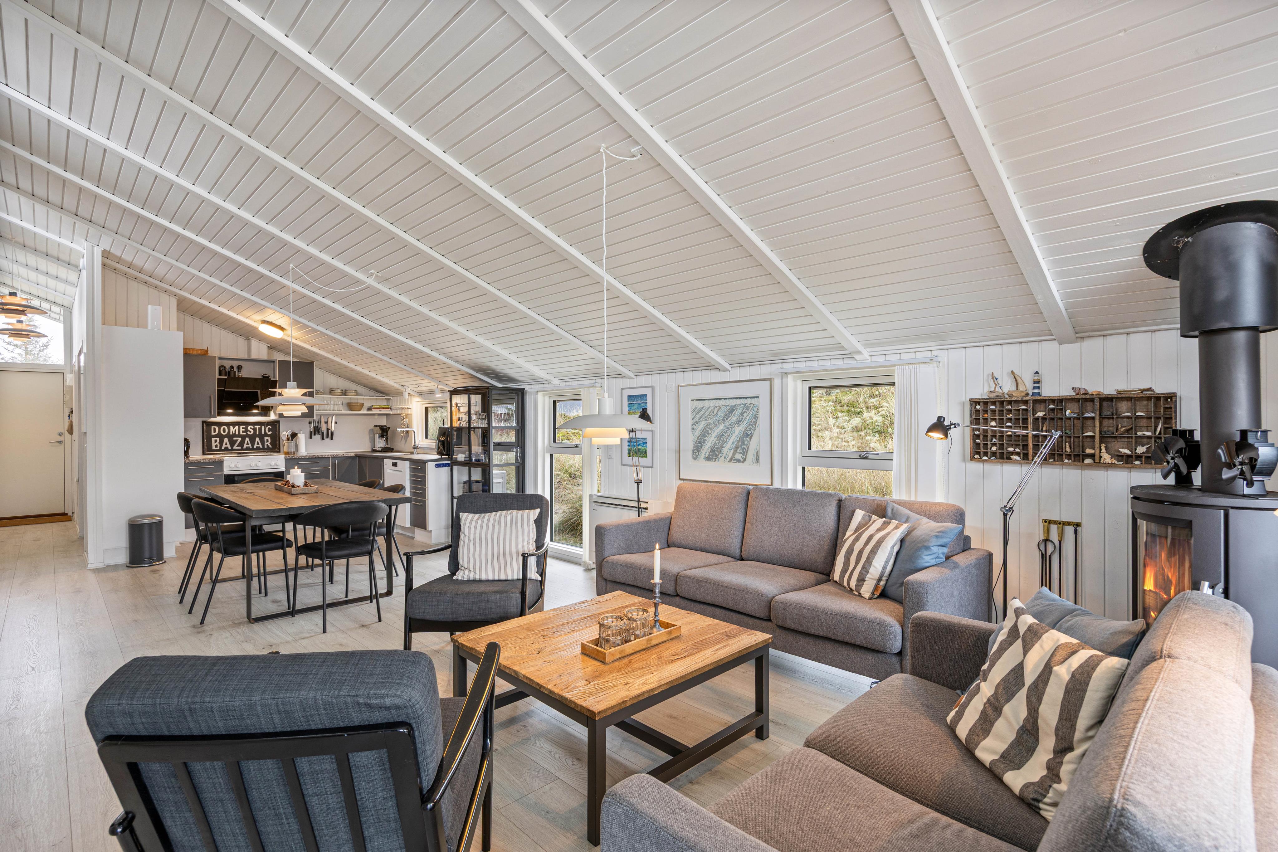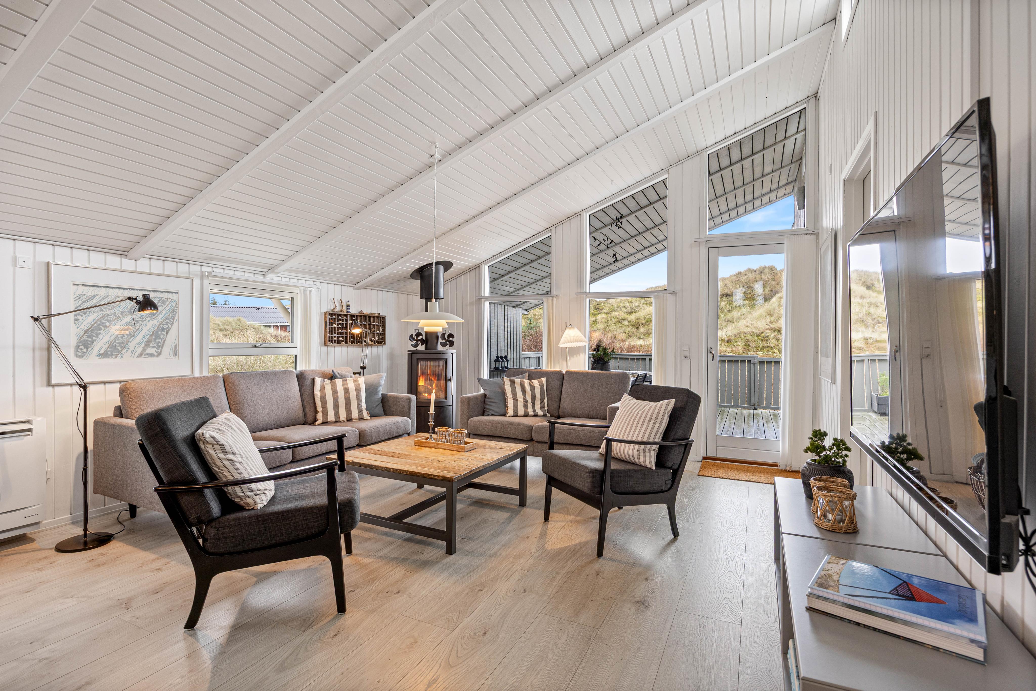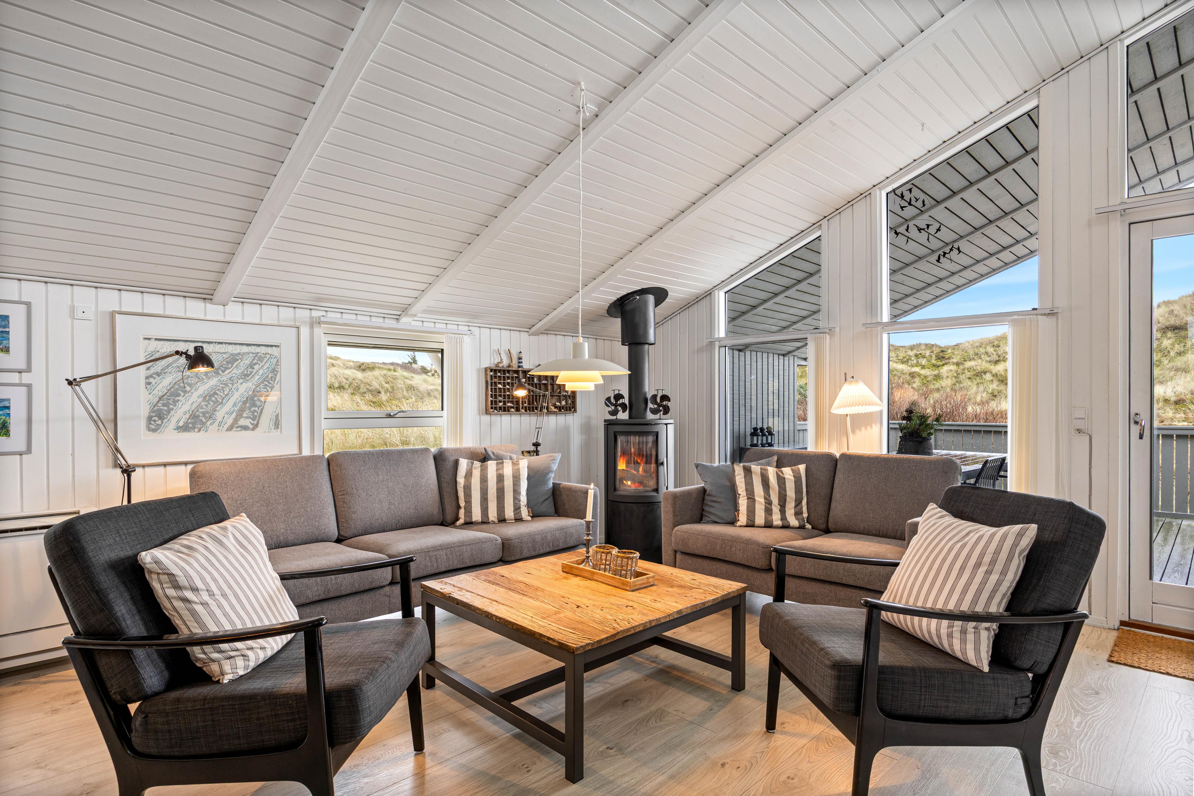 Et lyst, venligt og meget smagfuldt indrettet sommerhus. Indretningen er moderne og af høj kvalitet. En meget god beliggenhed, midt i klitterne. Særligt dejligt er den store terrasse med liggestolene.