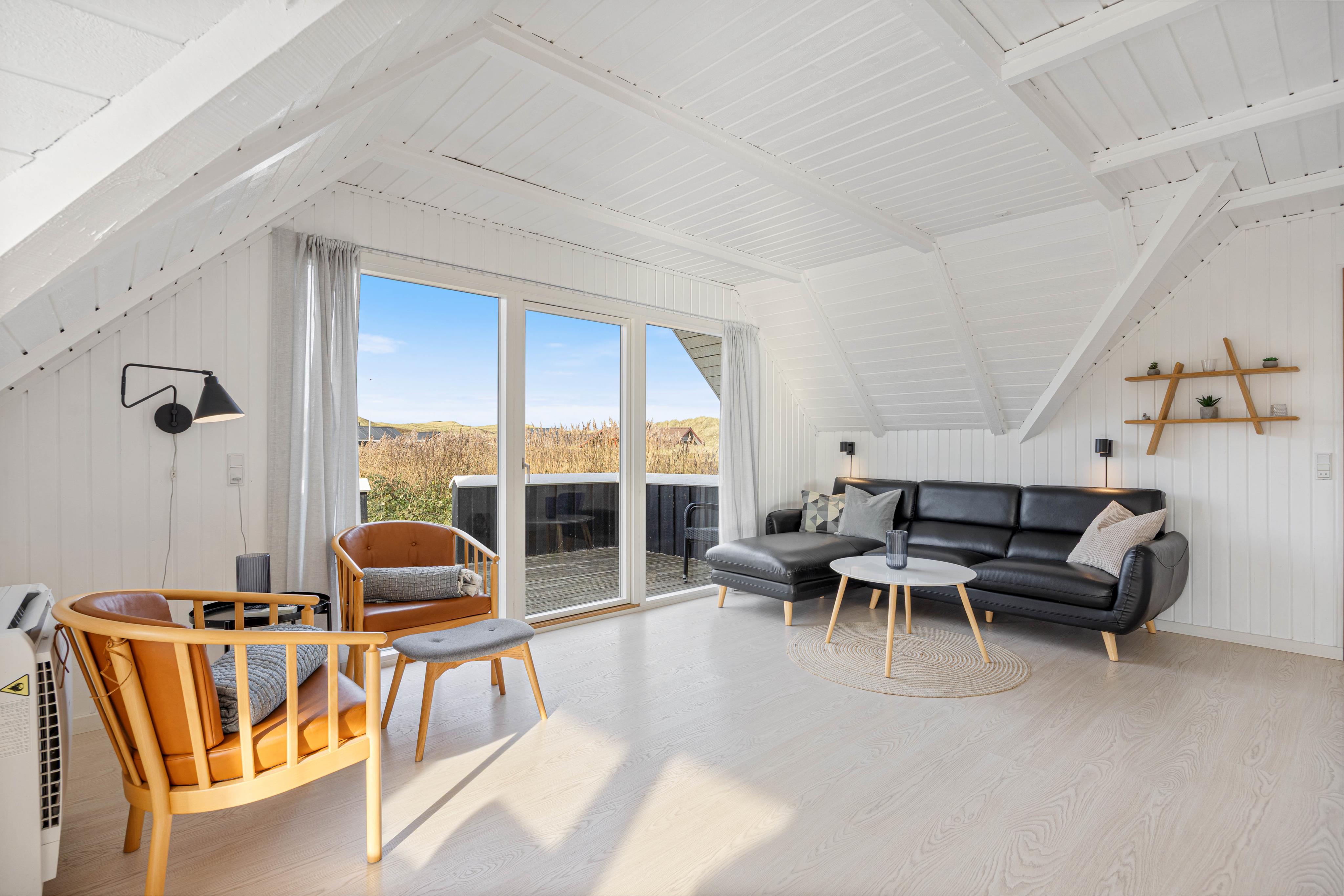 Et smukt beliggende sommerhus midt i klitterne. De to terrasser er perfekte til allerede at kunne nyde de første solstråler. Huset er så lyst, at man ikke behøver tænde lys, selv i tåget vejr. Det er fantastisk, at vinduerne til begge terrasser kan åbnes vidt og døren endda kan fastgøres, så den ikke blæser i, når det blæser.