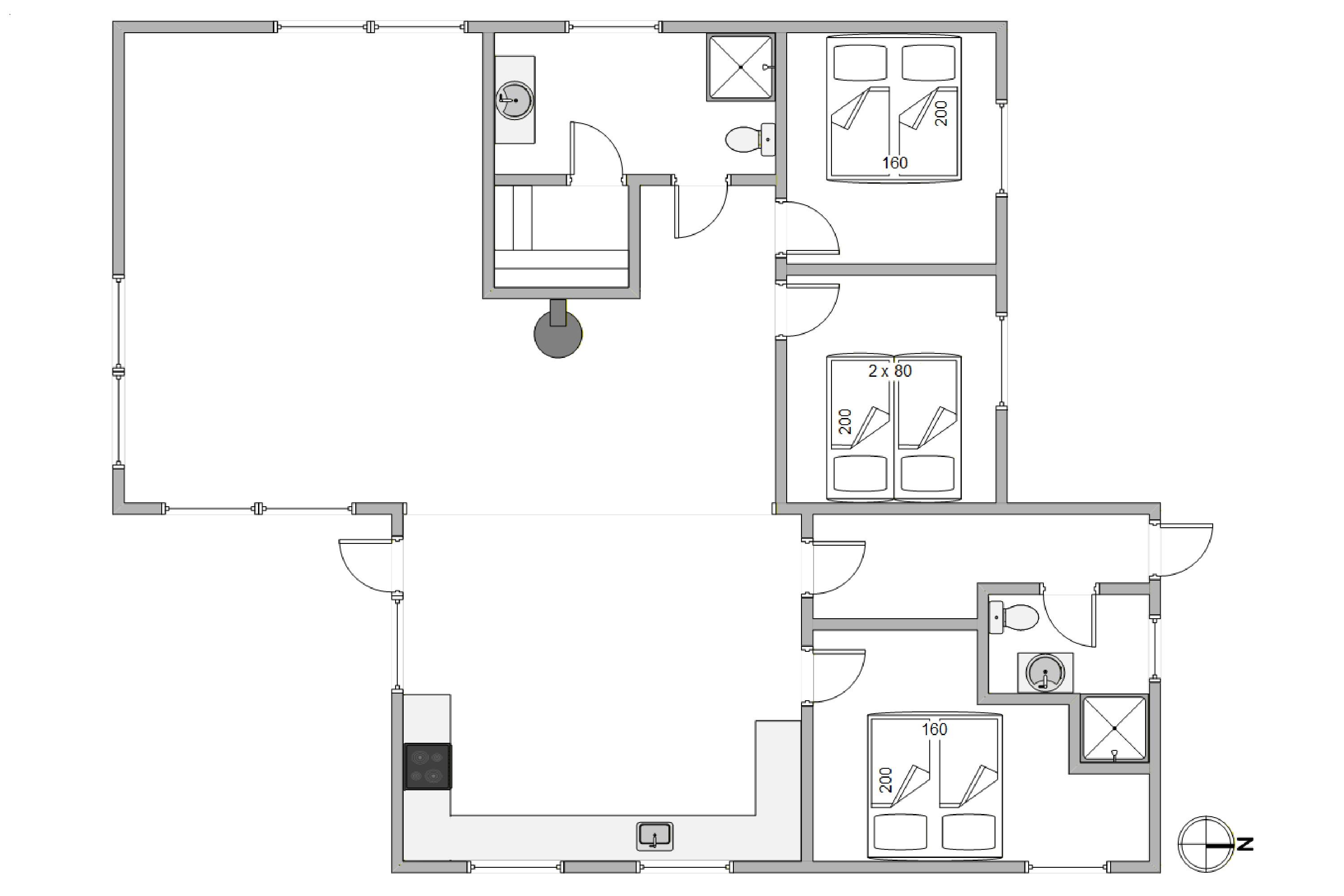 Der er 3 soveværelser i huset, hvor de 2 har hver en dobbeltseng, og det sidste værelse har 2 enkelte senge. Der er 2 badeværelser, begge med gulvvarme og bruseniche. Fra det store badeværelse er der adgang til en dejlig stor sauna, hvor man rigtig kan slappe af og lade sig gennemvarme. I entreen bag et par skydedøre, finder I vaskemaskine og tørretumbler, så man kan pakke let og vaske undervejs.