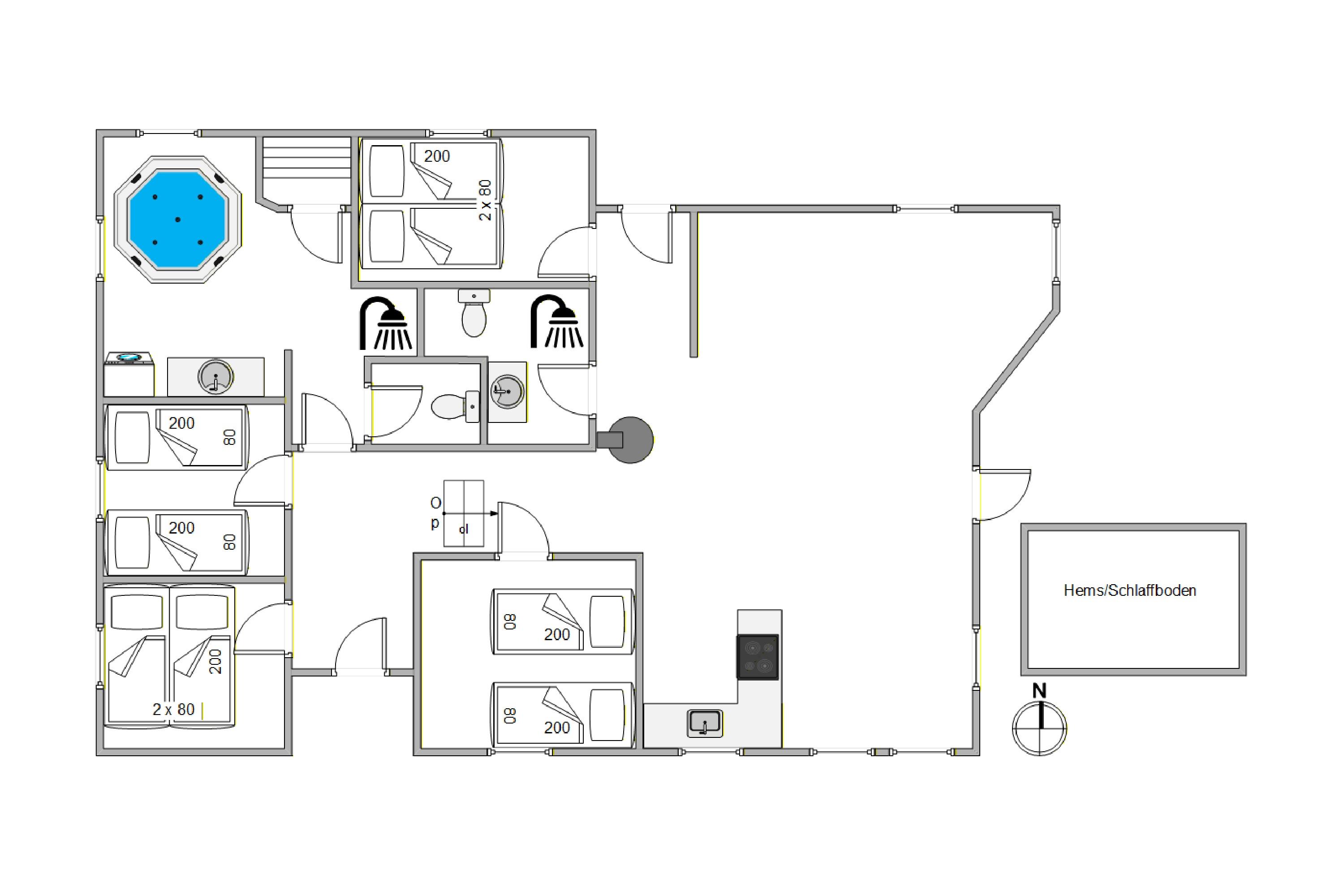 Feriehuset ligger i første klitrække og har endda udsigt over fjorden. Det er omgivet af terrasser på alle sider og tilbyder dermed altid en vindtæt siddeplads. Opdelingen af soveværelserne er så godt gennemtænkt. Det store badeværelse med den store spabad og sauna er særligt bemærkelsesværdigt. Alt i alt er det et meget hyggeligt hus, med fremragende faciliteter og i en fremragende beliggenhed.