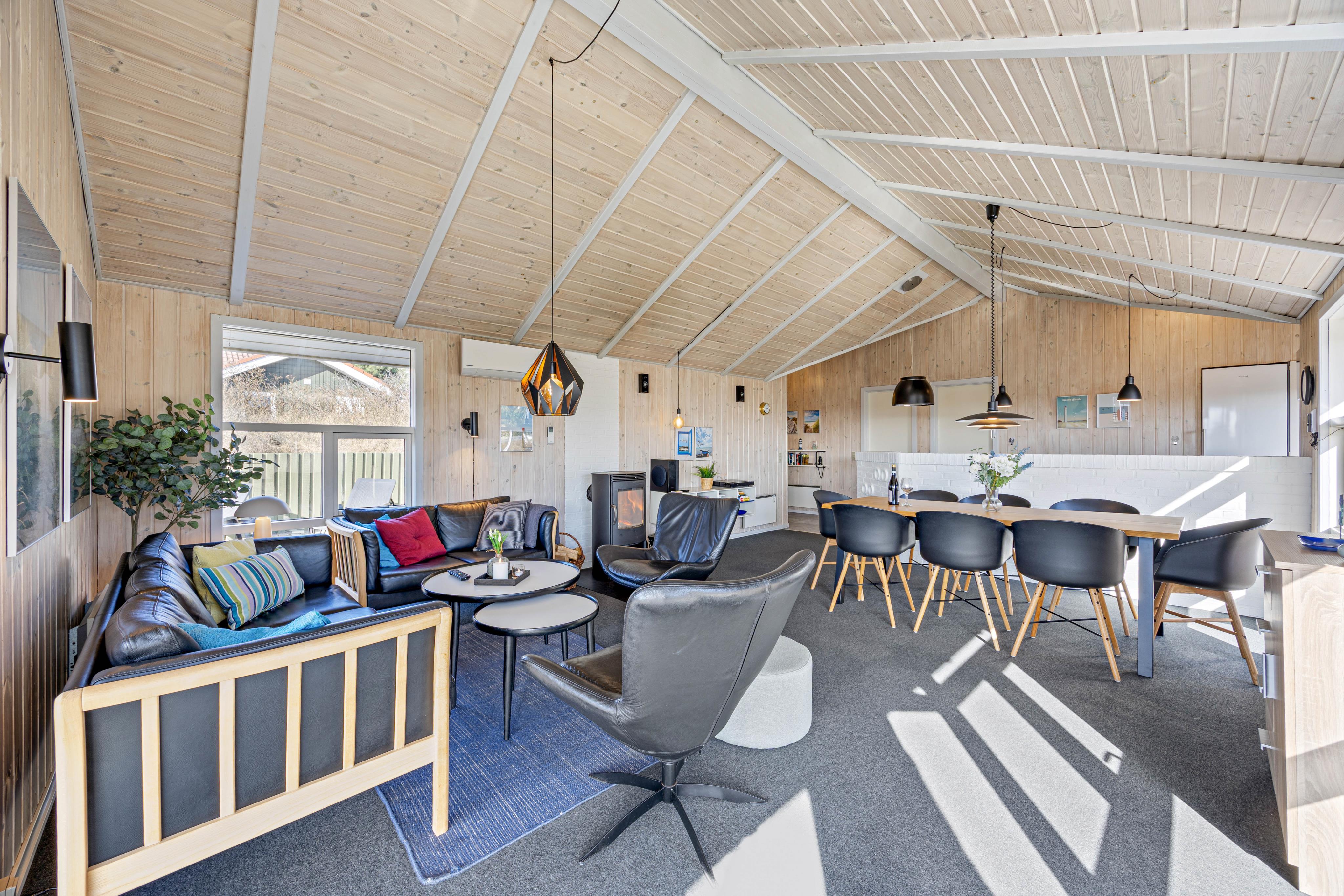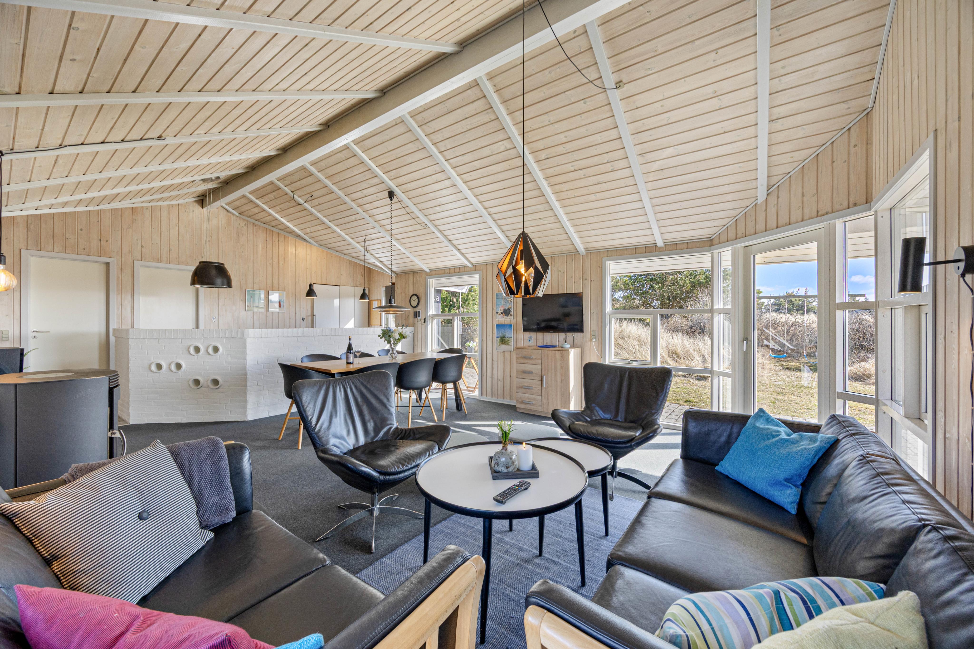 Indenfor er indretningen af det 98 m2 store feriehus holdt enkelt og lyst. Den store stue, der har loft til kip, ligger i åben forbindelse med feriehusets køkken. De primære materialer i indretning er holdt i træ i lette, lyse farver. Det skaber en hyggelig og indbydende indretning med en god sommerhusånd.