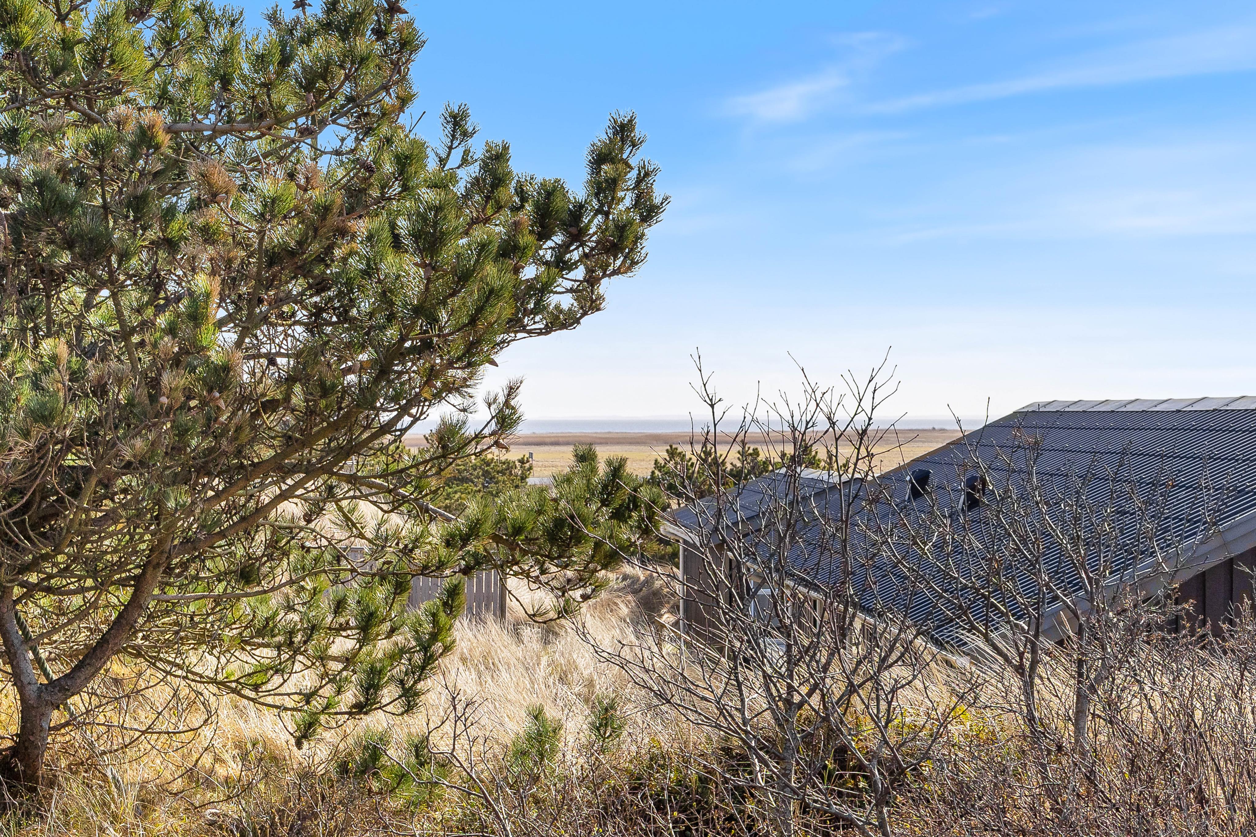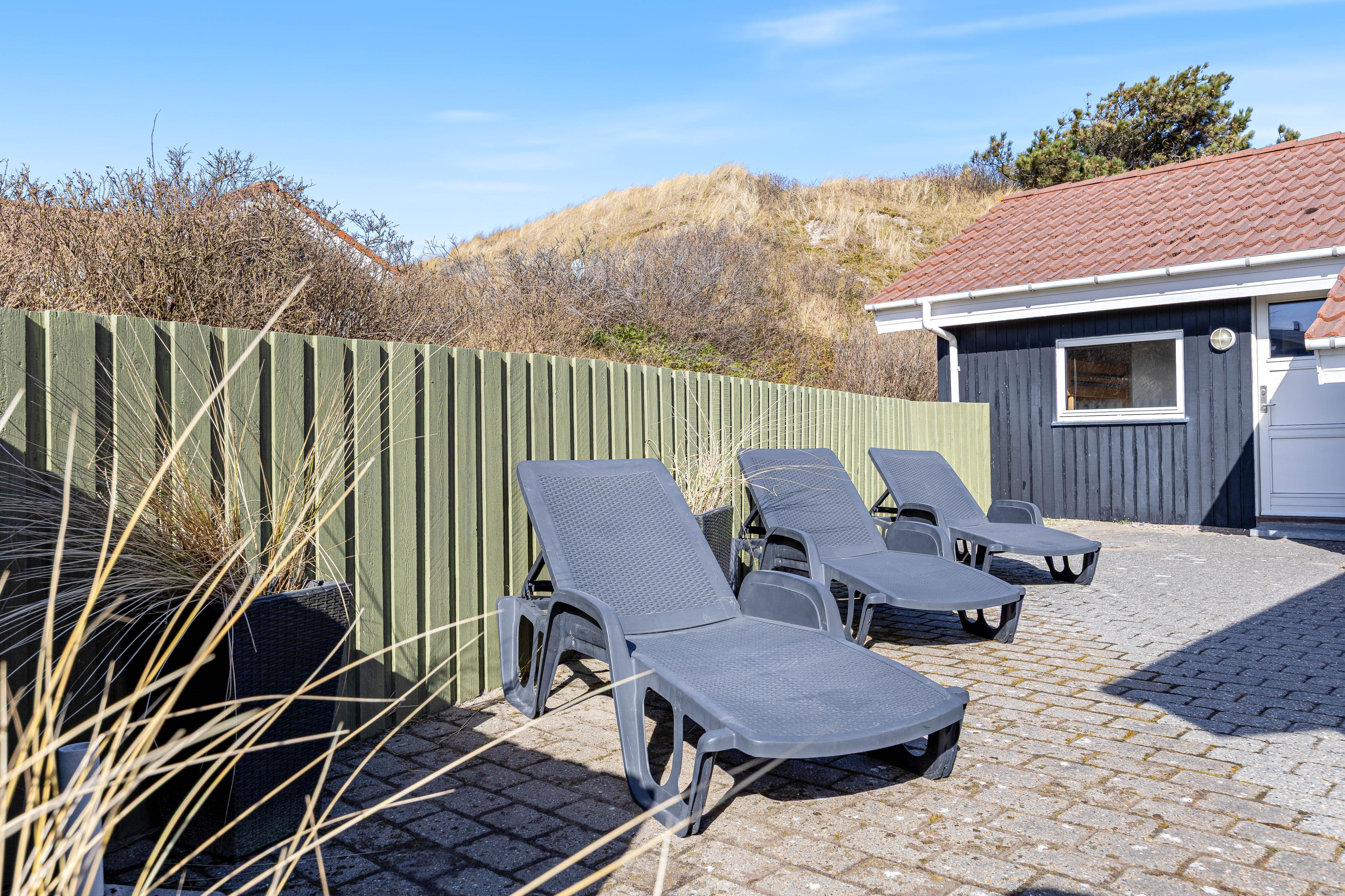 Feriehuset ligger midt i det flotte klitlandskab i Årgab. Det betyder, at du både inde og ude kan mærke det landskab, der omgiver feriehuset. De store glaspartier i spise- og opholdsstuen skaber en fornemmelse af at sidde tæt på klitterne. Det samme gælder, når du bevæger dig ud på terrassen. Herude er der frit udsyn til himlen og de svejende marehalm. Den delvist overdækkede terrasse holder på varmen, og i ydersæsonerne forlænger det fornemmelsen af sommer, mens det midt på sommeren giver skygge for solens stråler.