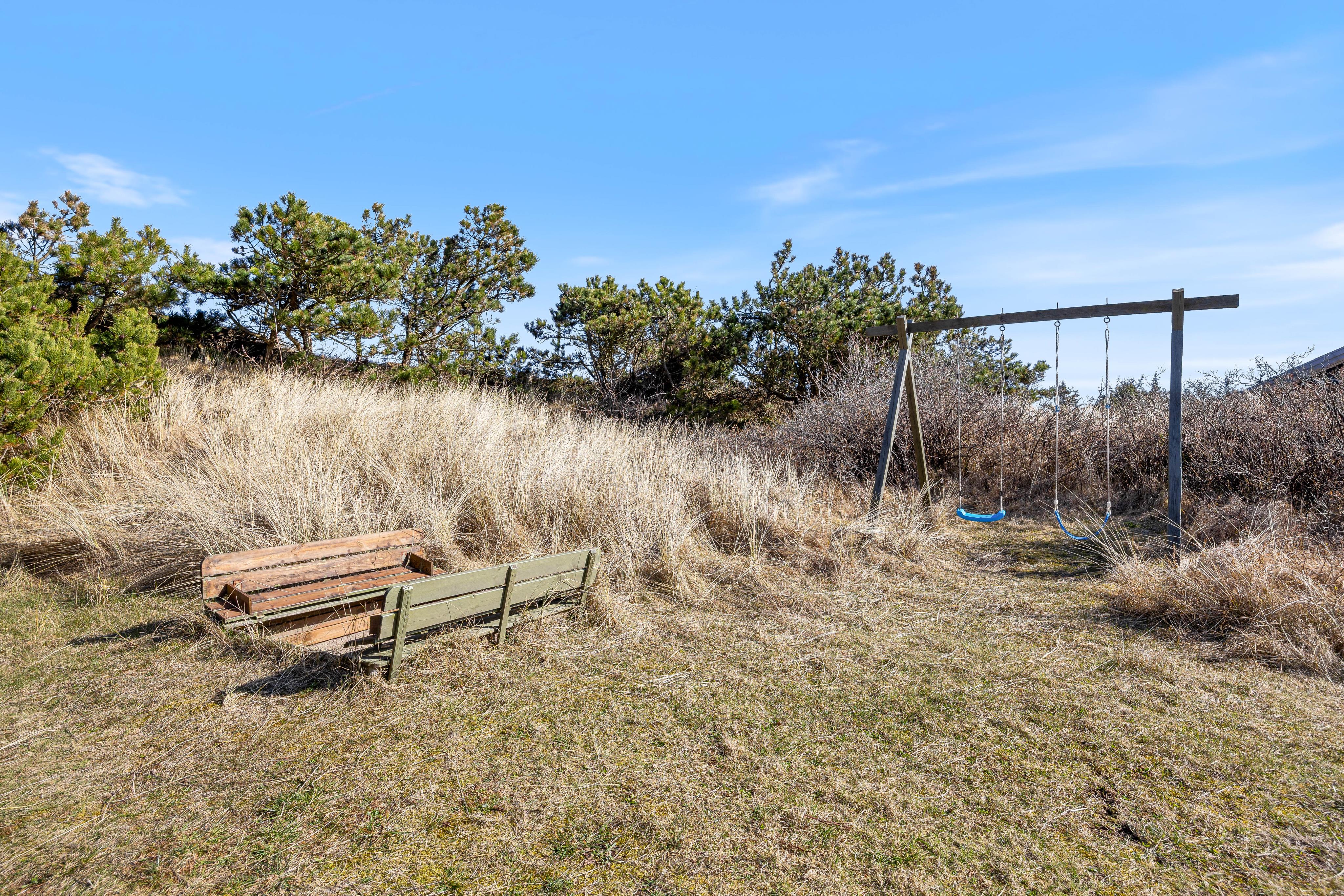 Til uderummet hører også et gyngestativ og en sandkasse. Det giver børnene mulighed for at fordybe sig i leg, mens du sidder på terrassen og nyder ferien.